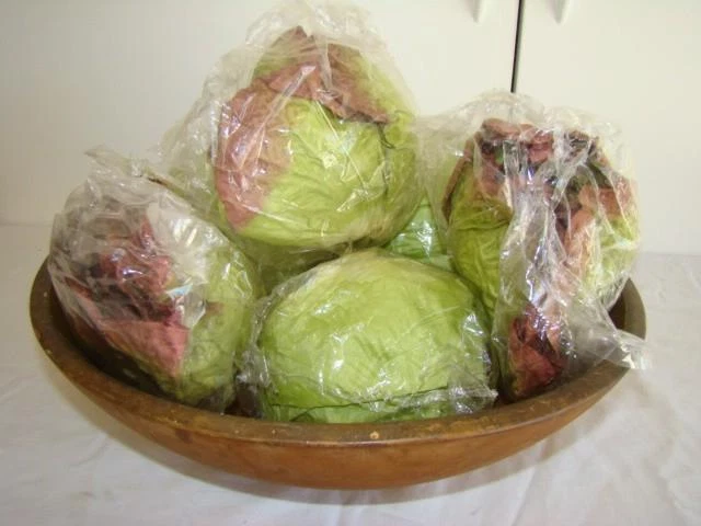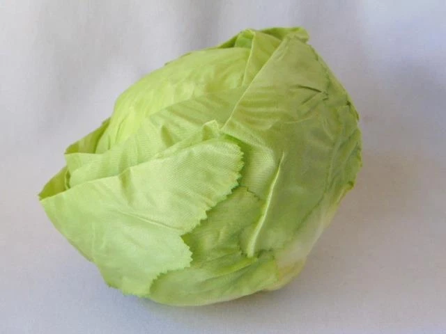 Realistic LETTUCE CABBAGE HEAD, Grocery Store Display, Food Replica, 1990s Realistic LETTUCE CABBAGE HEAD, Grocery Store Display, Food Replica, 1990s Click images to enlarge Description VINTAGE DISPLAY FAUX CABBAGE LETTUCE Fun and realistic vintage faux lettuce or cabbage head, measuring about 5-1/2" in size. Featuring a food prop, this was purchased in the 1990s for use in my general store display - so realistic stacked with other similar fake fruits and veggies. Sold through the SILK GARDEN SHOP and made in Thailand, I will include the original cellophane wrapper. Head is made of a silk or rayon blend to mimic the sheen and pliability of leaves. Designed into a tight ball, I'm guessing this is a cabbage - even the underside is toned to resemble how a head would have been cut from the ground. This has been stored in the bag for years - no smell to the cabbage, but the cellophane has a slight plastic scent. Fun addition to any display or staging! If questions, please contact me - thanks! Images sell! Get Supersized Images & Free Image Hosting Create your brand with Auctiva's Customizable Templates. Attention Sellers - Get Templates Image Hosting, Scheduling at Auctiva.com. Track Page Views With Auctiva's Counter