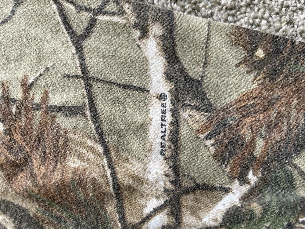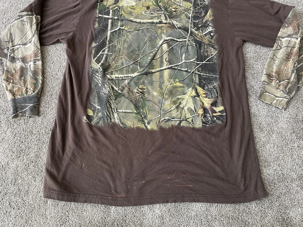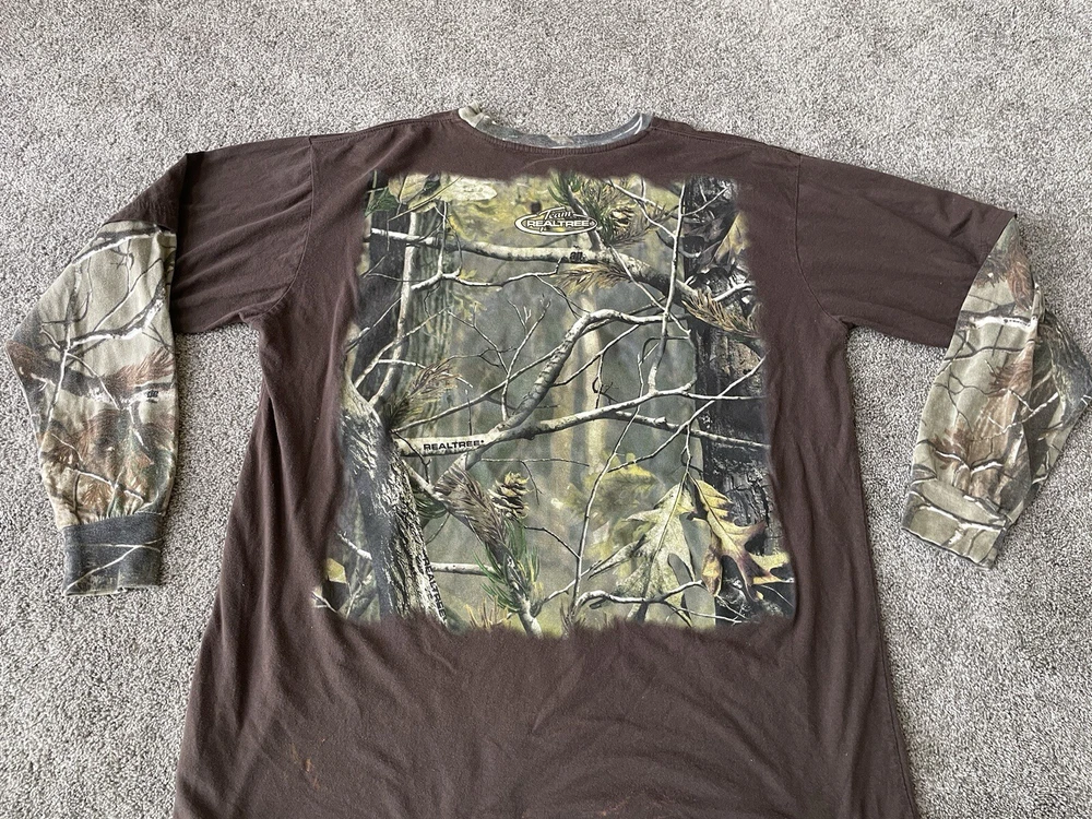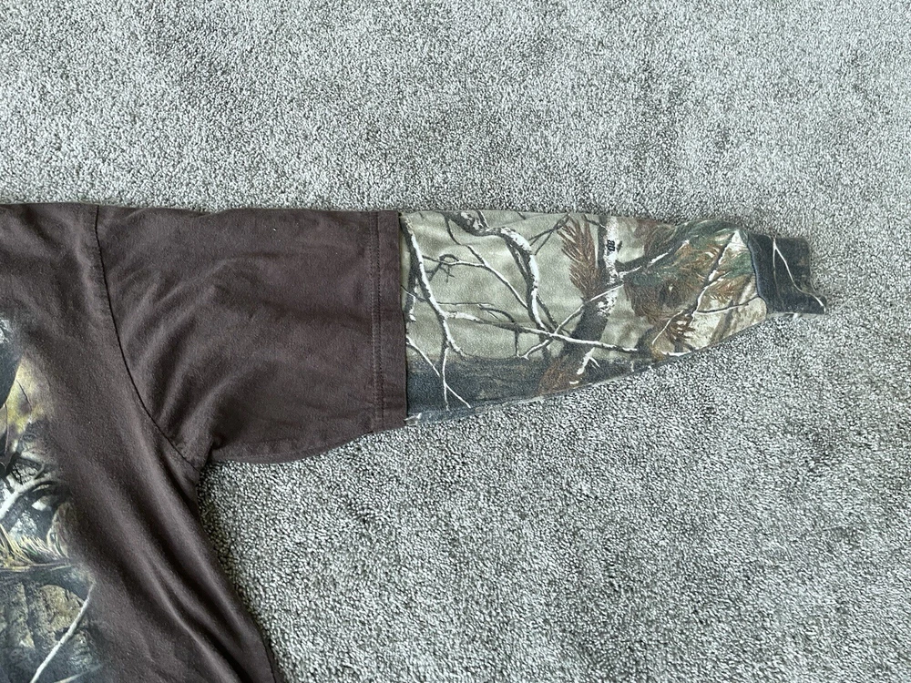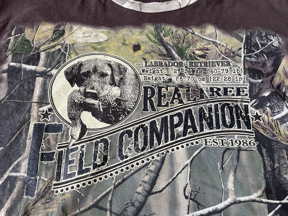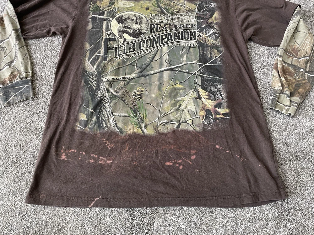 Get ready to hit the great outdoors with this Realtree Camo Shirt in size XL. The shirt features a Camouflage pattern with a Woodland Team Real Tree Labrador Dog theme, perfect for any nature or outdoor lover. The Long Sleeve shirt has a Crew Neckline and a Regular fit, making it comfortable and easy to wear in any season. Made from a knit fabric type, this T-Shirt is easy to care for and machine washable. The shirt also features a Double-Sided design with the Realtree logo accents. Whether you're going on a hike or just taking a walk in the park, this shirt is perfect for you.