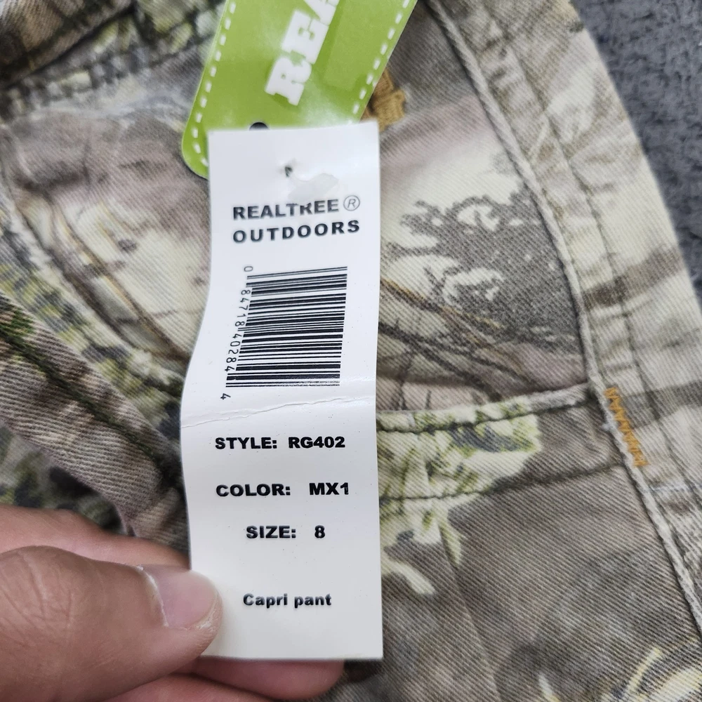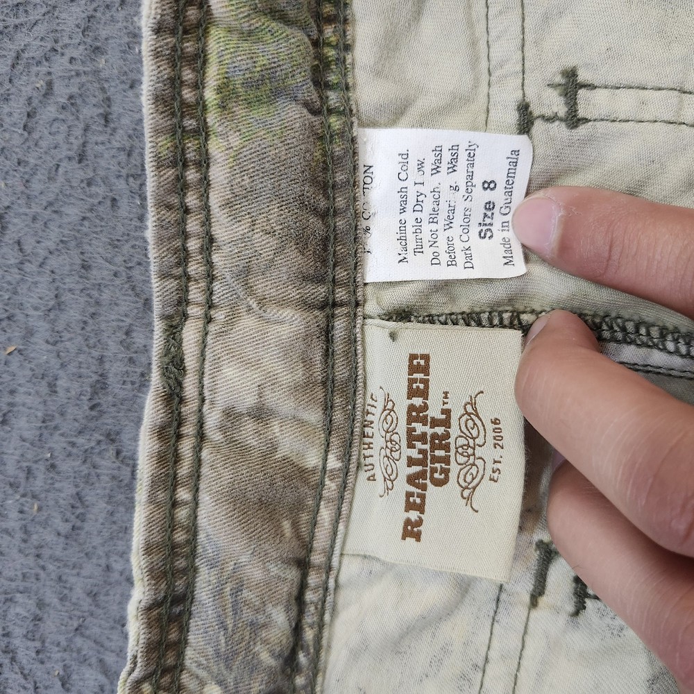 Realtree Girl pants in girls size 8 with a green camouflage cargo capri silhouette designed for casual outdoor play, camping, or hunting-inspired outfits. Tag details: Interior waistband label features AUTHENTIC REALTREE GIRL Est. 2006 branding, while a separate care tag lists 100% COTTON fabric content with Made in Guatemala text and wash instructions including machine wash cold, tumble dry low, do not bleach, wash before wearing, and wash dark colors separately. Color and fabric: Multi-tone green, brown, and tan MX1 camouflage print on midweight 100% cotton woven fabric for breathable comfort during warm-weather activities. Features: Mid-rise waist with zip fly and button closure, belt loops with coordinating removable fabric tie belt, front scoop pockets with a small coin pocket, dual cargo pockets on the legs with flap and button closures, and back patch pockets with buttoned flaps. Design details: Allover Realtree camouflage pattern with subtle printed MAX-1 logo hits, tonal stitching throughout, and small adjustment tabs with snaps at the leg openings to customize the capri-length fit. Hangtag information: Attached Realtree Outdoors hang tag lists Style: RG402, Color: MX1, Size: 8 and describes the garment as a Capri pant; barcode below the text shows UPC: 843763708281. Additional details: Pants are stored inside a clear plastic bag with a small white inventory sticker labeled "6831" on the exterior as pictured. Use: Versatile girls capri cargo pants suitable for outdoor adventures, school, or everyday casual wear; please review all photos for additional visual details and confirmation of style and design.