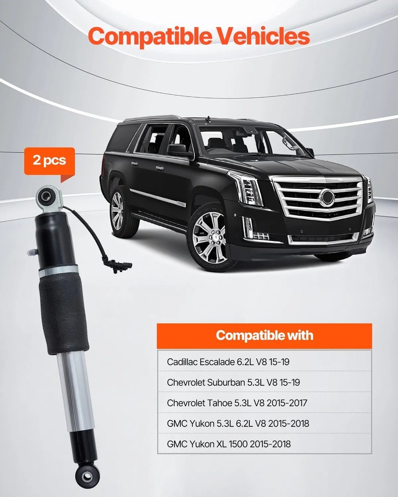 VEVOR Rear Air Shock Absorber Strut, 2 PCS, Compatible withCadillac Escalade, Chevrolet Suburban/ Tahoe, GMC Yukon/Yukon XL,Replacement for 22283446 22278958 580-1106 5801068 580110623151122 Vehicle-Specific Fit Smooth & Stable Ride Heavy-Duty Steel Construction Installation Reminder Direct OEM Fit & Easy Installation Restore High Performance Voltage: 5V,Item Model Number: 2S 9217,Product Dimensions: 3.9 x3.4 x 24.8 inch / 100 x 87 x 630 mm,Net Weight: 18.6 lbs / 8.44kg(Include all accessories)