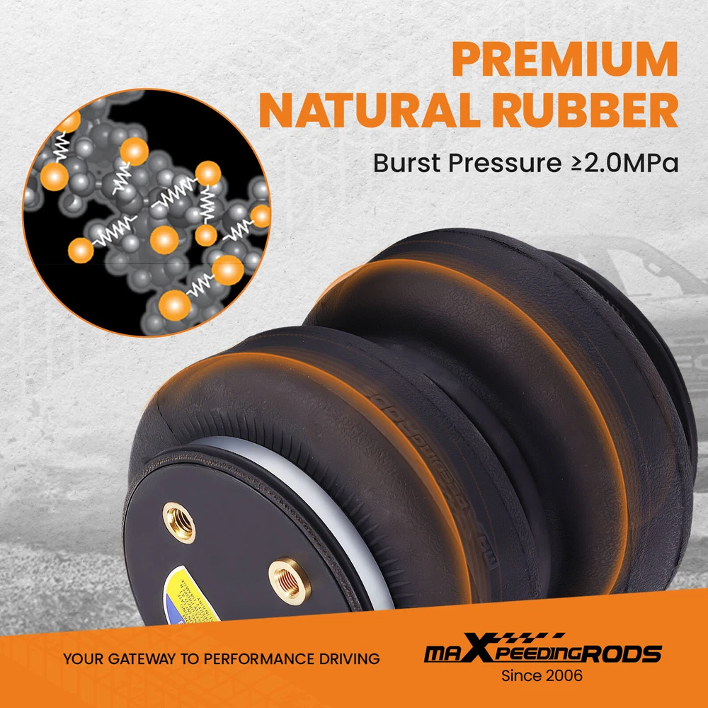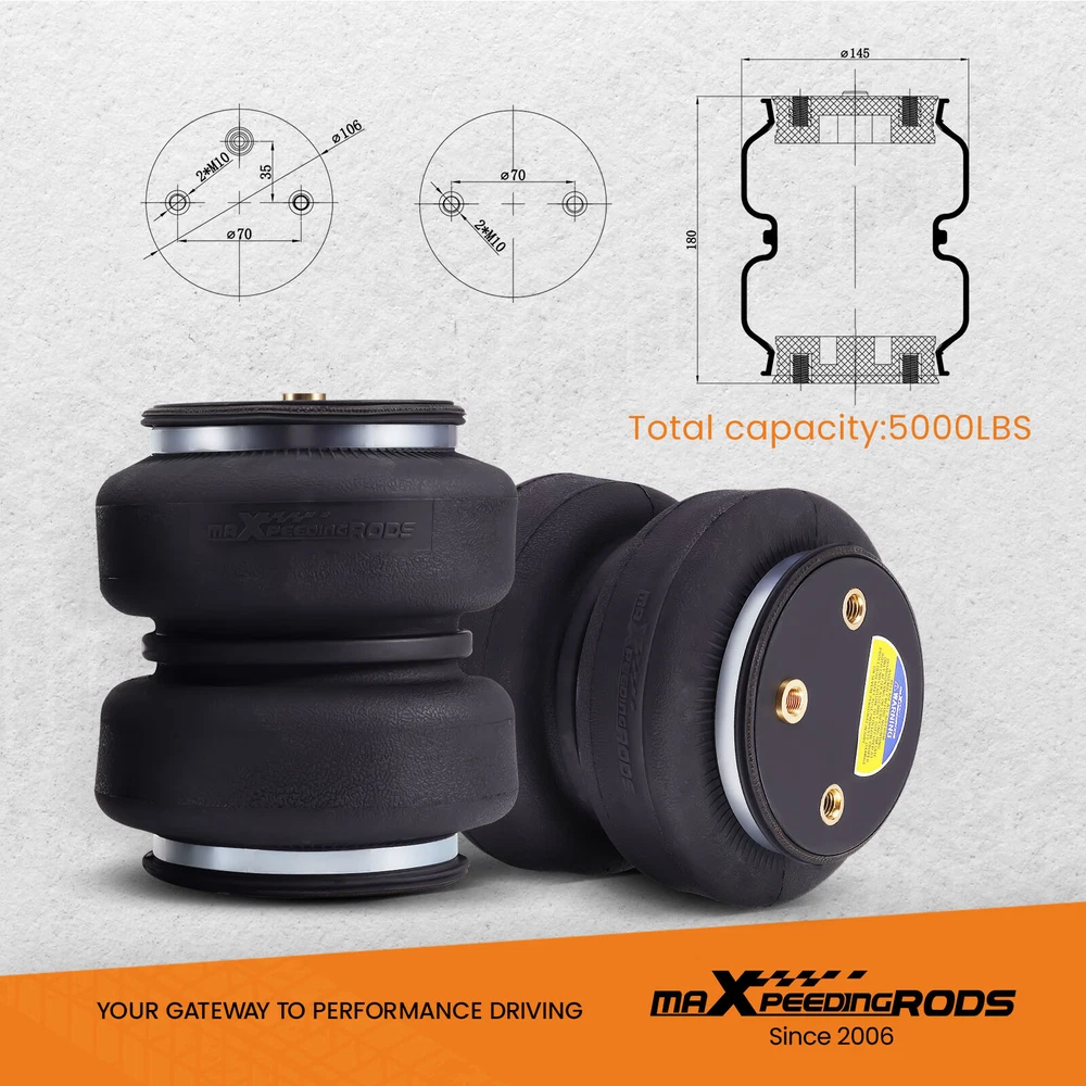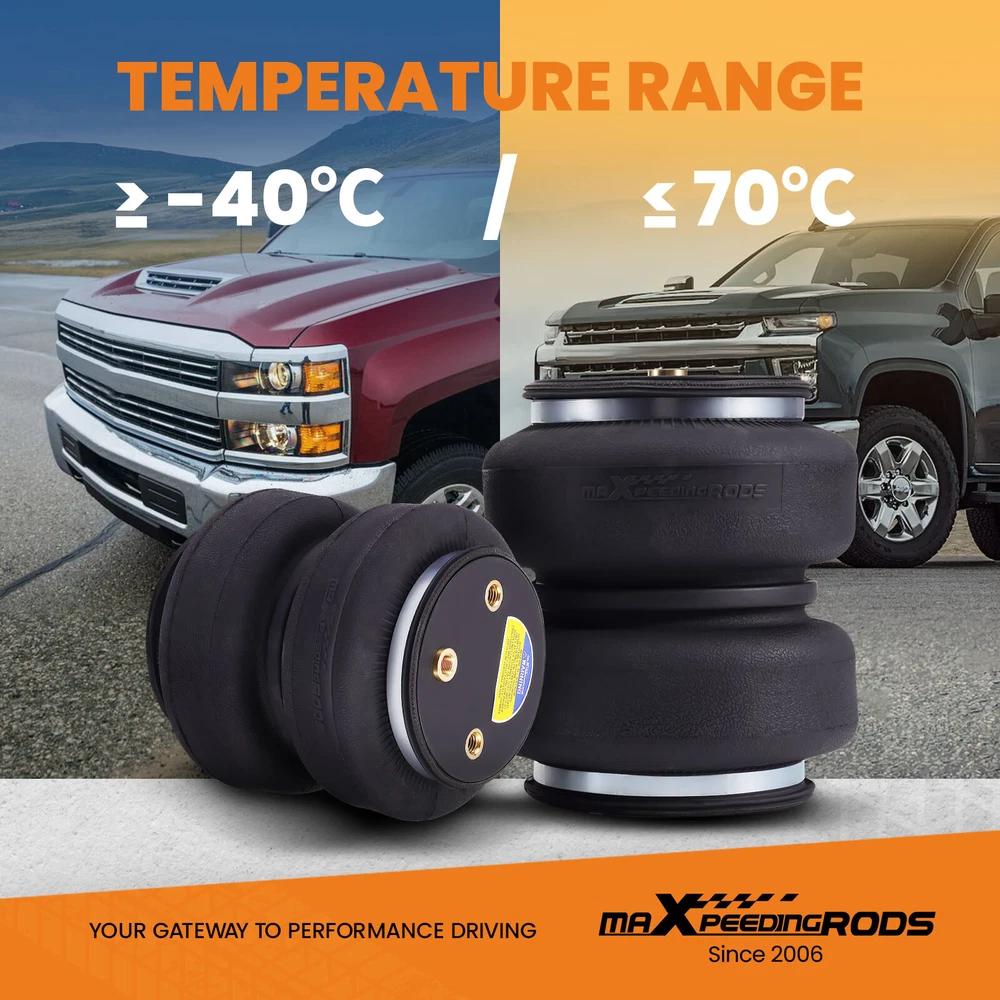 YRMAP Rear Air Spring Leveling Kit for Ford F250 F350 Super Duty Pickup 4WD RWD 99-07 Air Suspension Bags Kit maXpeedingrods 5000 lbs Air Suspension Bags Kit Fitment For Ford F-250 4WD RWD1999-2004 For Ford F-350 4WD RWD1999-2004 For Ford F-250 Base Model 1999 For Ford F-250 Super Cab4WD RWD 1999 For Ford F-250 for Harley-Davidson Edition 2005-2007 For Ford F-250 for King Ranch4WD RWD 2005-2007 For Ford F-250 Lariat 4WD RWD 2005-2007 For Ford F-250 XL 4WD RWD 2005-2007 For Ford F-250 XLT 4WD RWD 2005-2007 For Ford F-350 for Harley-Davidson Edition 2005-2007 For Ford F-350 for King Ranch4WD RWD 2005-2007 For Ford F-350 Lariat 4WD RWD 2005-2007 For Ford F-350 XL 4WD RWD 2005-2007 For Ford F-350 XLT 4WD RWD 2005-2007 *Note: Only work on trucks equipped with for BW Hitch 1105 or 1199R in the 49 in. position. Fit many 3/4 ton and 1 ton pickups or vans Package Includes 2x Air springs 1x Air line 2x Schrader valves 2x Air fitting connectord 4x Rolling plates 4x Mounting Brackets Hardware kit Features Safe carrying capacity and stability. Specifications Spring Type Leaf Condition Brand New With Internal Jounce Bumper Yes Air Spring Design height 180 mm Air Spring Stroke 100 mm Air Spring Max. Extended 200 mm Load capacity Up to 5000 LBS Air Spring Min. Compressed 100 mm Air Spring Pressure 5-100PSI Features 1、Stress Test Over 5,000,000 Times: Durable and Safe. 2、Burst Pressure≥2.0MPa:High Compressive Strength and Less Noise. 3、Air Tightness Test ≤ 0.02MPa:100% Air Tightness Guarantee. 4、Temperature Range ≥ -40℃/ ≤ 70℃:Premium Natural Rubber Material. 5、Use high-quality steel with high load-bearing capacity and long life. 6、Excellent and practical bolt-on installation. 7、Safe carrying capacity and stability. maXpeedingrods Air Suspension Bags Kit Solves These Common Problems Why Choose MaXpeedingrods Fatigue Testing Airtightness Test Air Pressure Test Trusted by champion On Board Air Compressor Kit See Details Make Universal for most air bags suspension kit Example 1 For Ford Example 2 For Dodge Example 3 For GMC Example 4 For Chevy Other items you might also like Air Suspension Spring Bag Kit For GMC Silverado Sierra 1500 4WD 2019-24 Air Suspension Spring Kit 5000 lbs For GMC Sierra Chevrolet Silverado 1500 99-07 Rear Air Helper Spring Leveling Kit For Ford F250 F350 Super Duty 2005-2010 Front Air Suspension Shock Strut For Land Rover Range Rover LR3 LR4 RNB501250 Rear Air Suspension Strut Shock For Mercedes S Class W220 S430 S500 220320501388 2x Front Suspension Shock Struts For Cadillac Escalade GMC Yukon Chevrolet 00-06 Air Spring Rear LH RH Pair Set for Mercedes GL320 GL350 ML350 1643200825 Rear Air Spring Kit Bags Air lines For Silverado 2500HD 3500HD 2WD 4WD 2001-2010 Air Suspension Spring Bag Kit Rear For F250 F350 Super Duty 2WD 4WD 2011-2016 Rear Suspension Enhancement System For GMC Chevrolet Silverado 3500 2011-2021 Air Suspension Compressor Pump + Relay For Mercedes Benz 4Matic GL450 1663200204 Rear Air Suspension Strut Shock For Mercedes Benz R320 R500 R350 251320193160 Shipping Terms of Sales Payment Contact us All orders will be shipped within 1 business day after payment has been processed. For orders placed before 5:30 AM PST on business days, most items will be shipped out on the same day. All orders will be shipped with a tracking number via USPS, UPS, or FedEx Express and delivered within 2-6 business days We do not ship to P.O. Boxes, APO/FPO addresses, or Military Mail Boxes. Please ensure your address is confirmed by PayPal before checkout, as we only ship to confirmed addresses. 30-day free return and money back guarantee If you are not satisfied with your purchase, you can return the item with its original packaging to us for a full refund with no restocking fee. Please note that the return cost should be paid by the seller. One Year Unlimited Mileage Quality Guarantee If you receive incorrect items, items that are damaged during transportation, or defective items, we will accept returns and cover the return freight. Please note that the return cost should be prepaid by the buyer. After inspecting the faulty item, we will issue a refund of the return cost to the buyer. We offer a full refund or replacement for all faulty items, which includes the cost of original shipping. Please contact us before initiating a return. Our representatives will provide you with detailed instructions on how to proceed. Our guarantee covers only the cost of the item. We are not responsible for installation or other fees, such as labor, towing, additional repairs, or related expenses. We only accept payment through Paypal for all orders, which should be made through eBay. Paypal offers various payment methods, including credit card, direct debit, VISA, and others. For more information, please visit Paypal. Our customer service center is open 24 hours a day, seven days a week. If you have any questions, please don't hesitate to contact us. We are dedicated to providing excellent customer service and will do everything we can to ensure your satisfaction.