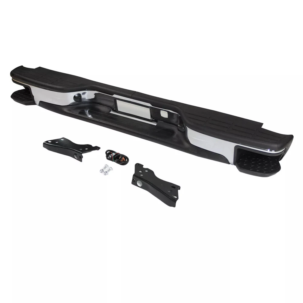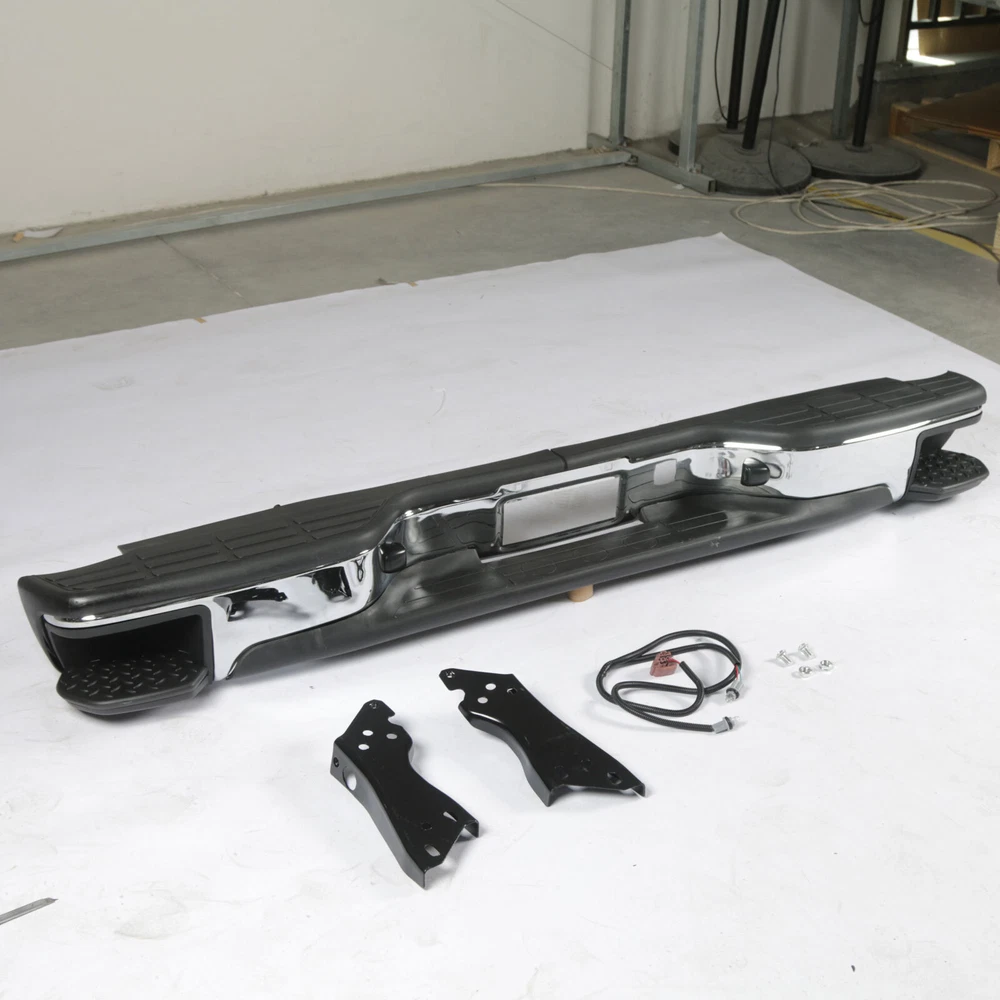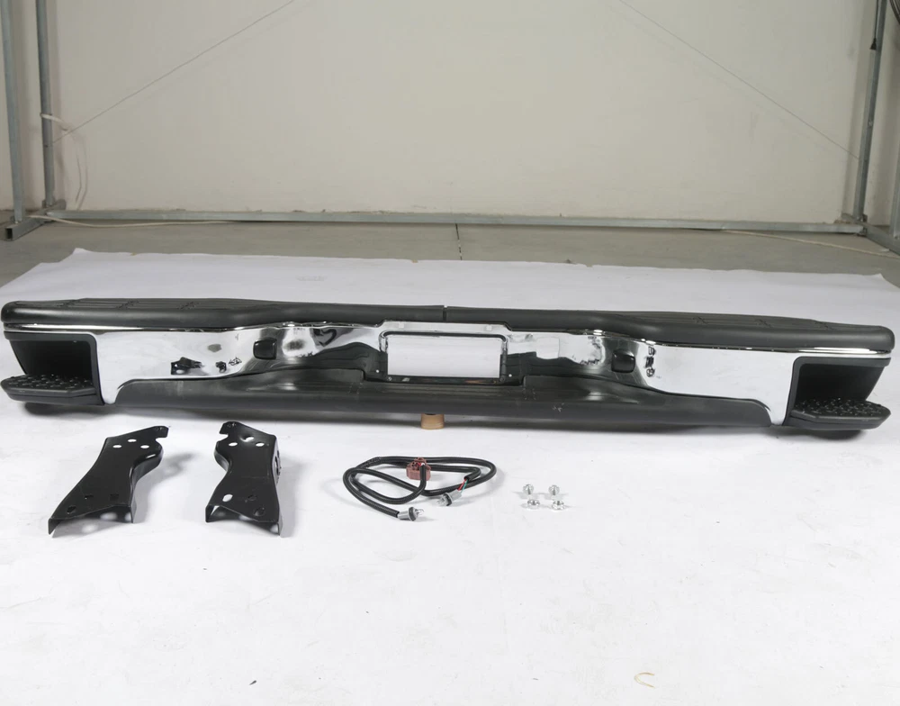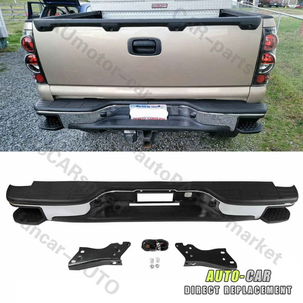 Feature Type:Rear Bumper w/Corner Steps Color:Black&Silver Material:Steel Surface Finish:Chrome Installation Directly replace the old bumper,no modification Professional installation is highly recommended. Fitment For 1999-2006 Chevy Silverado GMC Sierra 1500 07 Classic Note Use your own bolts Only Fit Fleetside models Don't Fit Stepside models Package Includes 1 Rear Bumper 2 Brackets 2 License Plate Lights On Jul 9, 2024 at 09:48:36 PDT, seller added the following information: On Jul 11, 2024 at 17:43:37 PDT, seller added the following information: On Jul 15, 2024 at 01:04:09 PDT, seller added the following information: On Aug 21, 2024 at 18:07:43 PDT, seller added the following information: On Aug 21, 2024 at 21:33:46 PDT, seller added the following information: