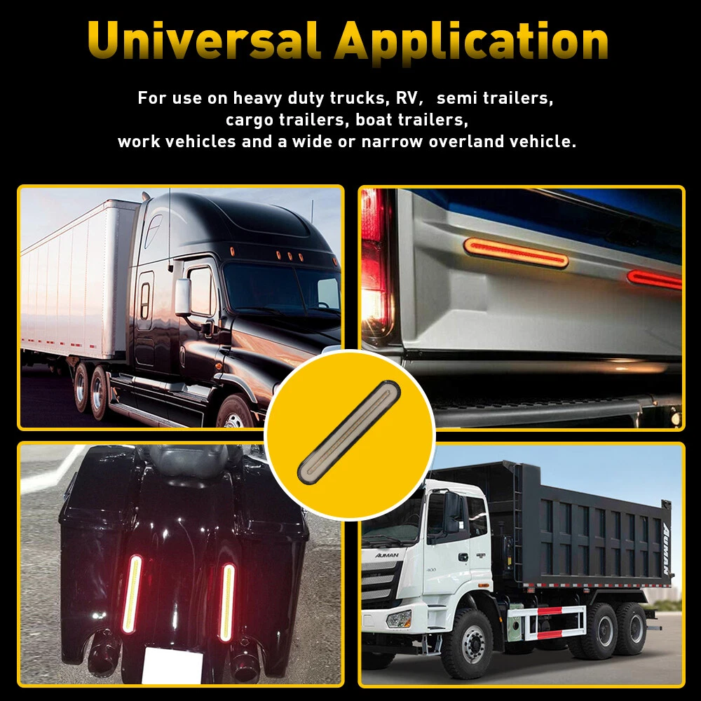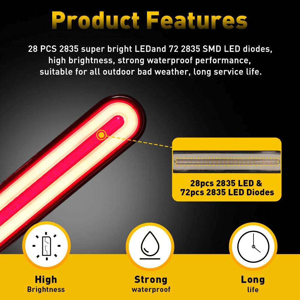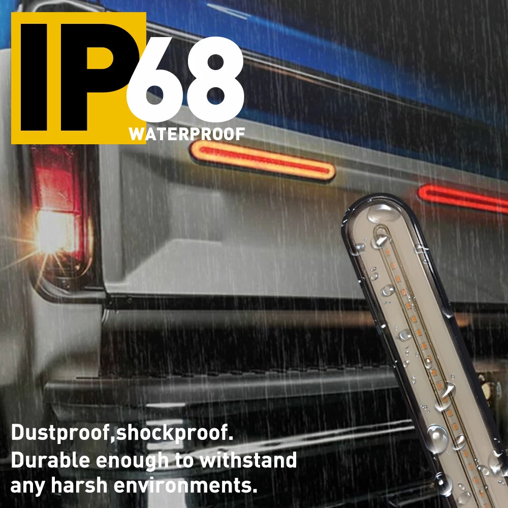 LED Flowing Reverse Stop Brake Turn Signal Rear Tail Light For Truck Trailer RV Specification Waterproof level: IP68 Voltage:12-24V LED Type:2835 SMD LED quantity: 100pcs Light Color:Red+Yellow Material: PC+ABS Service life: 50000h+ Suitable: for use on heavy duty trucks, RV,semi-trailers, cargo trailers, boat trailers, work vehicles and a wide or narrow overland vehicle. Funciton: as clearance, side marker or identification light, stop, turn, tail and brake light Wire Connection: Black wire : negative Red wire : low brightness (red) White wire : high brightness(red) Yellow wire: dynamic light(yellow) Rear DRL Truck Car Light LED Brake Bar Flowing Turn Signal Stop Tail Strip 12-24 LED Flowing Reverse Stop Brake Turn Signal Rear Tail Light For Truck Trailer RV Specification Waterproof level: IP68 Voltage:12-24V LED Type:2835 SMD LED quantity: 100pcs Light Color:Red+Yellow Material: PC+ABS Service life: 50000h+ Suitable: for use on heavy duty trucks, RV,semi-trailers, cargo trailers, boat trailers, work vehicles and a wide or narrow overland vehicle. Funciton: as clearance, side marker or identification light, stop, turn, tail and brake light Wire Connection: Black wire : negative Red wire : low brightness (red) White wire : high brightness(red) Yellow wire: dynamic light(yellow) Features: *3-in-1 design: 3 In 1 Design,Neon Halo Ring Tail & Brake Light,Sequential Flowing Signal Light. *High brightness: The 2835 super bright LED with high brightness ensures its strong waterproof function and long service life,it is suitable for all outdoor inclement weather. *Waterproof: The tail light is highly silicon sealed with an IP67 waterproof rating, which works even under extreme conditions such as rain and snow. *Easy to install: Direct replacement,drilling and hardwiring are not required *Wide application: Fit for heavy-duty trucks, RV,semi-trailers, cargo trailers, boat trailers, work vehicles and a wide or narrow overland vehicle. Note: Please check the detail information carefully before purchasing Please allow 1-2mm in size measurement chart for variance due to manual measurement Your satisfaction is our utmost concern, please feel free to contact us for any questions and concerns Package Include: flowing tail light*1 Item Specifics Type 9 INCH LED light bar Manufacturer Part Number WD-RY-FLOW-EA LED Brand 2835 SMD LED CHIPS Working Temperature -40 to ++++ 80 centigrade Waterproof Ip67 To Fit parking,brake turn signal/Driving Lights Number of Bulbs 100LED Voltage DC 12-24V Color Red++++ Yellow Lens Color Smoke Placement on Vehicle Front, Rear, Left, Right, Inner Other Part Number Each light has 28pcs 2835 Super Bright LED Brand Unbranded Fitment Type Direct Replacement Fit For 1 Jeep、Mini、Nissan、Toyota、BMW、Ranger、 Land Rover Fit For 2 Pickup、Wagon、UTB、Cab、ATV、SUV、Jeep、Truck、Boat、Bus Fit For 3 Sport Utility、4WD 4X4、Chevrolet Silverado、GMC Sie Other Part Number 2 72Pcs 2835 SMD LED Diodes for a Bright Performance Position Stop turn tail brake marker Clearance Lamp Manufacturer Warranty Lifetime Lighting Technology LED Payment We only accept PayPal payment, should be received within 3 days from the date of purchase. Please keep the consistency of Paypal address and ebay address. Payment should be made within 4 days once you won a item ,or ebay will launch Unpaid Reminder agaist you and there will be bad record on your ebay account . Buyers are responsible for import duties, custom fees and taxes.Please check with your country's custom office to determine the additional costs before you finally make the purchase Shipping All items will be shipped in 48 hours after receiving your payment . We ship this item to US only via USPS first class mail. It usually takes 3-6 working days to deliver. Returns We offer 30 days return policy. Please contact us within 30 days t from the date you receive your order if you have any issues with the product or want return .Refund will be send after we got your resend package. All returned items should be in the original packaging , return tracking information should be provided .. Buyer is responsible for return shipping cost due to the problem not caused by item quality itself . Contact Us Our office hours are MONDAY - FRIDAY 9:00PM - 6:00PM PST, but we will response you once we get your message .There will be some delay on response if you send message or E-Mail on weekend. FAQ Q1: Will this bulb fit my vehicle? A: We can match almost any vehicle to one of our bulb sizes. eBay only lets us include partial vehicle fitments per listing, but if your vehicle does not show up on the compatibility table at the top of our listings, welcome you to contact us for free consulation before purchasing a product. Q2: My item has not arrived, what's taking so long? A: Sometimes items take longer than expected, especially if it’s going far or to rural area. Check with your post office to see if your item has been held up. Sometimes USPS will not update a tracking number until it has arrived at its destination. If your item still has not arrived after a few days, let us know so we can double check for you and help solve it asap. Q3: Do I need to mention the Year, Make and Model in the notes when place order? A: YES. Please include the Year, Make, and Model in the notes section during checkout to ensure you receive everything needed for your kit! Q4: My bulbs won't fit, help! A: Special bulb holder may be required. See if you can take the holder from the stock bulb. If not, let us know. The bulb size may be wrong, double check the item you received with the item you ordered. Do you have an aftermarket lighting housing? These may not be perfectly fitted for aftermarket bulbs and will require some manual modifications. Q5: Neither side lighting up? Both sides flicker, flash, or work inconsistantly. A:Check the headlight fuses, and then check the ballast plugs to insure correct installation. If this doesn't work, there may be a voltage problem with