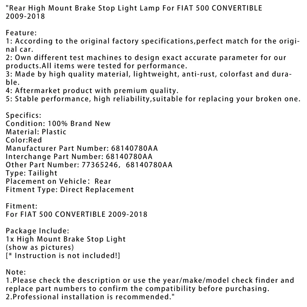 CNC Adjustable Kickstand Side Stand Fit HONDA CBR 600 1000 RR 600RR 1000RR 35.99 USD Free shipping U760E U760 TOYOTA RAV4 Transmission Valve Body For Toyota Camry RAV4 269.87 USD Free shipping Carburetor Carb Rebuild Kit for Yamaha F50-T50hp 4 Stroke 62Y-W0093-11-00 01-04 14.99 USD Free shipping FUEL PUMP FUSE RELAY fit for Yamaha YZF R1 R6 FZ1 Fazer FZ8-N Naked 5VK-81950-40 28.99 USD Free shipping Gbox Detent Kit for Porsche Transmission 996 997GT3 Boxster S Fixes 2ND Gear WR 18.99 USD Free shipping Heater Hose Output T Pipes 87248-60460 Fit Toyota Land Cruiser FZJ80 100Series 11.99 USD Free shipping 6L80 6L90 Transmission Rebuild 1-2-3-4 3-5-Reverse Clutch Seals Pack O-Rings 21.99 USD Free shipping DUAL LINE FUEL TANK FLANGE KIT FOR PLASTIC TANKS FOR HONDA TRX70 TRX125 85-87 13.99 USD Free shipping STARTER CLUTCH ASSY FOR YAMAHA FZ1 FZ8 YZF-R1 R1 2004-2015 # 5VY-15570-00-00 21.79 USD Free shipping Voltage Rectifier Regulator For Ski-Doo Lynx Forest Legend Touring 515175661 36.69 USD Free shipping 7Pcs Pneumatic Fan Clutch Wrench Set Removal Tool Kit For Ford/GM/Chrysler/Jeep 49.87 USD Free shipping Rear Hugger Fender Mudguards ABS Fairing For Honda CBR954RR 2002-2003 Carbon 39.76 USD Free shipping A Fantastic Shop Send us a message Our Store Seller Profile Feedbacks Save this seller Contact Rear High Mount Brake Stop Light Lamp For FIAT 500 CONVERTIBLE 2009-2018 Rear High Mount Brake Stop Light Lamp For FIAT 500 CONVERTIBLE 2009-2018 Feature: 1: According to the original factory specifications,perfect match for the original car. 2: Own different test machines to design exact accurate parameter for our products.All items were tested for performance. 3: Made by high quality material, lightweight, anti-rust, colorfast and durable. 4: Aftermarket product with premium quality. 5: Stable performance, high reliability,suitable for replacing your broken one. Specifics: Condition: 100% Brand New Material: Plastic Color:Red Manufacturer Part Number: 68140780AA Interchange Part Number: 68140780AA Other Part Number: 77365246,68140780AA Type: Tailight Placement on Vehicle:Rear Fitment Type: Direct Replacement Fitment: For FIAT 500 CONVERTIBLE 2009-2018 Package Include: 1x High Mount Brake Stop Light (show as pictures) [* Instruction is not included!] Note: 1.Please check the description or use the year/make/model check finder and replace part numbers to confirm the compatibility before purchasing. 2.Professional installation is recommended. About US About Our Items We strive to describe all items accurately and thoroughly, with the utmost care and attention to detail. However, to ensure a mutually satisfactory transaction, we kindly ask for your assistance in thoroughly reviewing the item description and photos, and addressing any questions before placing a bid. Customer Satisfaction We stand behind our commitment with exceptional service, a 100% money-back guarantee, and a dedication to customer satisfaction. I am readily available to address any inquiries or concerns you may have, both before and after your purchase. Our aim is to ensure your shopping experience is enjoyable and that you're delighted with your purchase. Feedback Your feedback is crucial to our business's success. If you're satisfied with your purchase and the service you received, we would greatly appreciate your positive feedback, along with an overall Detailed Selling Rating (DSR) of 5. Please take a moment to leave us positive feedback. Our eBay account is set up to automatically reciprocate positive feedback once yours is received. If you're considering leaving neutral/negative feedback or opening an eBay/PayPal case, we encourage you to reach out to us immediately. We're committed to resolving any issues to the best of our ability. Shipping Parcel will be shipped using Standard shipping method. For security purposes, items will be shipped exclusively to the confirmed address on Paypal. Please ensure your Shipping address is up to date before proceeding with payment. Estimated delivery time within the United States ranges from 3 to 10 business days, depending on your location. Returns We accept returns within 60 days from the date the buyer receives the item. If the item is found to be defective upon receipt, the customer has up to 30 days from the date of receipt to request an exchange for a new item or a refund. For returns due to a change of mind, we accept items in their original selling condition. However, if the package has been opened due to a mistaken order, it does not qualify for our return policy. Please note that the buyer is responsible for covering the cost of return postage. If you encounter any issues, please reach out to us via eBay message, and we'll respond within 24 hours. Left Rear Bumper Tail Lamp Fog Lamp Assembly 4M0945095A For AUDI Q7 2016-2023 75.87 USD Free shipping Right Rear Bumper Tail Lamp Fog Lamp Assembly 4M0945096A For AUDI Q7 2016-2023 75.87 USD Free shipping L+R Pair Rear Bumper Reflector W/ Red Lens No Light For VW Touareg 7L 2002-2010 36.79 USD Free shipping Rear Left+Right Tail Light 63219808149/150 For MINI Countryman R60 208.94 USD Free shipping High Level Brake LED Light Rear Third Stop Fits Renault Megane Mk2 2002-2009 US 35.87 USD Free shipping LED Smoke Lens 3RD Third Brake Stop Light For Audi A3 S3 RS3 Sportback 2004-2012 38.79 USD Free shipping L+R Tail Light 2049060603/4 For Mercedes Benz W204 C250 C300 C350 C63 2011-2014 308.78 USD Free shipping LED 3rd Third Brake Light 84330249 For Chevr Camaro 2016-2021 16 31.79 USD Free shipping Rear Bumper L+R Lower Side Reflector 7P6945701K 7P6945702G For VW Touareg 14-18 60.99 USD Free shipping 2x Left+Right Inner Trunk LED Tail Light Lamp For AUDI A6 C7 2012-2015 169.87 USD Free shipping Tail Light Bulb 1943373 For GMC Acadia 2013-2017 36.99 USD Free shipping 2x High Level 3rd LED Rear Brake Light For Ford Transit Tourneo Custom Barn Door 37.79 USD Free shipping