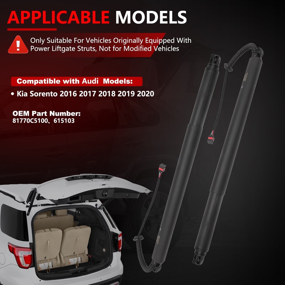 Store Categories Store Categories High Pressure Fuel Pump Liftgate Actuator Struts Oxygen Sensors Rear View Backup Camera Climate Control Panel Tire Press Monitoring System Master Power Window Switch Battery Current Sensor Shock Struts Suspension Fuel pump assembly Solenoid valve wiring harness Radiator Camshafts Throttle Bodies DEF PUMP Vacuum Pumps Door Handles Fuel Injectors Other Cowtotal Autoparts,Your Best Aftermarket DIY & DIFM Partner. Product Description Pa cka g e includes: Set Of 2 Power Tailgate(Left & Right Side Only fits Power Opener Model ) Fitme nt : (For Reference Only) Kia Sorento 2016-2020 Sport Utility 2020 Kia Sorento EX, L, LX, S, SX 2.4L L4 - Gas, 3.3L V6 - Gas 20 1 9 Kia Sorento EX, L, LX, S, SX, SX Limited 2.4L L4 - Gas, 3.3L V6 - Gas 2018 Kia Sorento EX, L, LX, SX, SX Limited 2.0L L4 - Gas, 2.4L L4 - Gas, 3.3L V6 - Gas 2017 Kia Sorento EX, L, LX, Limited, SX, SX Limited 2.0L L4 - Gas, 2.4L L4 - Gas, 3.3L V6 - Gas 2016 Kia Sorento EX, L, LX, Limited, SX, SX Limited 2.0L L4 - Gas, 2.4L L4 - Gas, 3.3L V6 - Gas Features: 100% test before shipping to ensure product safety, stability and durability. OE Qualify Guaranteed.From manufacturer that maintains complete strict quality control. Direct-fit replacement ensures proper fit, form, and function. Plug and play design ensures ease of installation. Designed to meet Federal Safety Standards. Specifications: Condition: Brand New & Perfect Packed Quantity: 2 Struts Part Number: 81770-C5100, 81770C5100, 615103 N ote: Pleas e Check Carefully To Make Sure the OE Number And Picture are Exactly Listed Are The Same As Your Orignal One. If You are Not Sure Whether It Fits, Please send VIN number to us. No Instruction Included, professional installation is highly recommended . Payment Policy Shipping Policy Returns Policy Warranty Payment Policy 1. We accept Paypal, Credit Card, Veno,Goggle Pay,American Express,Discover, Direct Debit, VISA, eCheck, or othe r methods, please kindly check Paypal for more information. 2. For multiple purchases, please add items to your Ebay shopping cart and pay once for entire order. Shipping Policy 1. All items will be shipped to buyer's ebay address. 2. All items will be shipped within 24 working hours upon receipt of payment, and multiple items might be combined shipping. 3. In most cases, delivery takes around 3-7 business days, it's highly depended on the efficiency of the shpping carrier. If your item doesn't arrive on time, please contact us immediately for further assistance. Please note there is no local pickup service available. 4. We do appreciate your purchase here. If you are astisfied with the item as well as our service, please kindly leave us a Positive Feedback to help develop our bu siness. Th ank you in advance. Returns Policy We have a friendly and dedicated customer support teams to handle any problems you come up with our products. Please contact us first via email or message for replacement, refund or technical problem caused by any reason. Warranty 30 Days Free Return and Money Back Guarantee. If you are not satisfied with your purchase, you can return the item with original packaging back to us for full refund, not any re-stock fee. The return cost should be paid by buyer. 5 Year Unl imited Mileage Quality Guarantee If you receive any w rong items, or damage during the transportation or defect items, we will accept the return and pay the return freight. Please noted that the return cost should be prepaid by buyer, we will issue the refund of return cost to buyer after inspecting the faulty item. The full refund or replacement will be available for all faulty items, including the original shipping cost. Please kindly contact us b efore return, our representatives will send you the detailed return instruction. The guarantee will be only for the cost of the item, we will not responsible for installation or other fees like labor expenses, towing expenses, additional repair expenses or other related expenses. Copyright © 2023 Dianxiaomi