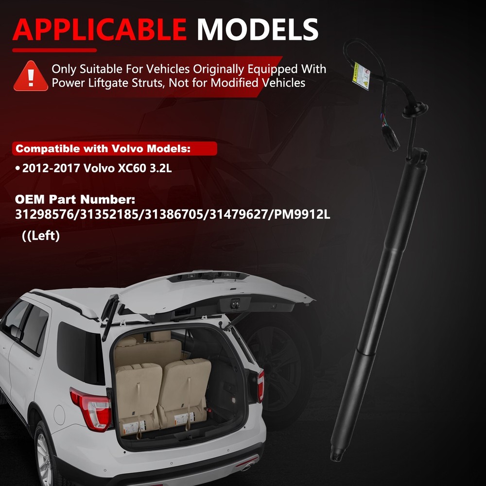 Store Categories Store Categories O2 Sensors Backup Camera TPMS Power Tailgate Strut AC/Heater Climate Control Other Cowtotal Autoparts,Your Best Aftermarket DIY & DIFM Partner. Product Description Pa cka g e includes: 1 Electric Power Tailgate Fitme nt : (For Reference Only) Volvo XC60 3.2 2012-2017 Sport Utylity Volvo XC60 T5 2012-2017 Sport Utylity Volvo XC60 T6 Ocean Race 2012-2017 Sport Utylity Volvo XC60 T6 2012-2017 Sport Utylity Features: 100% test before shipping to ensure product safety, stability and durability. OE Qualify Guaranteed.From manufacturer that maintains complete strict quality control. Direct-fit replacement ensures proper fit, form, and function. Plug and play design ensures ease of installation. Designed to meet Federal Safety Standards. Specifications: Condition: Brand New & Perfect Packed Quantity: 1 Power Struts PartNumber: 31298576, 31352185, 31386705, 31479627,PM9912L, PM9913R N ote: Pleas e Check Carefully To Make Sure the OE Number And Picture are Exactly Listed Are The Same As Your Orignal One. If You are Not Sure Whether It Fits, Please send VIN number to us. No Instruction Included, professional installation is highly recommended . Payment Policy Shipping Policy Returns Policy Warranty Payment Policy 1. We accept Paypal, Credit Card, Veno,Goggle Pay,American Express,Discover, Direct Debit, VISA, eCheck, or othe r methods, please kindly check Paypal for more information. 2. For multiple purchases, please add items to your Ebay shopping cart and pay once for entire order. Shipping Policy 1. All items will be shipped to buyer's ebay address. 2. All items will be shipped within 24 working hours upon receipt of payment, and multiple items might be combined shipping. 3. In most cases, delivery takes around 3-7 business days, it's highly depended on the efficiency of the shpping carrier. If your item doesn't arrive on time, please contact us immediately for further assistance. Please note there is no local pickup service available. 4. We do appreciate your purchase here. If you are astisfied with the item as well as our service, please kindly leave us a Positive Feedback to help develop our bu siness. Th ank you in advance. Returns Policy We have a friendly and dedicated customer support teams to handle any problems you come up with our products. Please contact us first via email or message for replacement, refund or technical problem caused by any reason. Warranty 30 Days Free Return and Money Back Guarantee. If you are not satisfied with your purchase, you can return the item with original packaging back to us for full refund, not any re-stock fee. The return cost should be paid by buyer. 5 Year Unl imited Mileage Quality Guarantee If you receive any w rong items, or damage during the transportation or defect items, we will accept the return and pay the return freight. Please noted that the return cost should be prepaid by buyer, we will issue the refund of return cost to buyer after inspecting the faulty item. The full refund or replacement will be available for all faulty items, including the original shipping cost. Please kindly contact us b efore return, our representatives will send you the detailed return instruction. The guarantee will be only for the cost of the item, we will not responsible for installation or other fees like labor expenses, towing expenses, additional repair expenses or other related expenses. Copyright © 2023 Dianxiaomi