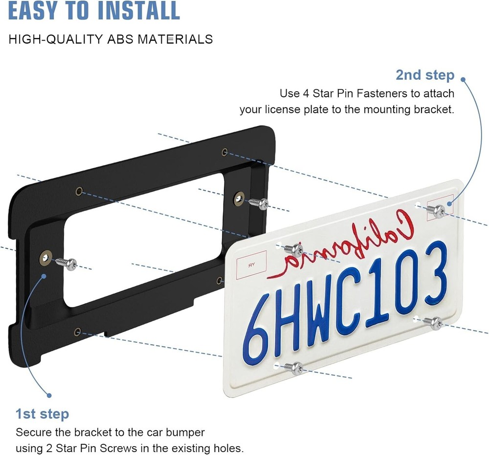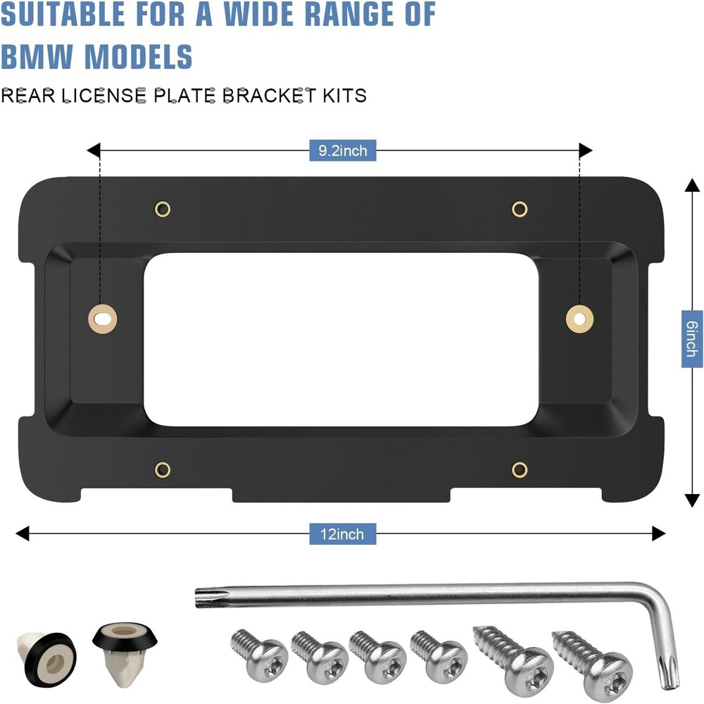 About this item Fit BMW License Plate Bracket: Compatible with 2005-2023 BMW 1/2/3/4/5/6/X/Z Series models, including X1 X3 X4 X5 X6 I3 M3 Z4 E90 E91 E92 E93 E36 F30 v X3 E46 F10 E30 330i 328i 320 528i E21 E81 E82 E87 E88 E53 E61 E85 E86.Excludes 7 Series and Wagon body styles.; Also fits 2002-2024 Mini Cooper Convertible, Cooper S, Clubman, and Land Rover Range Rover: 06-08 HSE, LR3 LR4, 10-12 L322, 17 Evoque Replacement for Original Part: Can substitute OE part numbers 51187160607, 511882380615, and 51188238061 license plate holders. Easy installation by screwing into the rear trunk, providing a reliable OEM replacement option Simple Installation: The kit includes 2 Torx Self-Tapping Screws, 4 Torx Bolts, 1 special wrench, and 2 expanding nuts, facilitating installation. Suitable for various vehicles besides BMW, requiring drilling two holes in the bumper cover. Distance between oval holes is approximately 9 inches and between brass nuts about 7 inches. Adapter for 2 Drill Hole Back Trunk, not suitable for 4-hole bumpers Durable ABS License Plate Mount: Crafted from weather-resistant ABS material, the black plastic bracket features 2 brass mounting holes for easy adjustment. Includes four rust-proof golden brass nuts with metal threads for secure fastening