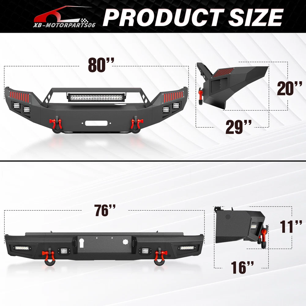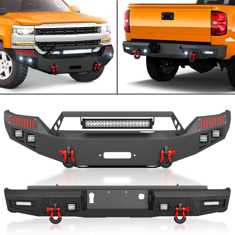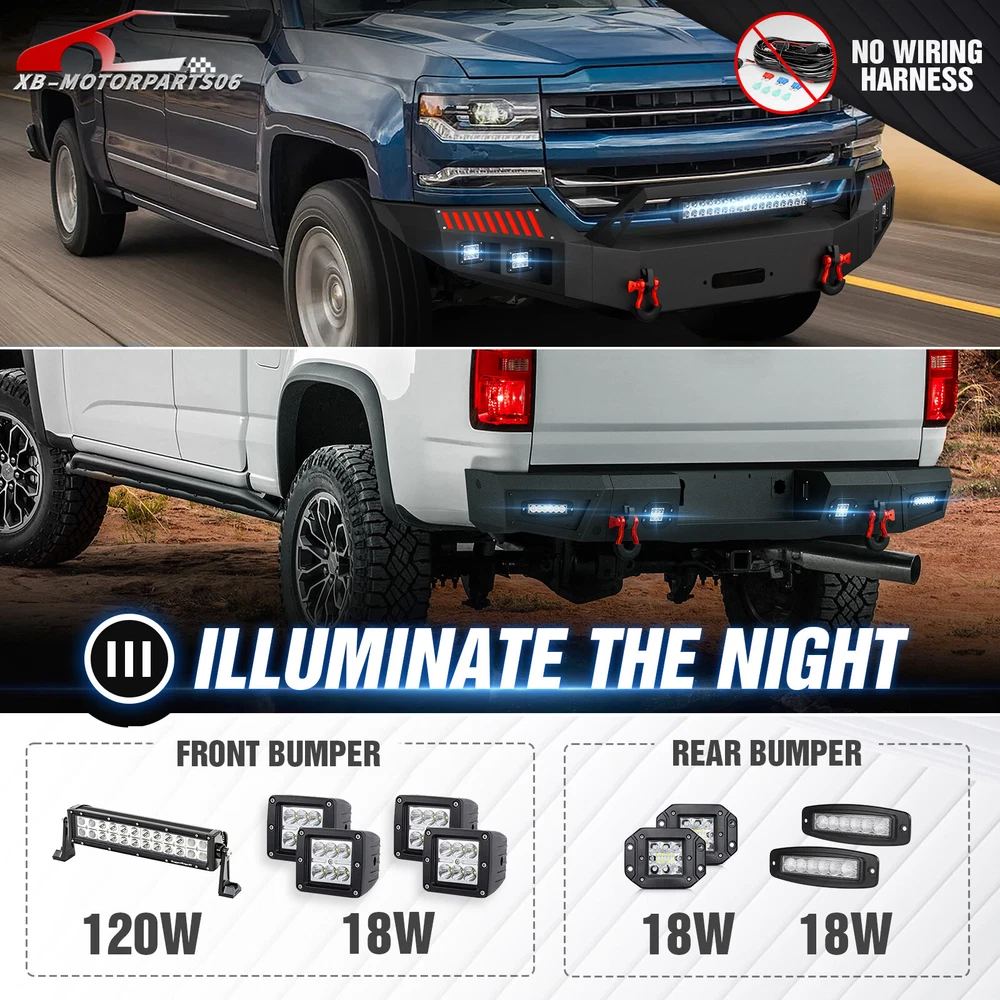 Rear Or Front Bumper W/ LED Lights For 2016-2018 Chevy Chevrolet Silverado 1500 Please pay attention to the product options you select: If you choose Front & Rear Bumper,You can get 1 × Front Bumper, 1 × Rear Bumper and Mounting Hardware; If you choose Only Front Bumper,You can get 1 × Front Bumper and Mounting Hardware; If you choose Only Rear Bumper,You can get 1 × Rear Bumper and Mounting Hardware; Suitable Models : Compatible with 2016 2017 2018 Chevrolet Chevy Silverado 1500 Package Includes : ① Front & Rear Bumper option : 1 x Front Bumper, 1 x Rear Bumper, 9 x LED Lights, 1 x Winch Plate, 1 x license plate light , Paintable Armor, 2 x D-rings, 2 x manual, License Plate Lights, screw fittings ② Fro nt Bumper option : 1 x Front Bumper, 1 x Winch Plate, 2 x D-rings, 5 x LED Lights, 1 x manual, screw fittings ③ Rear Bumper option : 1 x Rear Bumper, Paintable Decor, 2 x D-rings, 4 x LED Lights, license plate light, 1 x manual, screw fittings Product Information : Package Dimensions : 48.43"D x 23.62"W x 23.23"H Installation mode: Bolt-On With Sensor Holes: Yes ( Only Rear Bumper Have, and n o t f it for original sensor ) Steel thickness: 3mm Placement on Vehicle: Front/Rear Item Weight: Front Bumper: 133 Pounds; Rear Bumper: 81 Pounds Material: Carbon Steel Color: Black (hand measurements may have an error of 2-3 mm/0.078-0.118 in) Feature : Front bumper : ① The front bumper is equipped with two sturdy D-ring shackle mounts, securely welded both inside and out. It also features a 12,000 lbs winch plate, two 4.75-ton D-rings, a 120W LED spotlight, and four 18W LED spotlights; ② Crafted from robust high-strength steel, our front bumper is coated with a two-stage textured black powder finish to combine durability and style while offering protection; ③ Installing our Front Bumper is a breeze with its easy bolt-on design, no vehicle modifications required for a simple setup; ④ Powder Coated, Durability, Waterproof; Rear Bumper : ① Our rear bumper offers a stainless steel skid plate, two 4.75-ton D-rings, four powerful 18W LED spotlights, and convenient pre-drilled holes for easy installation of a license plate, trailer plug, and backup sensors; ② Made from strong steel, our rear bumper is extremely durable. The two-stage textured black powder coating not only adds style but also offers additional protection; ③ Setting up our Rear Bumper is easy with its bolt-on design, no vehicle modifications needed for a quick installation; ④ Powder Coated, Durability, Waterproof; Warranty Period :2 year Standard Shipping (FedEx Ground or FedEx Home Delivery) Will usually ship within 3 business days of receiving cleared payment Please pay attention to the product options you select: If you choose Front & Rear Bumper,You can get 1 × Front Bumper, 1 × Rear Bumper and Mounting Hardware; If you choose Only Front Bumper,You can get 1 × Front Bumper and Mounting Hardware; If you choose Only Rear Bumper,You can get 1 × Rear Bumper and Mounting Hardware; Suitable Models : Compatible with 2016 2017 2018 Chevrolet Chevy Silverado 1500 Package Includes : ① Front & Rear Bumper option : 1 x Front Bumper, 1 x Rear Bumper, 9 x LED Lights, 1 x Winch Plate, 1 x license plate light , Paintable Armor, 2 x D-rings, 2 x manual, License Plate Lights, screw fittings ② Fro nt Bumper option : 1 x Front Bumper, 1 x Winch Plate, 2 x D-rings, 5 x LED Lights, 1 x manual, screw fittings ③ Rear Bumper option : 1 x Rear Bumper, Paintable Decor, 2 x D-rings, 4 x LED Lights, license plate light, 1 x manual, screw fittings Product Information : Package Dimensions : 48.43"D x 23.62"W x 23.23"H Installation mode: Bolt-On With Sensor Holes: Yes ( Only Rear Bumper Have, and n o t f it for original sensor ) Steel thickness: 3mm Placement on Vehicle: Front/Rear Item Weight: Front Bumper: 133 Pounds; Rear Bumper: 81 Pounds Material: Carbon Steel Color: Black (hand measurements may have an error of 2-3 mm/0.078-0.118 in) Feature : Front bumper : ① The front bumper is equipped with two sturdy D-ring shackle mounts, securely welded both inside and out. It also features a 12,000 lbs winch plate, two 4.75-ton D-rings, a 120W LED spotlight, and four 18W LED spotlights; ② Crafted from robust high-strength steel, our front bumper is coated with a two-stage textured black powder finish to combine durability and style while offering protection; ③ Installing our Front Bumper is a breeze with its easy bolt-on design, no vehicle modifications required for a simple setup; ④ Powder Coated, Durability, Waterproof; Rear Bumper : ① Our rear bumper offers a stainless steel skid plate, two 4.75-ton D-rings, four powerful 18W LED spotlights, and convenient pre-drilled holes for easy installation of a license plate, trailer plug, and backup sensors; ② Made from strong steel, our rear bumper is extremely durable. The two-stage textured black powder coating not only adds style but also offers additional protection; ③ Setting up our Rear Bumper is easy with its bolt-on design, no vehicle modifications needed for a quick installation; ④ Powder Coated, Durability, Waterproof; Warranty Period :2 year