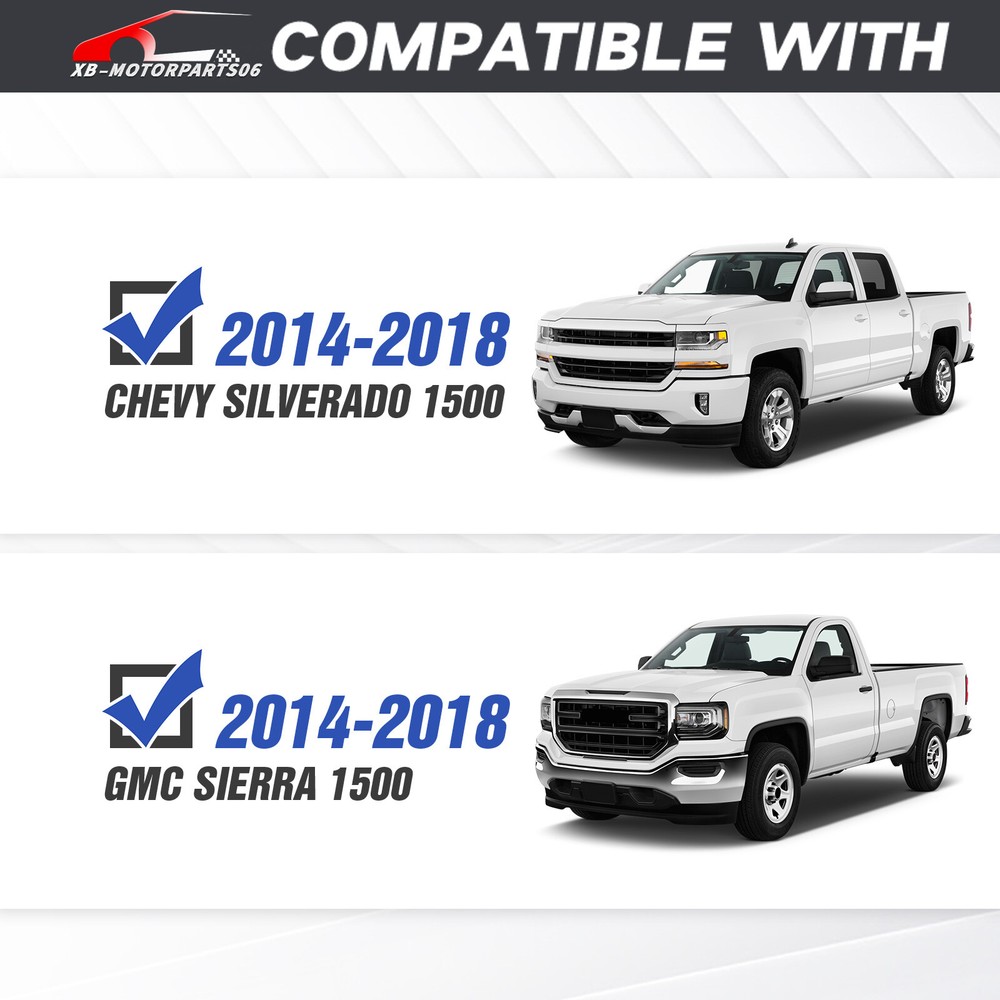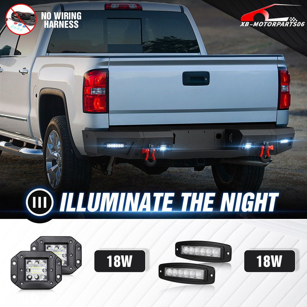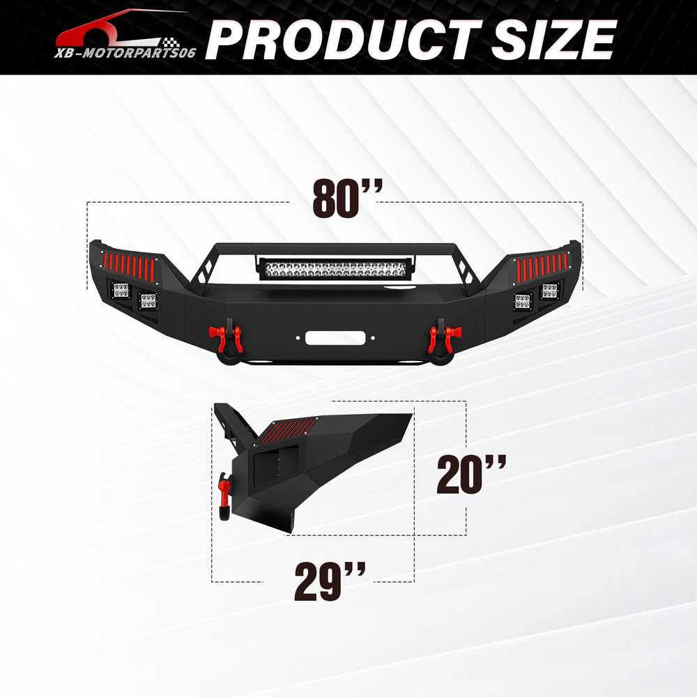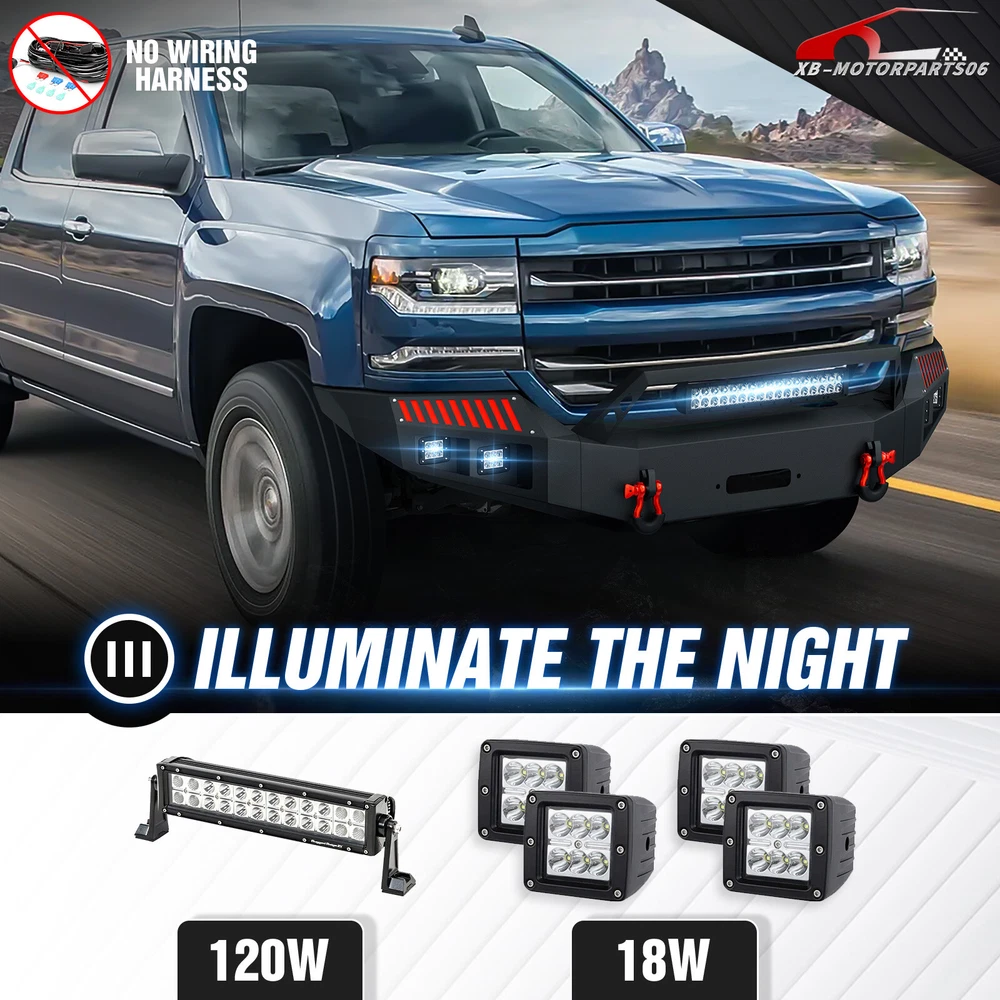 Rear Or Front Bumper W/ LED Lights For 2016-2018 Chevy Chevrolet Silverado 1500 Please pay attention to the product options you select: If you choose Front & Rear Bumper,You can get 1 × Front Bumper, 1 × Rear Bumper and Mounting Hardware; If you choose Only Front Bumper,You can get 1 × Front Bumper and Mounting Hardware; If you choose Only Rear Bumper,You can get 1 × Rear Bumper and Mounting Hardware; Suitable Models : Compatible with 2016 2017 2018 Chevrolet Chevy Silverado 1500 Package Includes : ① Front & Rear Bumper option : 1 x Front Bumper, 1 x Rear Bumper, 9 x LED Lights, 1 x Winch Plate, 1 x license plate light , Paintable Armor, 2 x D-rings, 2 x manual, License Plate Lights, screw fittings ② Fro nt Bumper option : 1 x Front Bumper, 1 x Winch Plate, 2 x D-rings, 5 x LED Lights, 1 x manual, screw fittings ③ Rear Bumper option : 1 x Rear Bumper, Paintable Decor, 2 x D-rings, 4 x LED Lights, license plate light, 1 x manual, screw fittings Product Information : Package Dimensions : 48.43"D x 23.62"W x 23.23"H Installation mode: Bolt-On With Sensor Holes: Yes ( Only Rear Bumper Have, and n o t f it for original sensor ) Steel thickness: 3mm Placement on Vehicle: Front/Rear Item Weight: Front Bumper: 133 Pounds; Rear Bumper: 81 Pounds Material: Carbon Steel Color: Black (hand measurements may have an error of 2-3 mm/0.078-0.118 in) Feature : Front bumper : ① The front bumper is equipped with two sturdy D-ring shackle mounts, securely welded both inside and out. It also features a 12,000 lbs winch plate, two 4.75-ton D-rings, a 120W LED spotlight, and four 18W LED spotlights; ② Crafted from robust high-strength steel, our front bumper is coated with a two-stage textured black powder finish to combine durability and style while offering protection; ③ Installing our Front Bumper is a breeze with its easy bolt-on design, no vehicle modifications required for a simple setup; ④ Powder Coated, Durability, Waterproof; Rear Bumper : ① Our rear bumper offers a stainless steel skid plate, two 4.75-ton D-rings, four powerful 18W LED spotlights, and convenient pre-drilled holes for easy installation of a license plate, trailer plug, and backup sensors; ② Made from strong steel, our rear bumper is extremely durable. The two-stage textured black powder coating not only adds style but also offers additional protection; ③ Setting up our Rear Bumper is easy with its bolt-on design, no vehicle modifications needed for a quick installation; ④ Powder Coated, Durability, Waterproof; Warranty Period :2 year Standard Shipping (FedEx Ground or FedEx Home Delivery) Will usually ship within 3 business days of receiving cleared payment Please pay attention to the product options you select: If you choose Front & Rear Bumper,You can get 1 × Front Bumper, 1 × Rear Bumper and Mounting Hardware; If you choose Only Front Bumper,You can get 1 × Front Bumper and Mounting Hardware; If you choose Only Rear Bumper,You can get 1 × Rear Bumper and Mounting Hardware; Suitable Models : Compatible with 2016 2017 2018 Chevrolet Chevy Silverado 1500 Package Includes : ① Front & Rear Bumper option : 1 x Front Bumper, 1 x Rear Bumper, 9 x LED Lights, 1 x Winch Plate, 1 x license plate light , Paintable Armor, 2 x D-rings, 2 x manual, License Plate Lights, screw fittings ② Fro nt Bumper option : 1 x Front Bumper, 1 x Winch Plate, 2 x D-rings, 5 x LED Lights, 1 x manual, screw fittings ③ Rear Bumper option : 1 x Rear Bumper, Paintable Decor, 2 x D-rings, 4 x LED Lights, license plate light, 1 x manual, screw fittings Product Information : Package Dimensions : 48.43"D x 23.62"W x 23.23"H Installation mode: Bolt-On With Sensor Holes: Yes ( Only Rear Bumper Have, and n o t f it for original sensor ) Steel thickness: 3mm Placement on Vehicle: Front/Rear Item Weight: Front Bumper: 133 Pounds; Rear Bumper: 81 Pounds Material: Carbon Steel Color: Black (hand measurements may have an error of 2-3 mm/0.078-0.118 in) Feature : Front bumper : ① The front bumper is equipped with two sturdy D-ring shackle mounts, securely welded both inside and out. It also features a 12,000 lbs winch plate, two 4.75-ton D-rings, a 120W LED spotlight, and four 18W LED spotlights; ② Crafted from robust high-strength steel, our front bumper is coated with a two-stage textured black powder finish to combine durability and style while offering protection; ③ Installing our Front Bumper is a breeze with its easy bolt-on design, no vehicle modifications required for a simple setup; ④ Powder Coated, Durability, Waterproof; Rear Bumper : ① Our rear bumper offers a stainless steel skid plate, two 4.75-ton D-rings, four powerful 18W LED spotlights, and convenient pre-drilled holes for easy installation of a license plate, trailer plug, and backup sensors; ② Made from strong steel, our rear bumper is extremely durable. The two-stage textured black powder coating not only adds style but also offers additional protection; ③ Setting up our Rear Bumper is easy with its bolt-on design, no vehicle modifications needed for a quick installation; ④ Powder Coated, Durability, Waterproof; Warranty Period :2 year