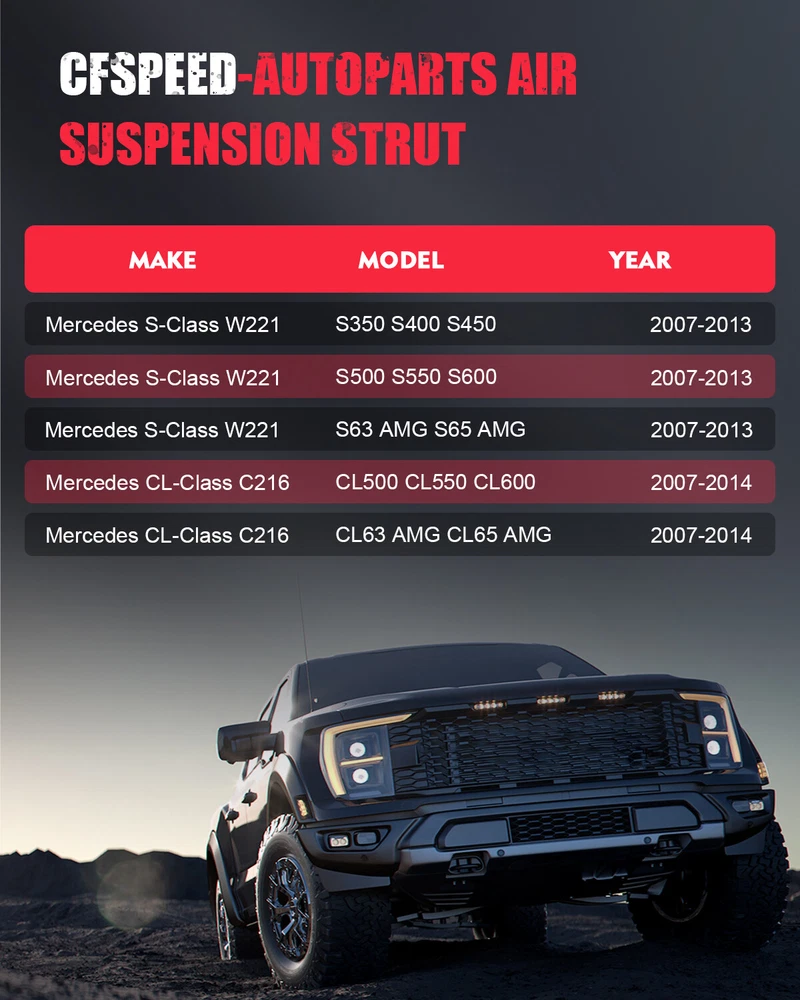 Notes : Please double confim the compatibility as well as the OEM number before purchasing. Instruction is not included. Professional installation is recommended. *OEM Part Number: 2213205613,2213205813, 2213205513,2213205713 *Item Specifications: Key Words: Rear Pair Air Suspension Shock Struts For Mercedes S-Class W221 S350 S400 S450 S500 S550 S600 S63 AMG S65 AMG 2007-2013 CL-Class C216 CL500 CL550 CL600 CL63 AMG CL65 AMG 2007-2014 Package Includes: Pair for Rear Left & Right Air Suspension Shock Struts Rear Pair Air Suspension Shock For Mercedes S/CL-Class W221 S550 CL550 S350 S600 Notes : Please double confim the compatibility as well as the OEM number before purchasing. Instruction is not included. Professional installation is recommended. *OEM Part Number: 2213205613,2213205813, 2213205513,2213205713 *Item Specifications: Key Words: Rear Pair Air Suspension Shock Struts For Mercedes S-Class W221 S350 S400 S450 S500 S550 S600 S63 AMG S65 AMG 2007-2013 CL-Class C216 CL500 CL550 CL600 CL63 AMG CL65 AMG 2007-2014 Package Includes: Pair for Rear Left & Right Air Suspension Shock Struts *Compatibility Chart: 1, You can distinguish specific model of an automobile by VIN(Vehicle Identification Number). 2, VIN(Vehicle Identification Number) consists of total 17 English letters and arabic digits. 3, VIN does not include the letters I (i), O (o), and Q (q) (to avoid confusion with numerals 1 and 0). Mercedes-Benz S-Class W221 Compatile With Airmatic(RWD), 4Matic(4WD) and AMG Model. S350 Base Sedan 4-Door 3.5L 2012-2013 S350 Base Sedan 4-Door 4.6L 2012-2013 S350 Base Sedan 4-Door 5.5L 2012-2013 S350 Bluetec 4Matic Sedan 4-Door 3.0L 2012-2013 S400 Hybrid Sedan 4-Door 3.5L 2010-2013 S450 4Matic Sedan 4-Door 4.6L 2008-2011 S500 Base Sedan 4-Door 5.5L 2007-2011 S550 4Matic Sedan 4-Door 4.6L 2012-2013 S550 4Matic Sedan 4-Door 5.5L 2007-2011 S550 Base Sedan 4-Door 4.6L 2012-2013 S550 Base Sedan 4-Door 5.5L 2007-2011 S600 Base Sedan 4-Door 5.5L 2007-2013 S63 AMG Base Sedan 4-Door 5.5L 2011-2013 S63 AMG Base Sedan 4-Door 6.0L 2010-2012 S63 AMG Base Sedan 4-Door 6.2L 2009-2013 S63 AMG Base Sedan 4-Door 6.3L 2008-2010 S65 AMG Base Sedan 4-Door 6.0L 2007-2013 Mercedes-Benz CL-Class C216 Compatile With Airmatic(RWD), 4Matic(4WD) and AMG Model. CL500 Base Coupe 2-Door 4.7L 2013 CL500 Base Coupe 2-Door 5.5L 2007-2012 CL550 4Matic Coupe 2-Door 4.6L 2011-2014 CL550 4Matic Coupe 2-Door 5.5L 2009-2010 CL550 Base Coupe 2-Door 5.5L 2007-2008 CL600 Base Coupe 2-Door 5.5L 2007-2014 CL63 AMG Base Coupe 2-Door 5.5L 2011-2014 CL63 AMG Base Coupe 2-Door 6.0L 2010-2012 CL63 AMG Base Coupe 2-Door 6.2L 2008-2011 CL63 AMG Base Coupe 2-Door 6.3L 2008-2010 CL65 AMG Base Coupe 2-Door 6.0L 2008-2014 CL65 AMG Base Coupe 2-Door 6.2L 2009 If you need to any other air suspension shock strut( fit for 4matic,NOT FOR ABC SUSPENSION ) please click > Front Right Air Suspension Struts please click > Front Pair air Suspension strut please click > Front Left air Suspension strut please click > Rear Left air suspension strut please click > Rear Right air suspension strut please click > Front Pair Air Suspension St ruts+ air S uspension Compressor please click > Front Rear air Suspension Struts please click > air Suspension Compressor please click > Front Rear air suspension Struts + Air Suspension compressor If you need to any other air suspension Shocks Struts(fit for RWD ,NOT FOR ABC SUSPENSION) please click > Front Air Suspension Struts please click > Front Pair Air Suspension Struts please click > Rear Left air suspension strut please click > Rear Right air suspension strut please click > Front Pair Air Suspension St ruts+ air S uspension Compressor please click > Front Rear air Suspension Struts please click > air Suspension Compressor please click > Front Rear air suspension Struts + Air Suspension compressor Important Fitment Notes(Must Read): NOT fit on Vehicles Equipped with Active Body Control(ABC) Suspension Models * Generation & Evolution: Mercedes-Benz S-Class W116 First generation (1972-1980) W126 Second generation (1980-1991) W140 Third generation (1991-1998) W220 Fourth generation (1998-2005) W221 Fifth generation (2006-2013) W222 Sixth generation (2014-present) Mercedes-Benz CL-Class C140 First generation (1992-1999) C215 Second generation (1999-2006) Chassis Coupé of Mercedes-Benz S-Class (W220) C216 Third generation (2006-2014) Mercedes-AMG S63 AMG (2008-2013) M156 5.5 L V8 Bi-Turbo S65 AMG (2007-2013) M275 6.0 L V12 Bi-Turbo CL63 AMG (2010-2014) Version of CL500 BlueEFFICIENCY With AMG 5.5-litre V8 engine CL65 AMG (2010-2014) Version of CL600 With increased engine power to 630 PS *Platform Drive Layout : Base Model-Rear Wheel Drive Layout 4Matic Model -Four Wheel Drive Layout *Installation Guideline: Installation is in reverse order of air strut removal. Item Specifics Placement on Vehicle Left Right Rear Type Air Suspension Strut Fitment Type Direct Replacement Size Single Dimension(CM) 97.00(Length)*20.50(Width)*20.00(Height) Single Weight(KG) 9.600 Maximum Operating Pressure (psi) 160 Minimum Operating Pressure (psi) 90 Upper Mount Type Stud Lower Mount Type Eyelet Included Hardware None Drive Layout Front Engine RWD & 4WD Platform W221 Custom Bundle Yes Material Iron Aluminium Alloy Rubber Quantity Pair Manufacturer Warranty 1 Year OE Spec or Performance/Custom OE Spec Adjustable Yes Features Sealed Brand cfspeed-autoparts Manufacturer Part Number CF811934J01 Interchange Part Number Air Suspension Shock Struts, Air Ride Shock Struts Other Part Number 2213205613, 2213205513 Superseded Part Number 2213205813, 2213205713 Important Notice Just like the picture, Professional installation required Instruction Manual No Metal Fitting Connection Design Standard Hose Thread Payment PayPal preferred. Payments are expected within 7 days after the last winning auction is closed; Otherwise Unpaid Item Dispute will be filed with eBay. Shipping Product will be shipped within 2 business days after full payment is received and ver