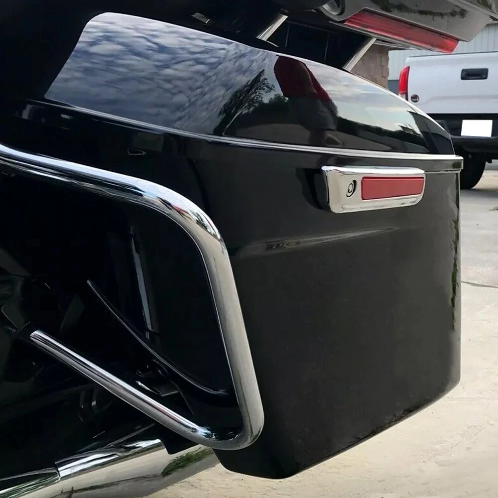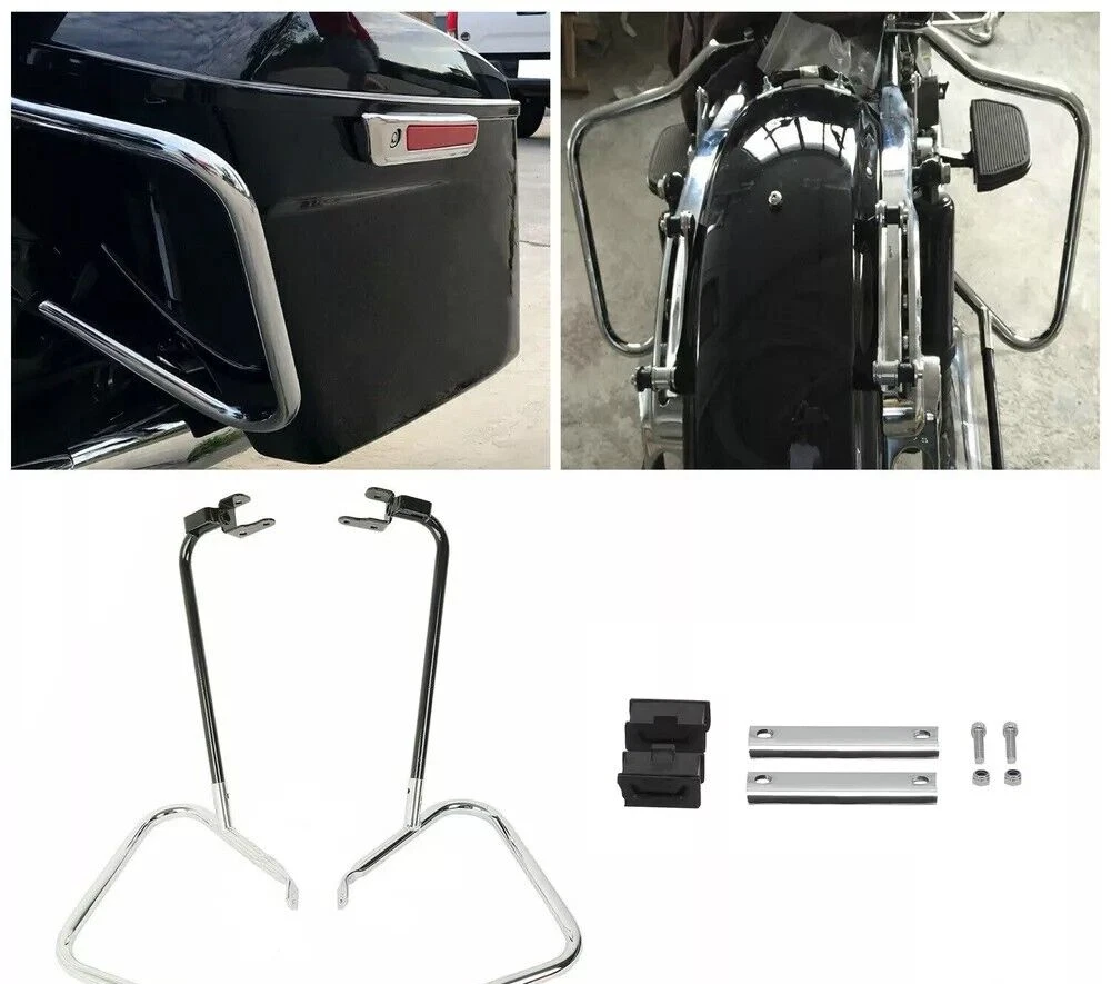 Rear Saddle bag Guard Bracket Crash Bar For Harley Touring Road Glide 2014-2024 Description Aftermarket 100% Brand New High Quality and very durable Easy to install Color: Black & Chrome Material: Steel Position: Rear Specification Custom Fit: Designed specifically for your vehicle, the brackets and covers are engineered for a seamless fit, ensuring a precise and secure fit. Enhanced Protection: These crash bars provide added protection to the saddlebags, helping to prevent damage in the event of a rollover or crash. Stylish Chrome Finish: Chrome plating provides a sleek, polished look that adds style and customization to the overall motorcycle look. Fitment Fits Harley Davidson 2014-later FLHRSE, FLHRXS, FLHT, FLHX, FLHXS, FLHXST, FLHXSE, FLTRU, FLTRUSE, FLTRX, FLTRXS, FLTRXST and FLTRXSE models. Stock on 2014-later FLH, FLHR, FLHRC, FLHTCU, FLHTCUL, FLHTK, FLHTKL, FLHTKSE, FLTRK, FLTRKSE and 2023-later FLHFB models. Does not fit 2023-later FLHXSE, FLTRXSE and 2024-later FLHX, FLTRX models. Package Include 1 set saddlebag supports, left and right guards with mounting hardware