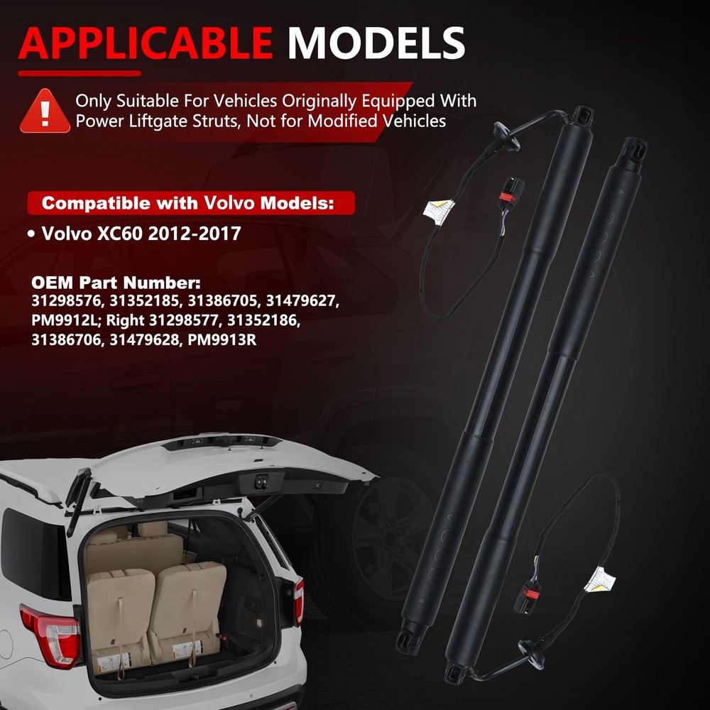 Store Categories Store Categories In the heart of the automotive Power Tailgate Struts Buckup Camera A/C Heater Climate Control Oxygen Sensors Tire Press Monitoring System High Pressure Fuel Pump Master Power Window Switch Battery Current Sensor Shock Struts Suspension Fuel pump assembly Solenoid valve wiring harness Radiator Camshafts Throttle Bodies DEF PUMP Vacuum Pumps Door Handles Fuel Injectors Lifters & Guide Trays Other Cowtotal Autoparts,Your Best Aftermarket DIY & DIFM Partner. Product Description Pa cka g e includes: 2 Left Power Tailgate(Left Side Only fits Power Opener Model ) Fitme nt : (For Reference Only) Volvo XC60 3.2/T5/T6 Sport Utility,T6 Ocean Race 2012 2013 2014 2015 2016 2017 Features: 100% test before shipping to ensure product safety, stability and durability. OE Qualify Guaranteed.From manufacturer that maintains complete strict quality control. Direct-fit replacement ensures proper fit, form, and function. Plug and play design ensures ease of installation. Designed to meet Federal Safety Standards. Specifications: Condition: Brand New & Perfect Packed Quantity: 2 Struts Part Number: 31298576,31298577,31352185,31352186,31386705,31386706,31479627,31479628 N ote: Pleas e Check Carefully To Make Sure the OE Number And Picture are Exactly Listed Are The Same As Your Orignal One. If You are Not Sure Whether It Fits, Please send VIN number to us. No Instruction Included, professional installation is highly recommended . Payment Policy Shipping Policy Returns Policy Warranty Payment Policy 1. We accept Paypal, Credit Card, Veno,Goggle Pay,American Express,Discover, Direct Debit, VISA, eCheck, or othe r methods, please kindly check Paypal for more information. 2. For multiple purchases, please add items to your Ebay shopping cart and pay once for entire order. Shipping Policy 1. All items will be shipped to buyer's ebay address. 2. All items will be shipped within 24 working hours upon receipt of payment, and multiple items might be combined shipping. 3. In most cases, delivery takes around 3-7 business days, it's highly depended on the efficiency of the shpping carrier. If your item doesn't arrive on time, please contact us immediately for further assistance. Please note there is no local pickup service available. 4. We do appreciate your purchase here. If you are astisfied with the item as well as our service, please kindly leave us a Positive Feedback to help develop our bu siness. Th ank you in advance. Returns Policy We have a friendly and dedicated customer support teams to handle any problems you come up with our products. Please contact us first via email or message for replacement, refund or technical problem caused by any reason. Warranty 30 Days Free Return and Money Back Guarantee. If you are not satisfied with your purchase, you can return the item with original packaging back to us for full refund, not any re-stock fee. The return cost should be paid by buyer. 5 Year Unl imited Mileage Quality Guarantee If you receive any w rong items, or damage during the transportation or defect items, we will accept the return and pay the return freight. Please noted that the return cost should be prepaid by buyer, we will issue the refund of return cost to buyer after inspecting the faulty item. The full refund or replacement will be available for all faulty items, including the original shipping cost. Please kindly contact us b efore return, our representatives will send you the detailed return instruction. The guarantee will be only for the cost of the item, we will not responsible for installation or other fees like labor expenses, towing expenses, additional repair expenses or other related expenses. Copyright © 2023 Dianxiaomi