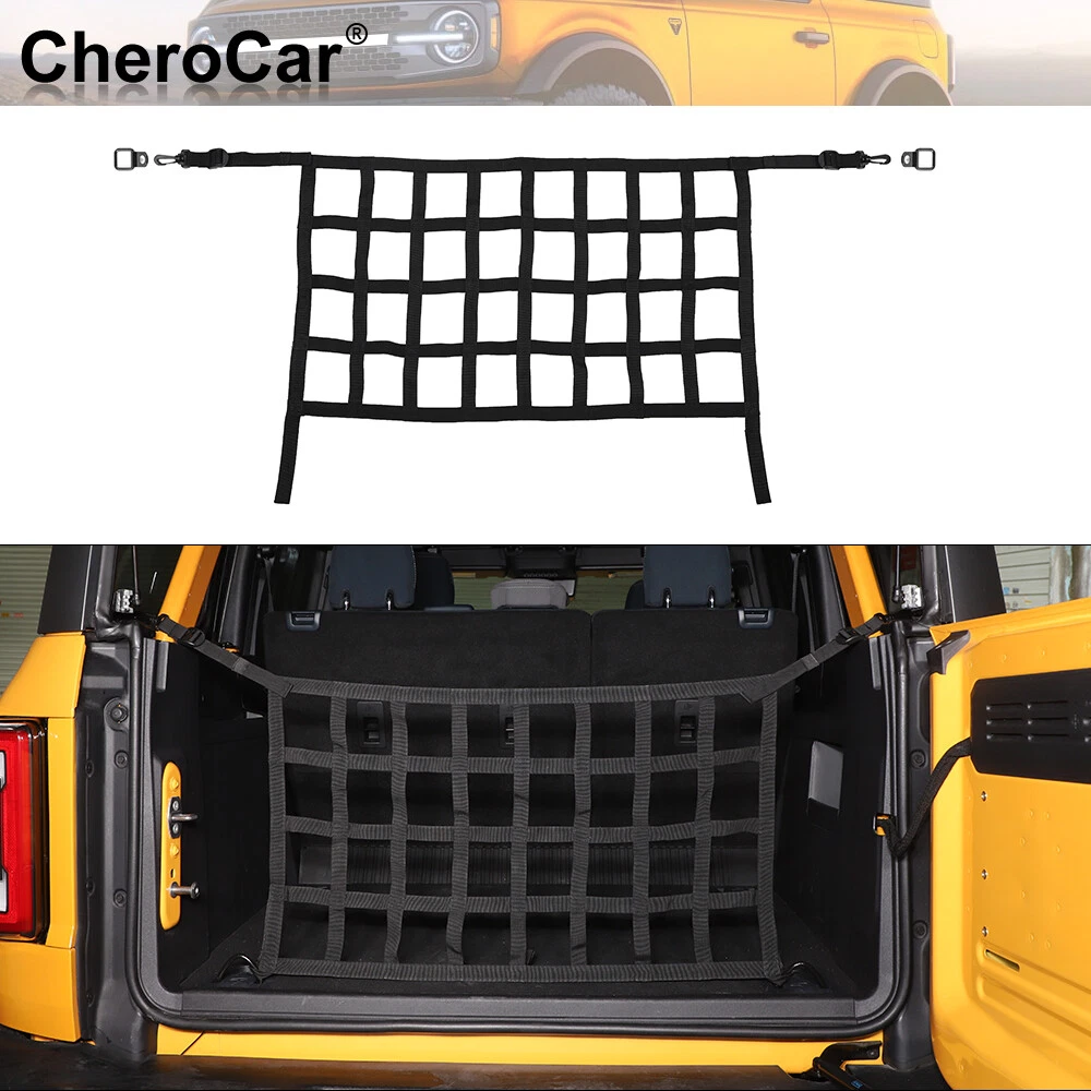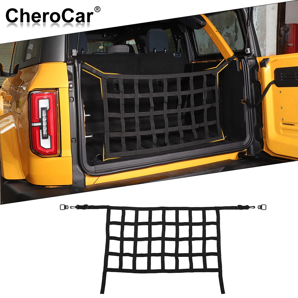 Manufacturer Warranty: 1 Year Feature 2: Easy installation that takes couple of minutes Type: Rear Trunk Organizer Cargo Mesh Accessories Material: Oxford cloth OE/OEM Part Number: 20241120US10QWE01 Color: Black Feature 7: A great upgrade for your vehicle Delivery Options: Free Shipping Refund policy: Free Return Fit: for Bronco 2021+ 4 Door Manufacturer Part Number: 20241120US10QWE Features: Durable, Easy Clean, Easy Installation Package include: 1pc Rear Trunk Organizer Cargo Mesh Net Feature 4: 1 Year Warranty, no questions asked money-back Feature 1: Original size design fits perfectly Feature 6: Improves the look and style of the vehicle Placement on Vehicle: Interior, Inner, Rear Brand: CheroCar UPC: Does not apply Feature 3: Made with high quality durable materials, durable Brand Type: Aftermarket Branded Feature 5: No modification required to install this product gtin13: Does not apply Fitment Type: Direct Replacement