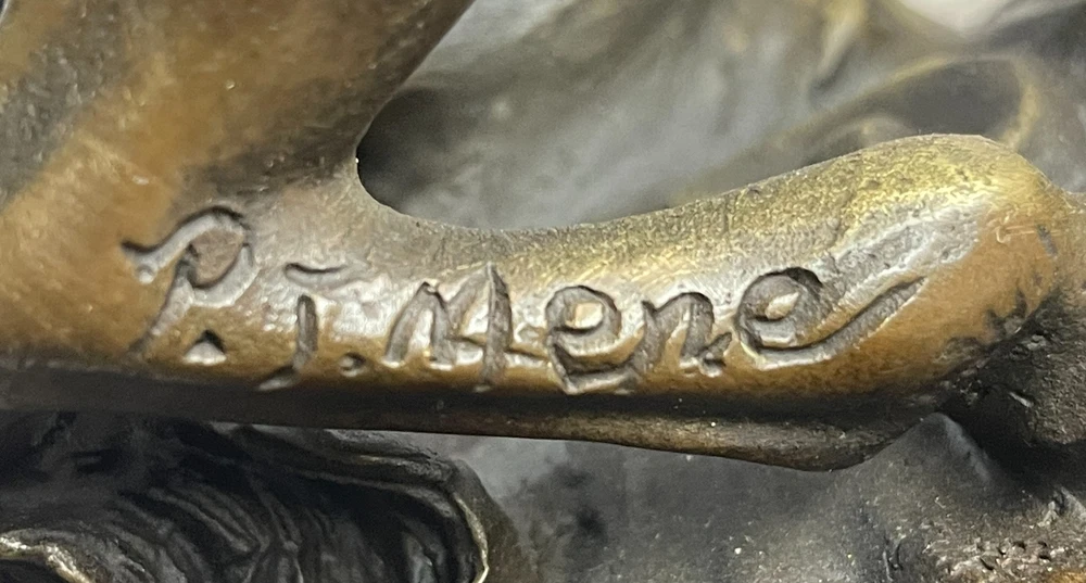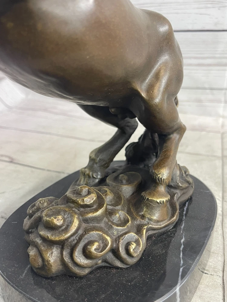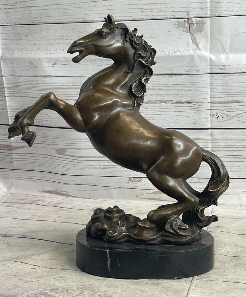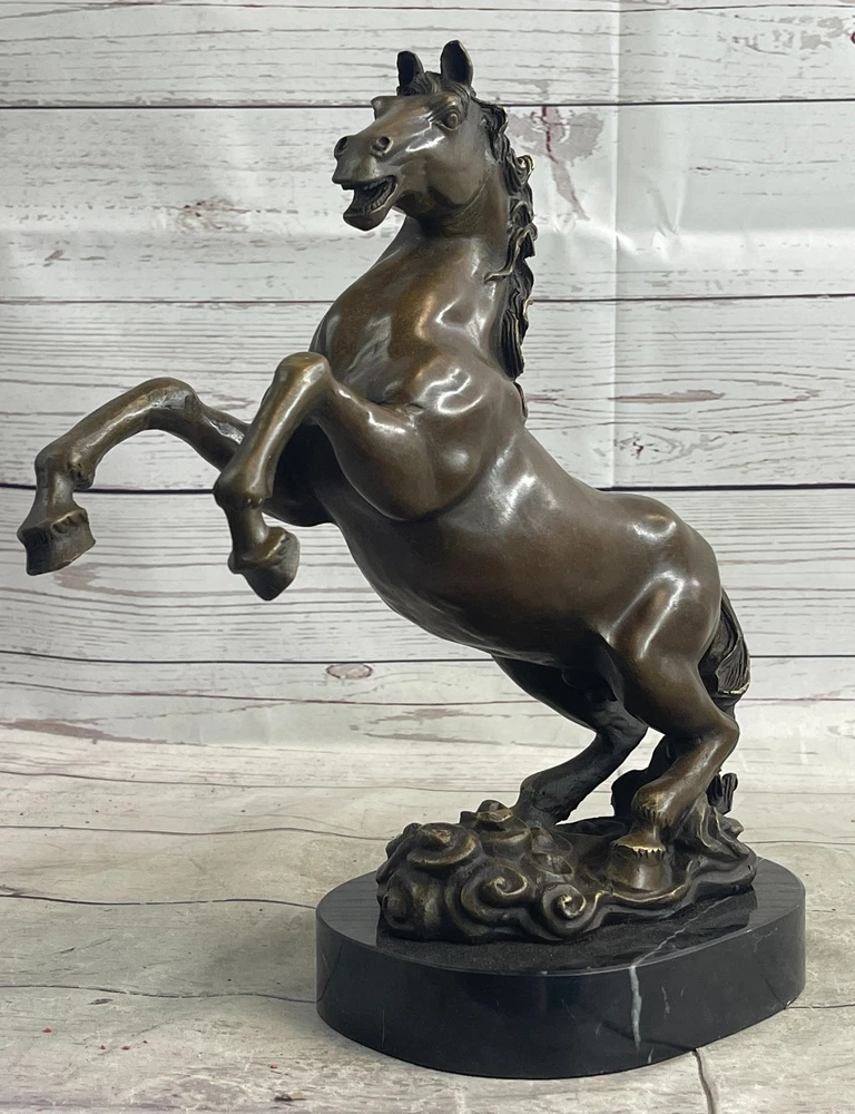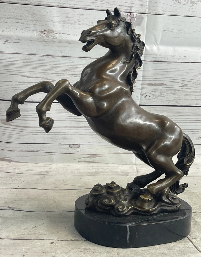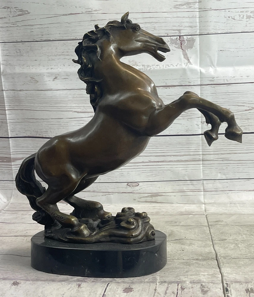 Rearing Stallion Horse Bronze Sculpture Statue Equestrian Horses Decor Artwork Rearing Stallion Horse Bronze Sculpture Statue Equestrian Horses Decor Artwork Condition : This sculpture is in perfect condition. Bronze Dimensions with Marble Base: Height 12" x Width 12" Marble Dimensions: Diameter 6.5" Height without base: 11" Weight: 12 LBS Inventory: 62YDW0916226 Experience the raw energy and untamed spirit of a rearing horse with this striking bronze sculpture. Frozen in a moment of both fear and excitement, the horse's powerful physique is on full display as it rears up on its hind legs. With its mouth agape, a thunderous neigh echoes through the air, serving as both a warning and a testament to the animal's wild nature. Captured in exquisite detail, this 100% bronze sculpture was painstakingly crafted using the age-old lost wax method. Every sinew and muscle of the horse's body is meticulously rendered, preserving the authenticity of this iconic equine pose. Mounted upon a sleek black marble base, the sculpture exudes a sense of strength and elegance, making it an ideal addition to any art collection. The signature of the esteemed artist, P.J. Mene, adorns this sculpture, reaffirming its quality and artistic value. This bronze masterpiece is not only a stunning representation of a rearing horse but also a symbol of the untamed spirit and primal beauty found in the animal kingdom. Display it proudly in your home, office, or gallery, and let it serve as a powerful reminder of the majestic and awe-inspiring world of horses. Rearing Horse Trainer Equestrian Artwork Art Bronze Marble Statue Sculpture Sale www.bronzhaus.com Video will open in a new window Using the eBay App? Paste link into a browser window: [isdntekvideo] Shipping Terms : Most of our items are shipped via USPS (United States Postal Service) mail or UPS. Most orders are shipped within 24-48 hours of purchase. Please be aware that not all items are available for USPS shipping due to size and weight. We do ship to Hawaii, Alaska, Canada, Puerto Rico, APO/AE, and U.S. Virgin Islands, however, an additional charge may be required. Please contact us before making any purchases in these areas. For Non-USA customers, you may be responsible for all duty, tax, brokerage fees that may be due upon delivery (shipping costs cover freight charges only). We also ship internationally. Please refer to the "Shipping and Handling" chart for the rates for each area. Payment : We accept just about any form of payment. PayPal, Master Card, Visa or American Express credit cards. Money orders, cashiers checks, and even personal or business checks. For governmental institutions, we will also accept a purchase order. Please understand that for personal or business checks we have to wait for the check to clear (usually 7 days) before shipping. Condition : New Detailed Hand Crafted Hot Cast Bronze Satisfaction Guaranteed. This is Stock Photo, Slight Color Variation!! Listing and template services provided by inkFrog