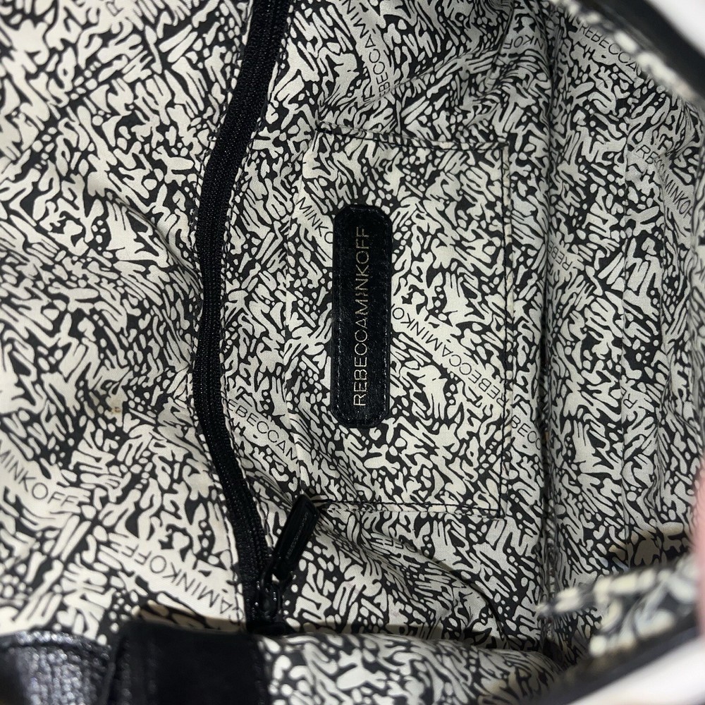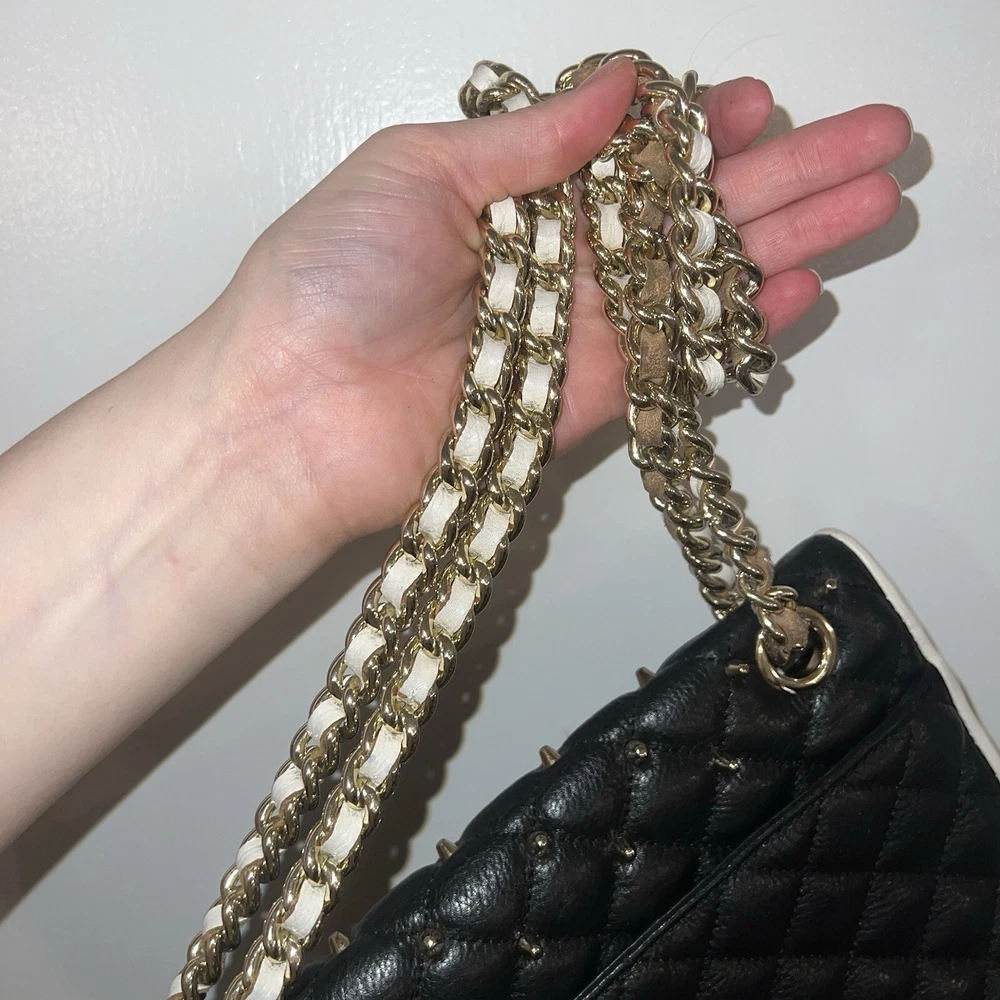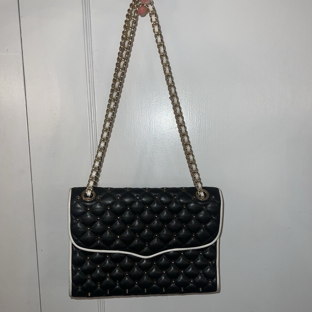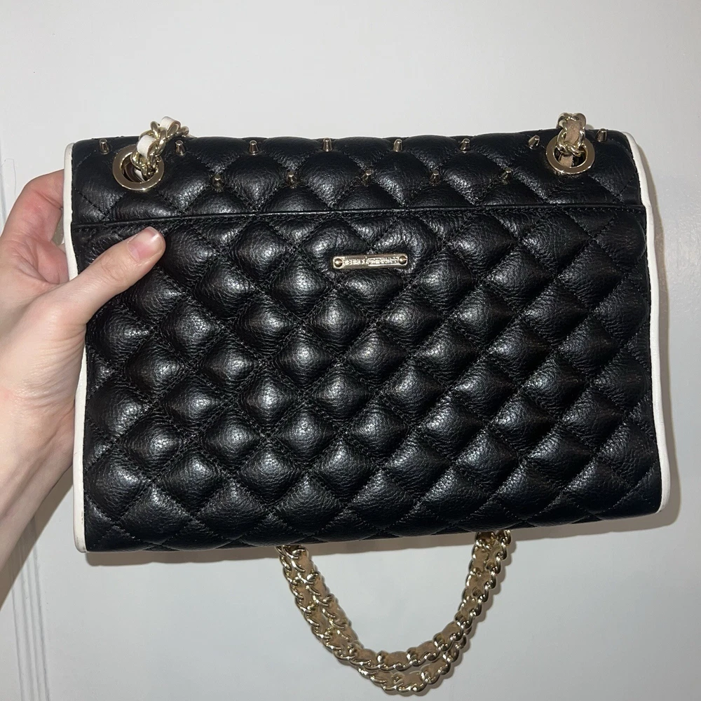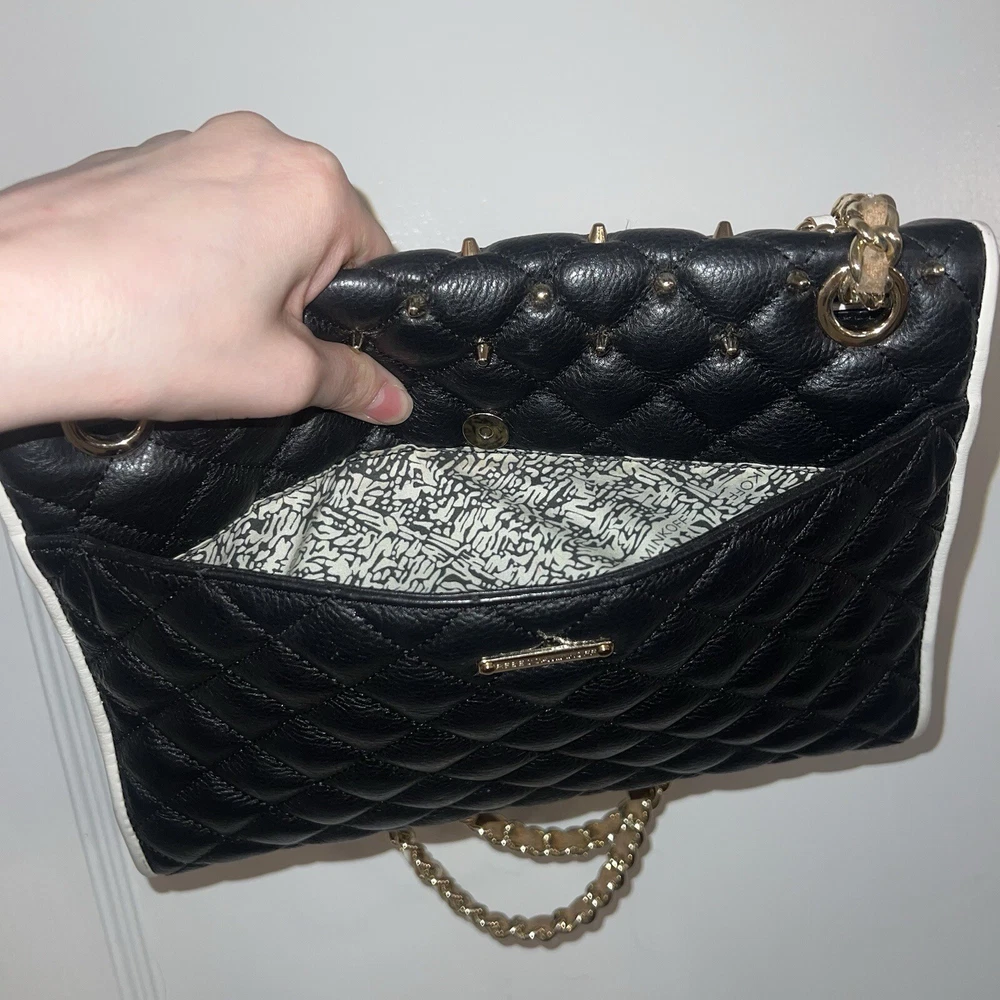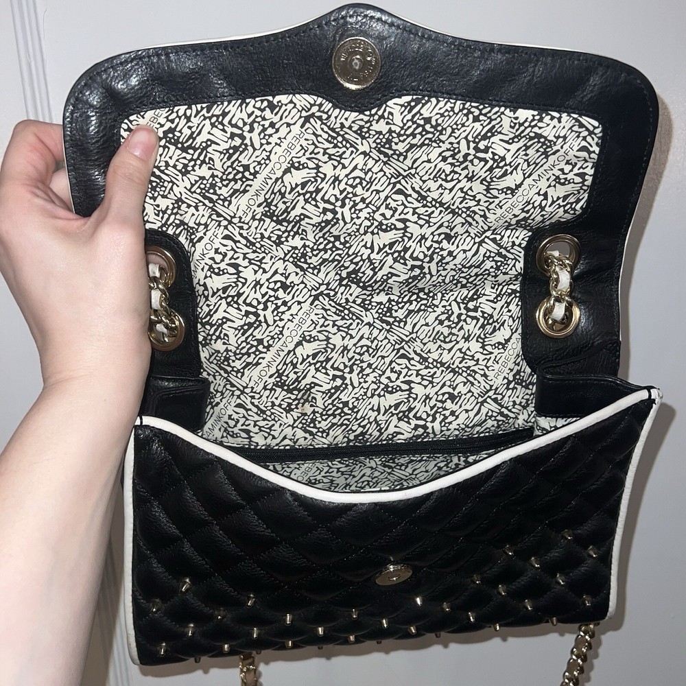 Elevate your style with this stunning Rebecca Minkoff Quilted Affair Studded Purse. The black and white leather exterior is accented with silver studs and gold hardware, while the white lining and handle/strap add a touch of elegance. The crossbody/shoulder style is perfect for on-the-go convenience, and the snap closure ensures your belongings are secure. This purse is brand new with tags and is the perfect addition to any wardrobe. The exterior material is leather and the finish is quilted. The accents of studs and hardware add a touch of edginess to this classic black and white design. The purse is also spacious enough to hold all of your essentials.