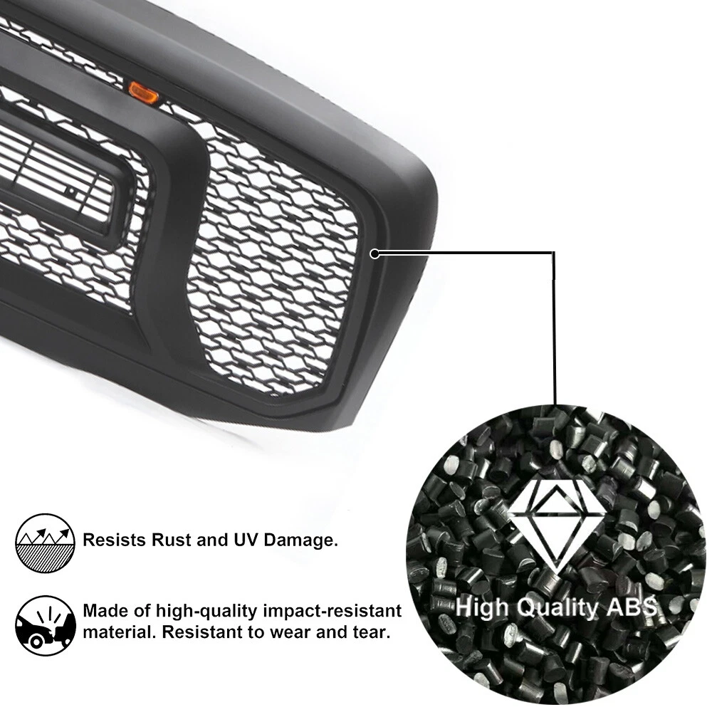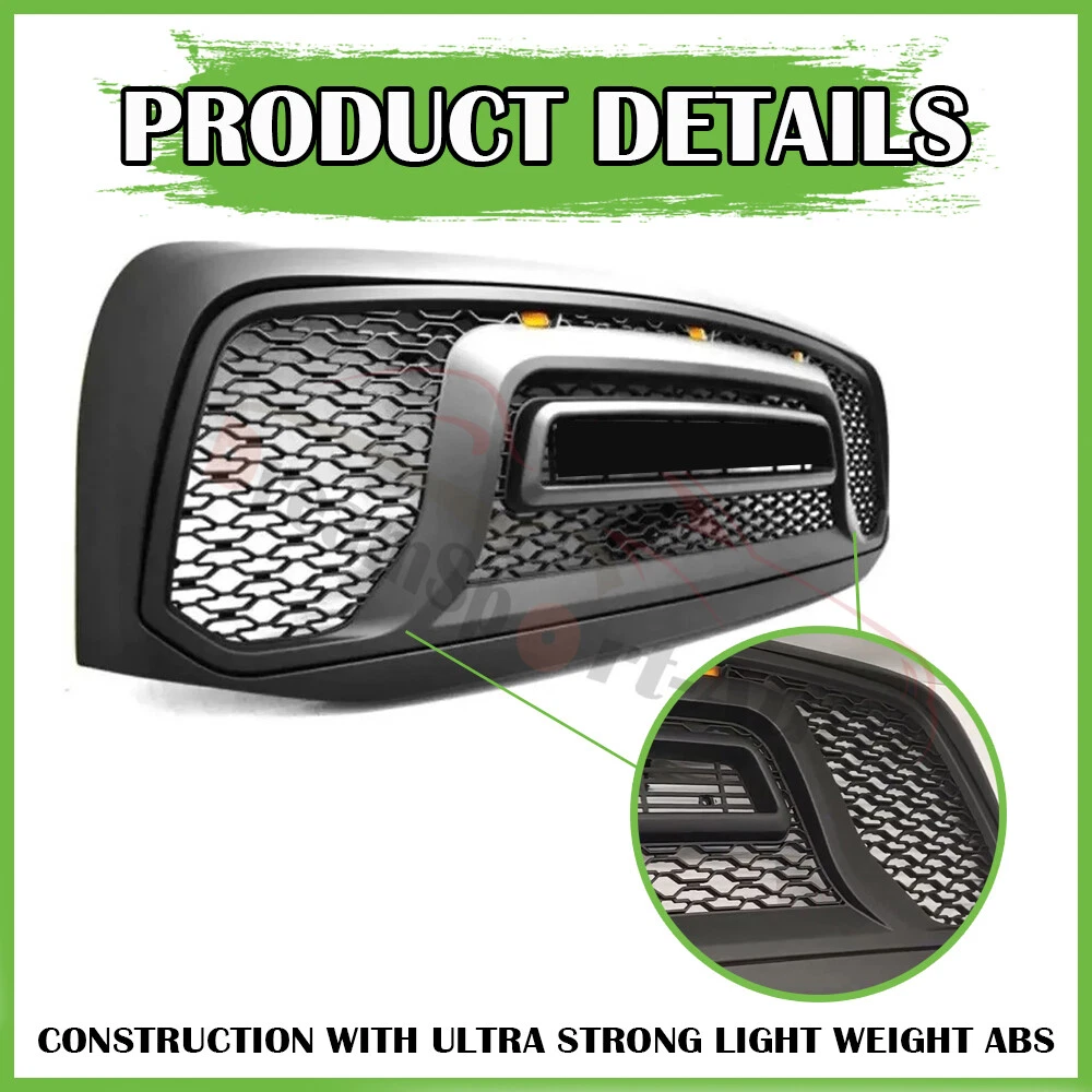 Product Description Rebel Style Grill For Dodge Ram 1500 2006-2008 Front Mesh Grille W/Letter LED FITMENT: For 2006-2008 Dodge RAM 1500 DESCRIPTION: 1,Front Grille is made from ABS with good performance, strong toughness, high rigidity, and superior corrosion proof. 2,The Matte Black finish makes your vehicle outstanding and distinct. Condition: 100% New In the Package Color: Matte Black Material: High Quality ABS Plastic PACKAGE INCLUDE: 1x Grille 3X Letters 3x Amber LED Lights 1x Wiring Harness FEATURES: 1,Premium ABS Material & LED Light The car front grille is made of superior ABS material with high strength and durability, wear-resistance and corrosion-resistance. 2,This Grille also includes 3 high mount amber LED lights, enhancing driving safety. 3,Improves Engine Cooling will prevent debris and or harmful things from damaging radiators while allowing air to pass by and keep the engine running cool. 4,Simple Installation Designed with high standard and precise size, it is a direct fit replacement for the old grille ( it may need modification of original grille brackets. Please get a professional to install it). Professional Installation is Highly Recommended Installation Instruction is NOT Included WE HIGHLY RECOMMEND PROFESSIONAL INSTALLATION!!! About Us Payment Shipping Returns About US *Have any questions,please send us a message and we will help you solve them. *Please do not open the return and dispute at will. Once it is opened, it will affect our view of the specific information of the order, which is inconvenient for us to solve the problem. * If you receive the goods and are satisfied , please give us a good comment, we will give you a good comment; *Do not feel free to give bad reviews, because bad reviews can not solve the problem, only contact us to let us know what problems you encounter, we can help you solve. Thank you. * We specialize in aftermarket performance parts and accessories. Our goal is to strive for the highest level of customer service to ensure the satisfaction of all our customers. * We work hard with our suppliers to find the best products, at the lowest prices from brands that you know and trust. * We have contracts in place with major shipping providers to help ship and deliver our products to the consumer fast and efficiently. Our average processing / handling time is less than 24 hours and about 95% of our shipments arrive earlier than the expected arrival dates. Based on eBay new policy,We accept payment by PayPal only. PayPal enables you to send payment quickly and securely online.We do not accept other payment methods. 1、Tracking number will be emailed to you once we have shipped your order.If there is any delay,it may be caused by bad weather or custom inspection.If you still can not receive the item with in 7 Days,please contact us.You can track your parcel on the following website using your tracking number: 17track (Copied to the browser to open) 2、We try our best to make you get desired products as soon as possible.In case you receive wrong products due to shipping error,please contact us for exchange or refund.If it is damaged,please refuse to acceot and contact us as soon as possible. 3、We are not responsible for wrong or undeliverable address.Please provide us your full address with Telephone number and make sure your shipping address is correct and deliverable.If you need to change your address,please change it in PayPal first before you pay. 30 Days Return & Exchange Policy: * We give you a 30 days money-back guarantee to return any items purchased, no questions asked, hassle-free. * You can return for refund or exchange same product or different product (difference of price will be charged) within 30 days after you receive the item. * Any returning or exchanging items must be in the original package and new condition. We reserve rights to refuse refit or damaged items (caused by buyer) for return and exchange. * No returns will be accepted if you contacted us after 30 days of receiving the item. * Return fee: Buyers are responsible to pay the return shipping fee. 15% restocking fee on total price will be charged and be deducted from the refund total. * Exchange fee: No restocking fee will be charged, however Buyers are responsible to pay the return shipping fee and exchange reshipping fee , depending on the weight of merchandise. * Email our Customer Service Department first before return the item back . Please specify your item number, your eBay ID, and the reason for the return. 60 Days Warranty Policy * Defective Return & Exchange : To help process this faster, please provide detailed description explaining the problem and attach photos of damaged products as well. If we authorize the return, you will be receiving an email with instructions on the return. * We give you a 60 days warranty to exchange any defective items. Within 3 days after you receive the item, Pre-paid return label or shipping fee will be provided if it is necessary. After 3 days, buyers are responsible to pay the return shipping fee to send item back to us. We will cover the replacement shipping fee. Defective products only can be exchanged for the exact same product within 60 days after the date of sale. No exchange will be accepted if you contacted us after 60 days of receiving the item. 1.Huge selections of car parts for you. Best quality with factory price. 2.Please contact us if you have any questions. About Us *Have any questions,please send us a message and we will help you solve them. *Please do not open the return and dispute at will. Once it is opened, it will affect our view of the specific information of the order, which is inconvenient for us to solve the problem. * If you receive the goods and are satisfied , please give us a good comment, we will give you a good comment; *Do not feel free to give bad reviews, because bad reviews can not solve the problem, only contact us to let us know what problems you encounter, we can help you solve. Thank