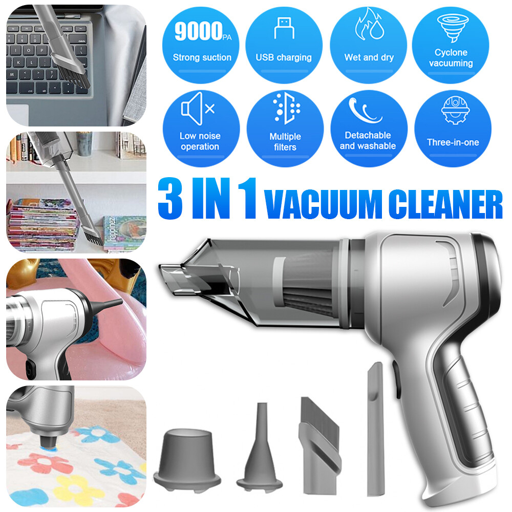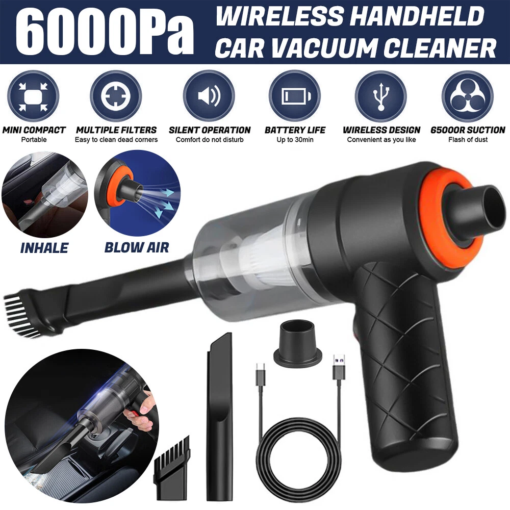 A:9000Pa Vacuum Cleaner Feat ure : HIGH POWER SUCTION : Our portable small vacuum cordless rechargeable is equipped with a digital high-speed motor, its battery capacity is 4000mAh which only takes 3-4 hours to charge once and can be used for half an hour. The strong motor can provide up to 9000pa powerful suction, which can easily clean dust, pet hair, sand, food residue, little liquids, debris hidden in cushions or sofa. It's a perfect gift for families or friends! MULTI-PURPOSE CORDLESS VACUUM : The small vacuum cordless rechargeable has an Ergonomic handle, light-weight and cordless and one-touch starting design, built-in high-efficiency motor, this is a multifunctional wireless vacuum specially designed for cleaning the car, home, and office. It is not only a small vacuum cleaner hand-held but also a practical air pump and blower. Able to inflate swim rings, and deflate storage bags. Help to make a fire with air-blow function on outdoor camping. HIGH-QUALITY DETAILS DESIGN: The cordless vacuum use a washable and reuse HEPA filter. And equipped with a dust collection cup, which adopts a double buckle design to effectively prevent the dust cup from falling off during use, rotate disassembly after use, quick dumping of garbage, convenient for cleaning and next use. CONVENIENT CORDLESS FEATURE: The small vacuum cordless rechargeable, lightweight and portable, without the trouble of clumsy and tangled wires, which can help you easily clean all places. The portable vacuum has a premium HEPA filter, good air permeability, washable and reusable. You can easily remove the HEPA filter and clean it. Note: Remember to dry it before putting it back in the vacuum. Specifications: Material: ABS Rated voltage: DC 7.4V Vacuum degree: about 9000Pa for wireless charging models Rated speed: 36000rpm/min Lithium battery battery capacity: 2*2000mAh Charging method: 5V USB boost charging cable Rated power: 120W Product noise: ≤84dB Operating temperature: -20℃~+50℃ USB cable length: about 1m Packa ge Included: 1x Handheld Vacuum Cleaner 1x Washable Filter 1x Slit Nozzle 1x Multifunctional Brush 1 x Pumping Port 1 x Blowing Nozzle 1x USB Charging Cable Note: 1. The filter must be installed when using 2. Do not expose to direct sunlight, and do not use in places with high temperature and high pressure 3. Do not wipe the body with gasoline or strong volatile detergent 4. The front shell cannot be removed when the motor is rotating 5. This product is a vehicle tool, and it is forbidden for children to use it alone to avoid danger 6. When absorbing moisture, pay attention to the water height of the front cover 7. When removing foreign matter in the gap, please put on the duckbill straw 8. Under normal conditions, it can usually be used for half an hour and has no effect on the car battery. 9. After using this product, please turn off the switch, *when removing the objects from the net bag, press the fastening button, and then pour out the foreign objects. B:6000Pa Vacuum Cleaner Feat ure : 1. Material: Using high-quality ABS material + electronic components, upgraded temperature control technology, no heat after long-term use, effective and fast suction of stubborn dust 2. Design: Lightweight design, change the gravity design, as light as 213g, you will not get tired when holding it for a long time, making cleaning a kind of enjoyment 3. Reuse: Nano dust-locking filter is used, which can be washed repeatedly, breathable and dust-proof, and more environmentally friendly after repeated use 4. Bass operation: Acoustic noise reduction design, sound <68 decibels, comfortable operation without disturbing, cleaning without worrying about affecting family rest 5. Charging method: smart USB charging interface, compatible with a variety of charging methods, notebooks, charging treasures, computers, etc., charging and using 6. Long-lasting battery life: built-in large-capacity lithium battery, 2000 mAh battery, can be used continuously for more than 30 minutes, easy to deal with daily cleaning 7. Applicable to: gaps in the car, sofa carpets, desks, computer keyboards, bookshelves, hair on the bed, drawers, pianos, etc. can be used in various scenes that cannot be cleaned Specific ation : Name: Wireless Vacuum Cleaner USB Rechargeable Handheld Mini Car Vacuum Cleaner Colour: Black Rated voltage: 7.4V Rated power: 120W Rated speed: 2000 (r/min) Vacuum suction: about 6000 Pa Dust cup capacity: 0.1L Charging method: Type-C charging Battery: built-in rechargeable lithium battery Battery capacity: 2000mAh Charging time: 3.5h Battery life: about 15minutes Product size: 18.5*5.5cm Product net weight: 213g Packa ge list: 1*vacuum cleaner 1*suction nozzle 1*hair brush 1*blowing hole 1×filter 1*charging cable 1*manual Instr uctions for use: 1. Check whether the charging is sufficient, and the filter must be installed when using it 2. Just turn on the switch, the front cover cannot be removed when the motor is rotating 3. Replace different suction nozzles according to different usage occasions 4. If the vacuum cleaner is dirty or the suction is not strong, please clean the filter in time to ensure the normal operation of the vacuum cleaner 5. Do not expose to direct sunlight, and do not use in places with high temperature and high pressure