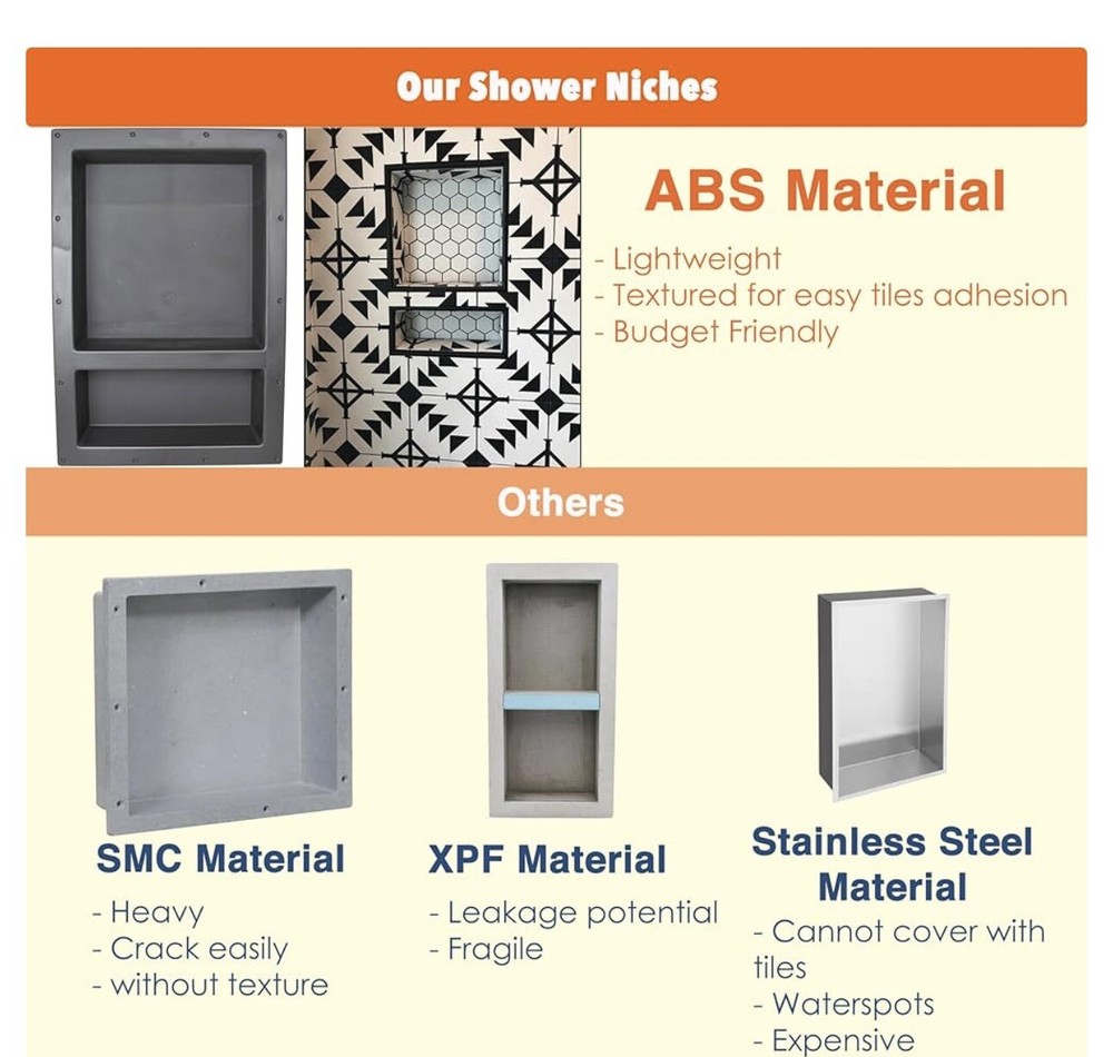 Durable ABS Construction: This shower niche is constructed with lightweight and durable ABS material, resistant to corrosive chemicals and physical impacts. Versatile Installation: The niche can be installed vertically or horizontally, with a pre-fabricated flush-mount design for hassle-free and quick installation. Double Shelf Design: Features two shelves with dimensions of 14" x 12" x 4" and 14" x 4" x 4", providing ample storage space within the compact 16" x 20" x 4" overall dimensions. Waterproof and Leak-Proof: Designed to be 100% waterproof and leak-proof, ensuring long-lasting performance in your bathroom.