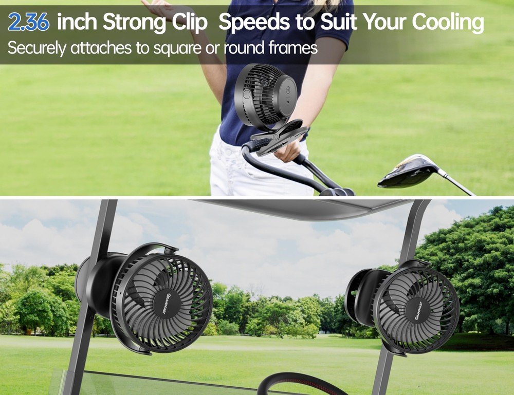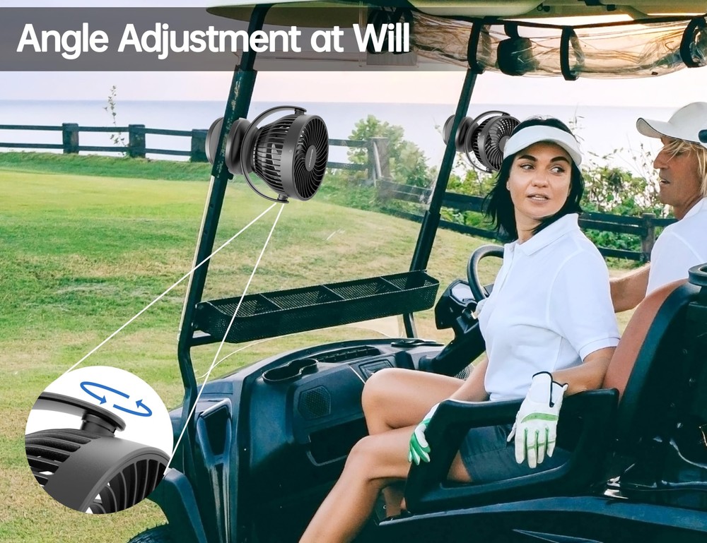 Golf Cart Rechargeable Fan Compatible with EZGO Club Car Yamaha, 4 Powerful Speeds Clip on Fan with 360° Pivot, 13 Hrs Run Cordless Fan, Battery Operated Fan for Golf Cart Push Cart Rechargeable Battery: With a 4000mAh battery, this golf cart fan runs up to 13 hours on low and fully charges in just 3 hours, 4 indicator lights keep you informed of power levels for timely recharging, ensuring comfort and performance throughout your game More Stable: Featuring a 2.36-inch strong clip, this clip on fan securely attaches to square or round frames of golf carts like EZGO, Club Car, or Yamaha and golf push carts, staying firmly in place even on rough terrain Small Yet Powerful: Equipped with an upgraded brushless motor, this rechargeable golf pro fan delivers strong airflow with 3 speeds to suit your cooling needs—perfect for the golf cart, course, or clubhouse Easy to Install & Clean: Simple alligator clip design allows this batter operated fan install and remove in seconds, while the removable front cover makes cleaning a breeze. The 4.92ft USB-C cable makes charging effortless, easily reaching your golf cart's USB port Angle Adjustment at Will: Stay comfortable from every angle with the 360° pivot of this cordless fan, letting you direct airflow wherever you sit in the golf cart for quick cooling Golf Cart Rechargeable Fan Compatible with EZGO Club Car Yamaha, 4 Powerful Speeds Clip on Fan with 360° Pivot, 13 Hrs Run Cordless Fan, Battery Operated Fan for Golf Cart Push Cart Shipping We offer FREE shipping on all orders! We ship within Three business days of payment, usually sooner. We use a selection of shipping services such as UPS, FedEx, USPS etc. We only ship to the lower 48 states, no APO/FPO addresses or PO Boxes allowed. Local pickups and combined shipping options are not provided at this time. Return You can return a product for up to 30 days from the date you purchased it. Any product you return must be in the same condition you received it and in the original packaging. Please keep the receipt. Payment We accept payment by any of the following methods: PayPal Please pay as soon as possible after winning an auction, as that will allow us to post your item to you sooner! Feedback Customer satisfaction is very important to us. If you have any problem with your order, please contact us and we will do our best to make you satisfied. Contact Us If you have any queries, please contact us via ebay. We usually respond within 24 hours on weekdays. Please visit our eBay store to check out other items for sale! Thank you for shopping at our store.