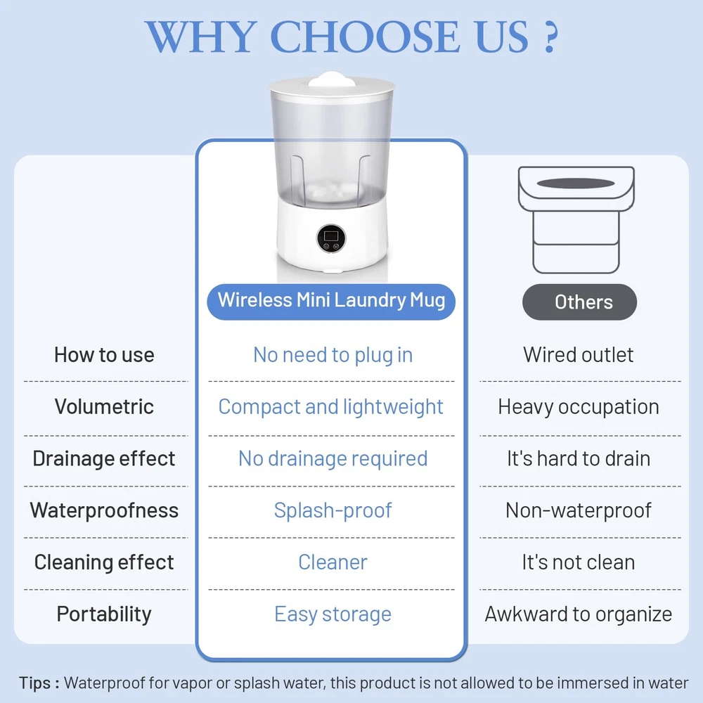 Underwear Washing Machine - Rechargeable Dual-Bucket Mini Washing Machine w/ 1.5L Isolated Tubs, Bionic Hand-Wash Tech for Travel, Camping, Dorm | 3 Modes, 3000mAh 【Dual-Bucket Hygiene System & Zero Cross-Contamination】 Revolutionize laundry hygiene with two completely isolated washing cups (1.5L each). Unlike traditional "sequential washing," our exclusive dual-bucket design ensures 100% separation for underwear, socks, and baby clothes – eliminating germ transfer. Perfect for health-conscious homes! 【Ultra-Portable & Wireless Freedom】 Weighing just 1.4lbs (0.64kg) and sized at 6.3×6.3×9.6 inches, this mini washer fits in backpacks, dorm closets, or RV cabinets. The 3000mAh rechargeable battery delivers 80+ mins runtime – no cords, no limits. Take your travel washing machine anywhere! 【Deep Cleaning with Bionic Hand-Scrub Tech】 Patented 360° vortex mimics hand-washing motions (38% gentler than traditional machines). Choose from 3 modes: Quick Clean (5min), Standard (10min), or Deep Stain Removal (15min). Effortlessly removes sweat, oils, and odors from delicates. 【Leak-Proof Hassle-Free Design】 Ditch complicated screw-locks or needing to tighten it very hard by hand with all your might! Our upgraded sealing system works instantly just by easily rotary tightening. Made of food-grade silicone and PP materials, it’s safe for underwear, socks, and baby clothes – just press start and relax. 【Space-Saving Powerhouse for On-The-Go】 Washes 1 bra / 2 briefs / 4 pairs of socks per load. Recharges via USB-C in 2 hours. Ideal for apartments, dorms, camping, and travel. Last but not least, you will get a No-worry 12-month 100% brand new replacement exchange or fully refund for any product quality issues to our portable mini washing machine.