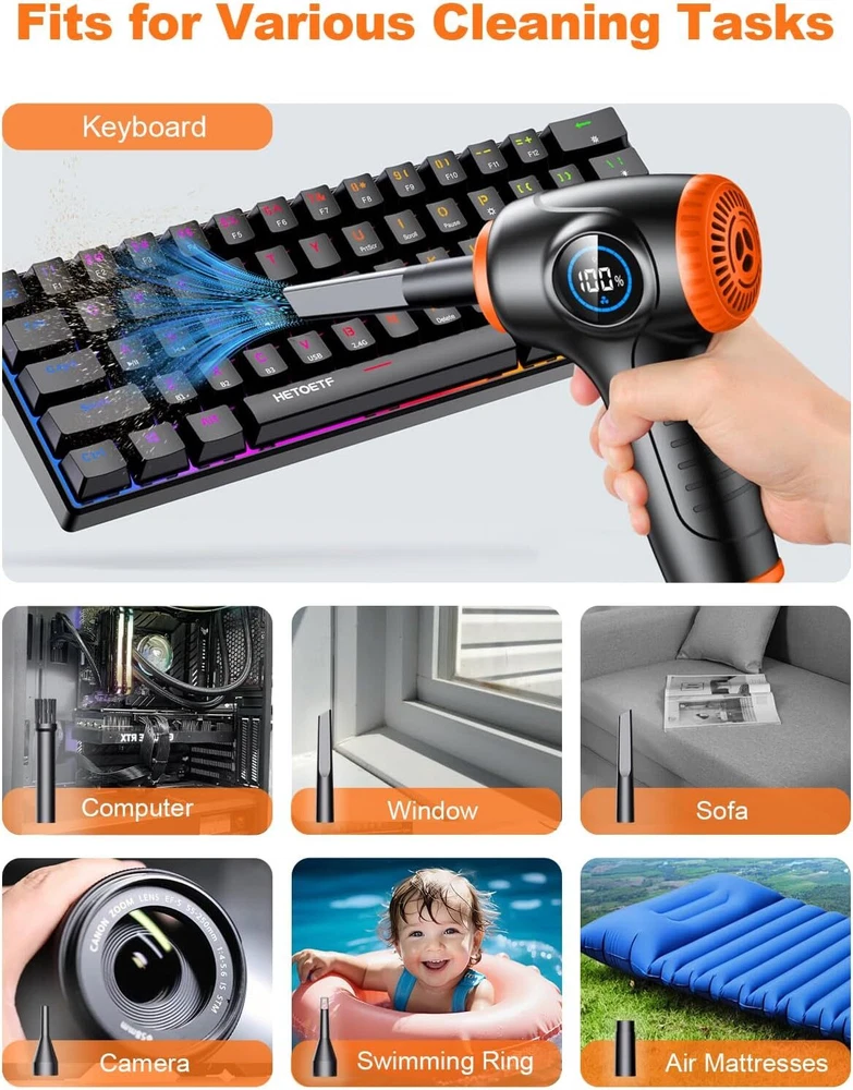 Product Description Compressed Air Duster for PC, Rechargeable Electric Air Duster with LED Light & Power Display, 3 Speeds Max 90000RPM Cordless Air Blower Duster with 5 Switchable Nozzles for Keyboard Car [Adjustable 3 Speed Modes] The compressed air duster is equipped with an upgraded 90,000 RPM high-power motor, providing up to 1.76 ounces of airflow while maintaining noise levels below 90 decibels. With a quick 3-second startup, easily switch between three airflow modes (50,000 RPM, 70,000 RPM, 90,000 RPM) for efficient cleaning of various devices, ensuring dust has nowhere to hide.ensure compatibility with your TV. [Multi-functional Application] With five different nozzle attachments, our air duster is suitable for a wide range of cleaning tasks. Whether it's cleaning dust off a keyboard, tidying up a computer tower, cleaning car seat crevices, or inflating balloons, swim rings, air mattresses, or yoga balls, our multi-functional cleaning tool is up to the task. [Personalized LED Design] The independent LED light button enhances convenience and energy efficiency. When activated, it illuminates hard-to-reach areas, making it easy to remove dust and debris from dark corners. Additionally, the electric air duster is equipped with a large screen for visual appeal and easy monitoring of battery levels. [Excellent Battery Performance] Our air blower includes a USB-C quick charging cable, fully charging within 3-4.5 hours, easily powered by a power adapter, laptop, power bank, or car charger. The upgraded 6000mAh battery offers up to 35 minutes of continuous cleaning power (1st gear: 35 minutes, 2nd gear: 25 minutes, 3rd gear: 15 minutes). [Lightweight & Comfortable] The compressed air for computers measures 6.89 x 4.25 inches and weighs only 550 grams, making it compact, lightweight, and easy to carry. The ergonomic handle provides a comfortable grip. Whether at home, in the office, or on the go, it's an excellent cleaning assistant. About Us We are a reputable seller with many years of experience selling on eBay. Our goal is to provide high-quality products and excellent customer service. Payment 1.We accept PayPal only. 2.All major credit cards are accepted through secure payment processor PayPal. 3.Payment must be received within 7 business days of auction closing. 4.We ship to your eBay or Paypal address. Please make sure your eBay and Paypal address is correct before you pay. Feedback will be left automatically after we receive your feedback. Please contact us before leaving a Negative feedback or Neutral feedback. We would try our best to help you solving any problem. Shipping Items will be shipped within 1-3 business days when we received payment. (Orders are not processed on weekends & holidays) Tracking information will be sent once item is shipped. Delivery time depends on destination and other factors Item is shipped to ebay address. Leaving correct address can minimize delay. For international shipping and shipping to Guam, Hawaii and Alaska, Please contact us before placing the order. International buyers please note: Import duties, taxes and charges are not included in the item price or shipping charges. These charges are buyer’s responsibility. We will try our best to reduce the risk of the custom duties. Local pick-up is unavailable at the moment. Returns For any issues with Defects, Return, Item Exchange request, please contact us first and send us a message first before opening any type of case or request. We devote ourselves making EVERY CUSTOMER in 100% Satisfactory and resolve any problem. We highly value and appreciate your business. Thank you. No returns will be accepted without an RMA number. Please contact us for the RMA number. Return is acceptable within 30 days of delivery. Return for replacement or money back is optional. Returned items must be in the brand new, unaltered and resalable condition. Seller is not responsible for any labor cost, expense in a dealer store, or damage due to wrong installation. Contact Us We reply any email messages within 1 business / working days(off-duty at weekend). If you do not get a response from us, then please check your junk or spam mailbox. Our Business hours: Mon-Fri 9:00-18:00, UTC/GMT +8 hours. Please contact us either by clicking "contact seller" in the "purchase history" section or simply click "ask a question" at the bottom of this page. If you are unsatisfied with our item or service, please contact us before leaving any feedback. We are committed to resolve all issues in a friendly and satisfactory manner. powered by