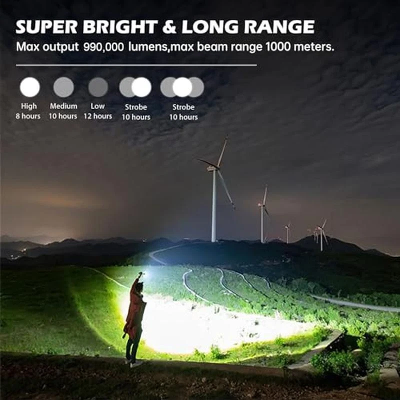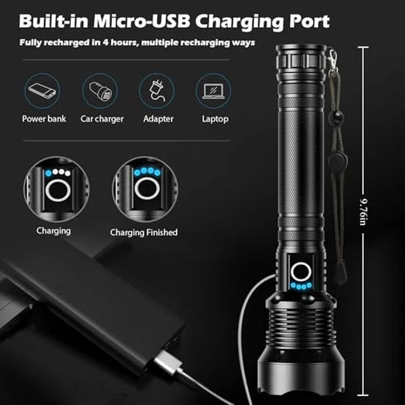 Color: Black UPC: Does Not Apply Features: Rechargeable, High Power, Adjustable Light Modes, Weatherproof, Adjustable Focus gtin13: Does Not Apply Lumens: 990000 Material: Aluminum MPN: Does Not Apply Model: Does not apply Type: Flashlight Brand: Unbranded Power Source: Battery Powered