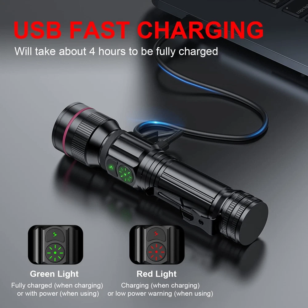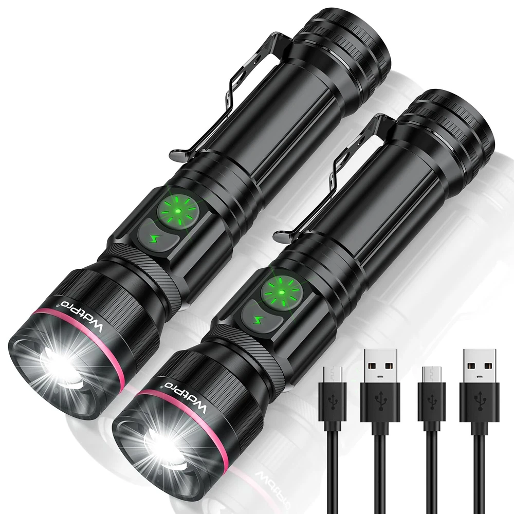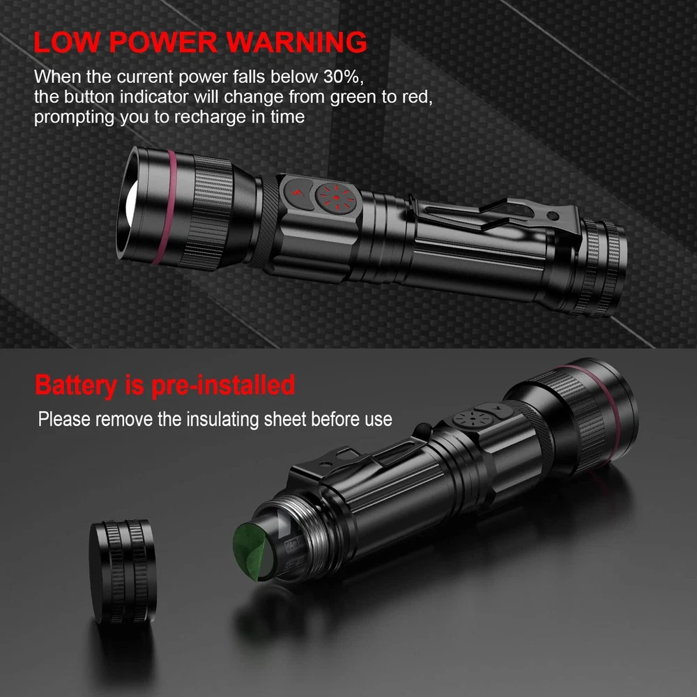 Dual Switch Design & Power Indicator: These flashlights have 2 switches to control 5 light modes, much more convenient. One of the rechargeable flashlight switches is specially designed for emergencies.(Just one-click to strobe, keep you always safe in emergency.) This flashlight has an intelligent low battery warning function to remind you to charge it. When the power is less than 30%, the indicator will turn from green to red. Power indicator will also help you better master charging status Ultra Bright Rechargeable Flashlights: With the upgraded powerful LED chip, the high-lumen tactical flashlight delivers up to 2000 lumens(max). Its ultra-bright beam effortlessly illuminates an entire backyard. Easily zoomable from wide to narrow beam. Also with a pocket-clip for portable carry. It is small & compact enough to fit in your hands, pocket or backpack allowing for easy storage and quick access USB Rechargeable & Long-lasting: You don’t need to be busy replacing batteries constantly, very handy rechargeable flashlight and built-in 2000mAh Large-capacity rechargeable battery, the led flashlight only takes about 4 hours to fully recharge with overcharge protection. A single charge can provide up to 12 hours of continuous runtime in low mode and 3 hours in high mode Reliable & Waterproof: With a solid aluminum built and 3-layers of USB port waterproof protective cover design. Never worry about using the flash light in heavy rain, snow or other extreme weather. Perfect flashlight for use around the house, dog walking, or camping Great Value & 100% Satisfaction: A great gift idea for both men and women. Includes 2 x rechargeable flashlights, 2 x Rechargeable Battery, 2 x USB Cable,1 x User Manual. 90 days money back & 1 years replacement. Friendly customer service. Buy with confidence