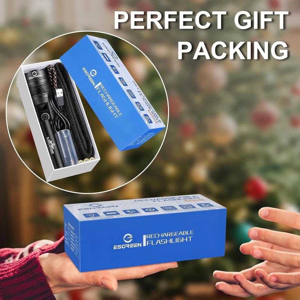 [2024 UPGRADED HIGH BRIGHTNESS & LONG RANGE LED] The ESGREEN ED0330 rechargeable flashlights high lumens is made of a upgraded PH-L330 30W LED which has a feature of high brightness and ultra long beam. The high powered flashlight provides ultra high brightness, it can easily illuminate the whole room and backyard. The ultra strong beam provides high concentration circle beam, so it can easily and clearly focus on objects up to 5000 feet away. It is ideal for camping, hiking, dog walk, riding etc [NEWEST LUMINOUS DESIGN & IMPROVED LCD DIGITAL POWER DISPLAY] Different with others, the powerful flashlight rechargeable is inset 6pcs of luminous strip on the head, it can light up with different colors in dark, with compact handheld size, it looks beautiful and quite cool. It is equipped with a LCD power display that shows remaining battery power exactly, so that you will get known when to charge it in advance. It is the ideal gift for a father, husband, wife or student. [MULTI-FUNCTIONAL 2 IN 1 - FAST USB C CHARGING & DISCHARGING FUNCTION] The handheld LED flashlight high lumens rechargeable is built-in 2 USB interfaces, one is USB C input for charging, the other is USB output which can charge your smartphone, earphone or any other USB devices, it is convenient to get charged in indoor or outdoor activities. [LONG LASTING & OVERCHARGE PROTECTION] The super bright led flashlight is equipped with 1pcs 6000mAh rechargeable battery, so it can provided up to 15 hours of powerful and non-diminishing brightness. Both the battery and flashlight are built-in a smart chip that has the function of overcharging protection to ensure safety. [BRIGHTNESS & FOCUS ADJUSTABLE] According to your needs and the environment, you can adjust the brightness and focus. Press the button to switch light modes, long press for 3s to turn off directly at any mode. There are 5 modes: high-middle-low-strobe-SOS. The SOS and strobe mode are usually used for emergency situations such as car breakdown or get lost at night. Push or pull the head to adjust the focus, it can create brilliant large-area floodlight or perfectly spotlight. [PRACTICALLY INDESTRUCTIBLE & IPX7 WATERPROOF] The led camping flashlight body is made of super hard aviation-grade aluminum alloy, impact resistance, wear-resistant and drop-resistant. It is strong enough to withstand a 10 feet accident drop and even ran over by a truck, it still works! IPX7 waterproof flashlight has a built-in high tenacity seal rubber waterproof ring, so there is no any problem to be used in any bad weather, such as rain or snow. [PACKING LIST & EXCELLENT CUSTOMER SERVICE] You will get 1x heavy duty flashlight rechargeable,1x 365nm UV mini rechargeable flashlight, 1x rechargeable 6000mAh battery, 3x AAA Alkaline batteries,1x USB C cable, 1x holster. We are providing high quality products and the best customer service as our aims. You will be pleasantly surprised by the brightness, quality, longevity and performance of the high power flashlights. If you have any questions about this flashlight, please feel free to contact Product Description The video showcases the product in use. The video guides you through product setup. The video compares multiple products. The video shows the product being unpacked. 1 Full Packing List 2 UV Flashlight Included 1 Wide Beam-Flood 2 Narrow Beam-Spot 1 Waterproof 2 Heat & Cold Resistance 3 Shockproof 1 USB Charging/Discharging 2 Long Lasting