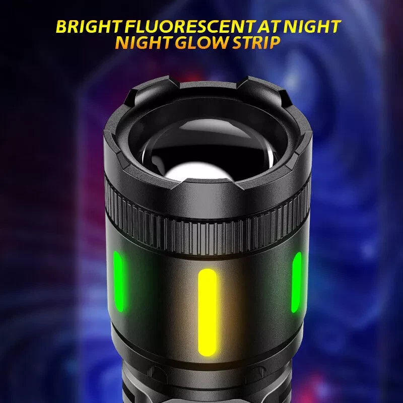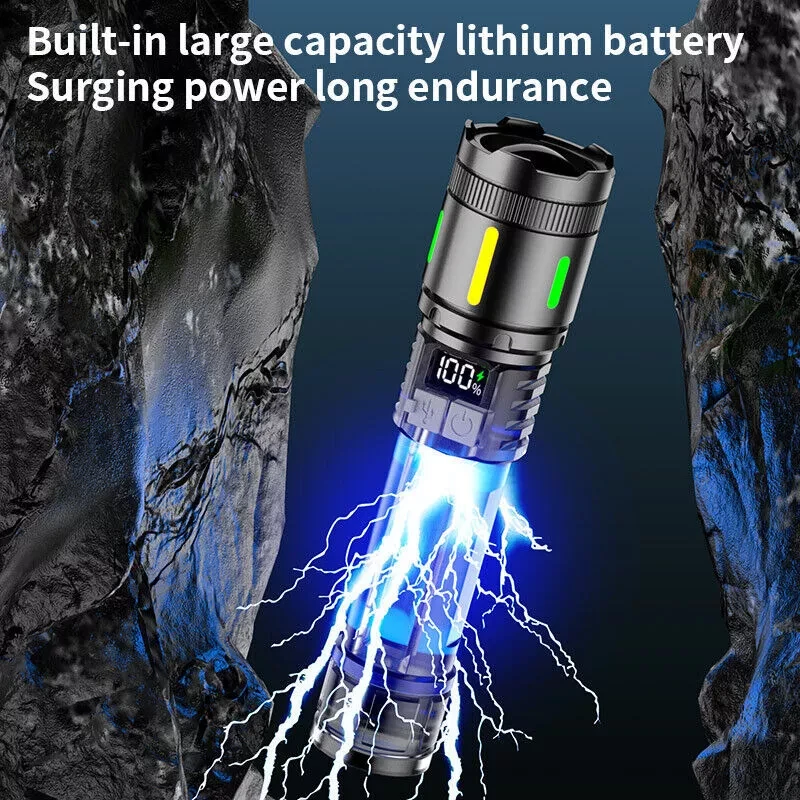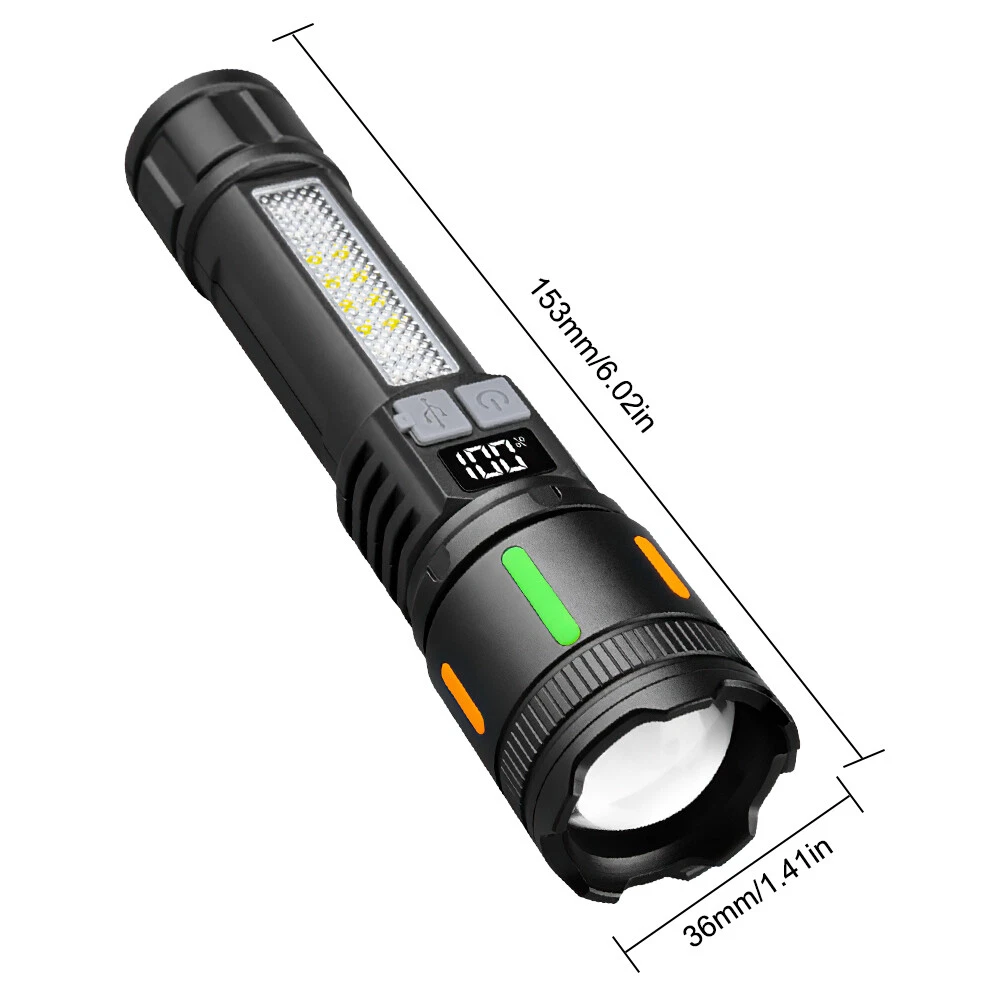 ☀ 【 99,000,000 Lumens Super Bright Rechargeable Flashlight 】 Equipped with upgraded efficient laser Chip LED chips, rechargeable flashlight emits a stable and super bright lighting. Since the light penetration is stronger than other same-level lamp beads', its beam can pass through dust and fog well, especially suitable for foggy and rainy days with low visibility. It can focus on objects up to 3700 feet away. ☀ 【 5 Light Modes & Zoomable Focus 】 There are 5 modes of rechargeable flashlight: High / Low / Strobe for the main light, and White / Red&Blue Strobe for the COB side light. Equipped with zoomable head, the small rechargeable flashlight high lumens can emit a powerful focused lighting and an extensive extended lighting by adjusting the light head. ☀ 【 USB C F ast Charging & Power Indicator 】 Built-in a rechargeable lithium-ion battery and equipped with more energy-efficient chips, the rechargeable flashlight battery powered working time is up to 7 hours with the low mode. The USB C fast charging input achieves 30% reduction in charging time. It can be charged by power bank, USB plug, etc, with the USB C charging cable. You can clearly see the remaining power at the digital power indicator. ☀ 【 IPX6 Waterproof 】 This flashlight head adopts the high grade black aluminium alloy, and the frame adopts the ABS plastic. The waterproof grade of this flash light reaches IPX6 Waterproof. This rechargeable flashlight is non-slip, shockproof, waterproof, rainproof, dustproof. It can work well in severe outdoor weather conditions, such as rain and snow. It is an ideal outdoor handheld flashlight for working, hiking, camping, repairing, hunting, and Sogidon fishing. ☀ 【 Easy to Carr y 】 Led flashlight is equipped with lanyard, which can be hung on your wrist. As its compact design, you carry this small handheld flashlight in your pocket or the car glove compartment.