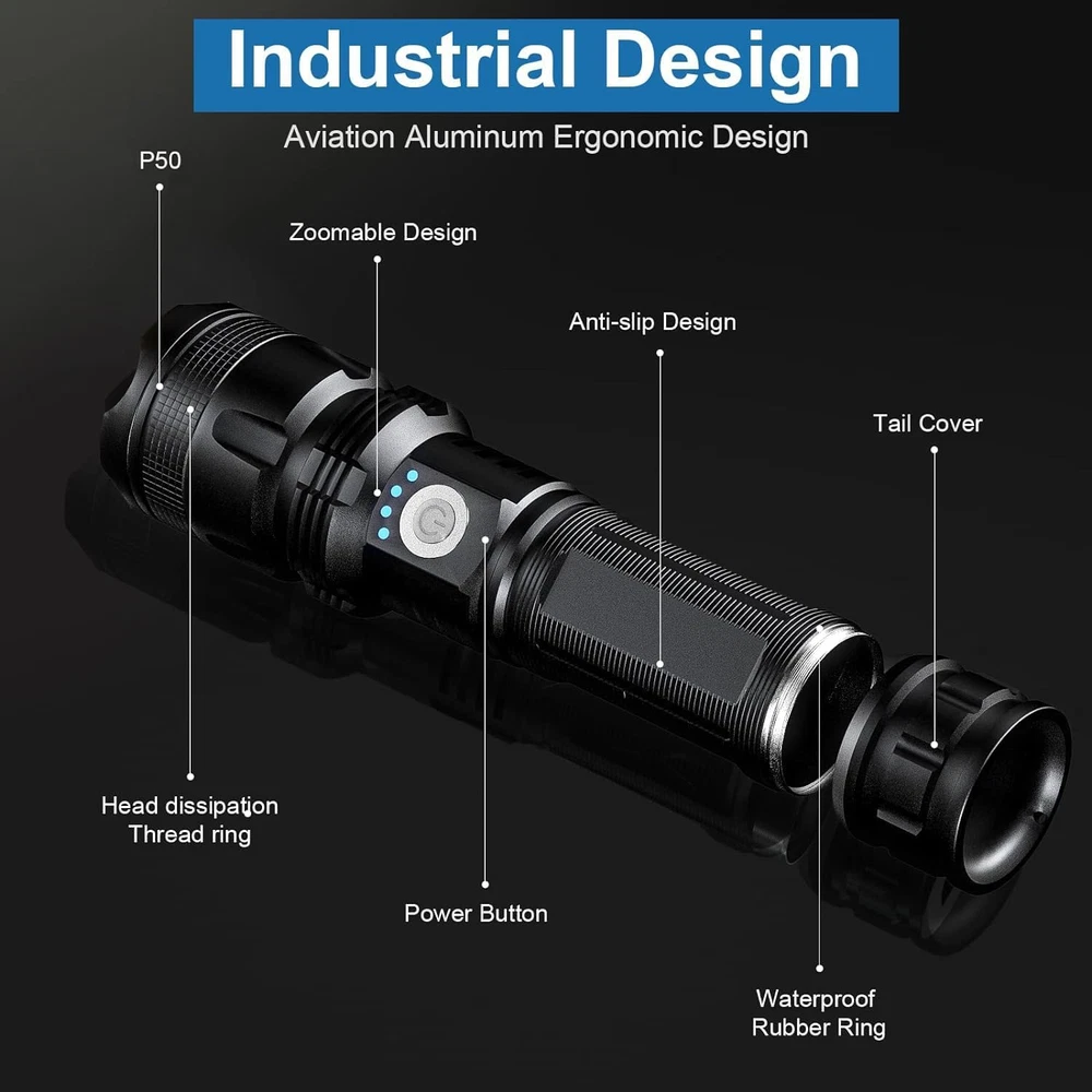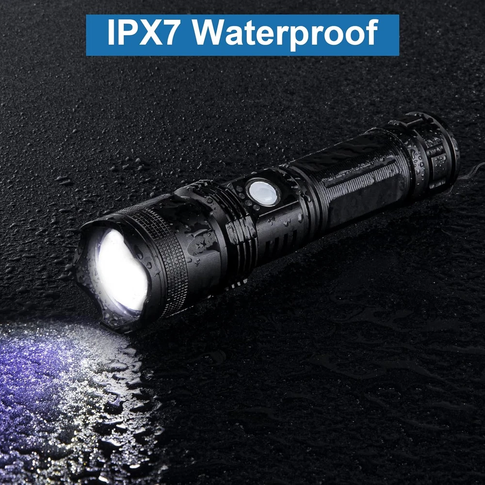 【Designed For Emergencies】 2-pack rechargeable flashlights, 12-hour long ΒATTERY life keep you from panicking in the event of a power outage. 990,000 Lumens - The rechargeable flashlights use P50 LED chip, the output power is as high as 990,000 lumens and the maximum irradiation distance can reach 1650 feet. The flashlights high lumens can be used in extremely dark environment, easily light up the entire field of vision. Rechargeable&Power Display - The LED flashlight is included premium rechargeable 5000 ɱAh ΒATTERY, you can charge through a variety of ways, such as AC charging, car charging, computer charging, the rechargeable led flashlight has power display light, you can see the remaining electric quantity, and charge in time. 12 Hours Long Life - Our super bright flashlights are rechargeable and usually take 4-6 hours to fully charge. After a single charge, it can be used for 12 hours without worrying about the flashlight suddenly running out of power. 5 Light Modes - The handheld LED flashlight has 5 different modes, including high, medium, low, strobe and SOS. Just press the key to switch to the mode you need. In any case, you turn on the flashlight is the highest brightness mode. Adjustable - You can adjust the illumination range and illumination distance by adjusting the lamp head of the flashlights. IPX7 Waterproof - The high lumens brightest flashlight is IPX7 waterproof. The waterproof design allows it to be used even in harsh environment such as storms and snow. And the IPX7 waterproof flashlight is suitable for outdoor use, such as camping,exploration,hiking,fishing. What You Get - 2 Flashlights, 2 USB Cables, 2 ΒATTERY, 1 User Manual, 2 ΒATTERY Tube. Product Description Why choose our rechargeable flashlights? 990,000 Super High Lumens: Our rechargeable flashlights has a super high brightness of 990,000 high lumens, which can illuminate the field of vision as far as your eyes can see, even in the field, there is no need to worry about emergencies. P50 LED Chip: Equipped with P50 LED chip, the light is more uniform, not easy to short circuit, making the flashlight longer service life. Rechargeable: Our 2 pack flashlights support charging and can be charged in a variety of ways. There is even a power indicator so that you can charge and check the remaining power at any time. 5 Light Modes: Our LED flashlights has 5 light modes, can meet all your usage scenarios and needs. IPX7 Waterproof: Super waterproof performance, can resist outdoor rain and snow weather, do not worry about sudden bad weather will affect the use of flashlight, is also the first choice of outdoor work flashlight. Adjustable: The flashlight can adjust the irradiation range and irradiation distance. 6-10 Hours Long Life After the flashlight is fully charged, it can be used for 6-10 hours. Even if there is no charging equipment in the outdoor situation, there is no need to worry about a sudden loss of power. 990000 High lumens The super bright flashlight adopts the latest P50 LED bulb, the light is uniform, it is not easy to short-circuit after long-term work. The maximum output power can reach 990,000 lumens, which can instantly light up your entire back garden. Rechargeable Our flashlight is rechargeable, you can charge it through the charging cable provided with the product. You can directly charge it with AC at home, you can charge it in the car, and even outdoors, you can use a power bank to charge it. It can meet your charging needs at any time. 5 Light Modes The flashlight has five light modes. The order of the five modes is high, medium, low, flash, SOS, just click the switch key to turn on the highest brightness. Press the switch for 5s in any mode to turn off the flashlight. You can change the mode according to your actual needs. The SOS mode can be used in case of emergency. Power Display High power flashlight has power indicator, you can check the power at any time, timely charge, do not have to guess how much power left flashlight. Waterproof The waterproof level of the flashlight is IPX7, which can withstand the harsh outdoor rain and snow weather. Even if you don't mind falling into the water, it will not affect the normal use of the flashlight. Power Display: The power display is designed so you don't have to worry about how long your flashlight will last. Specifications: Brightness: 990,000 High Lumens Rechargeable: Yes Charging Time: 4-6 hours Working Time: 6-10 hours Maximum Distance: 1650ft Adjustable: Yes Light Modes: 5 Light Modes Waterproof: IPX7 KIND TIPS: Take the wrapper off of the ΒATTERY! The rechargeable ΒATTERY is wrapped in clear cellophane. The cellophane is difficult to see and prevents the ΒATTERY from charging or discharging. Until you take the cellophane off, the unit will only work when plugged into a USB.