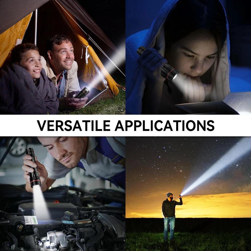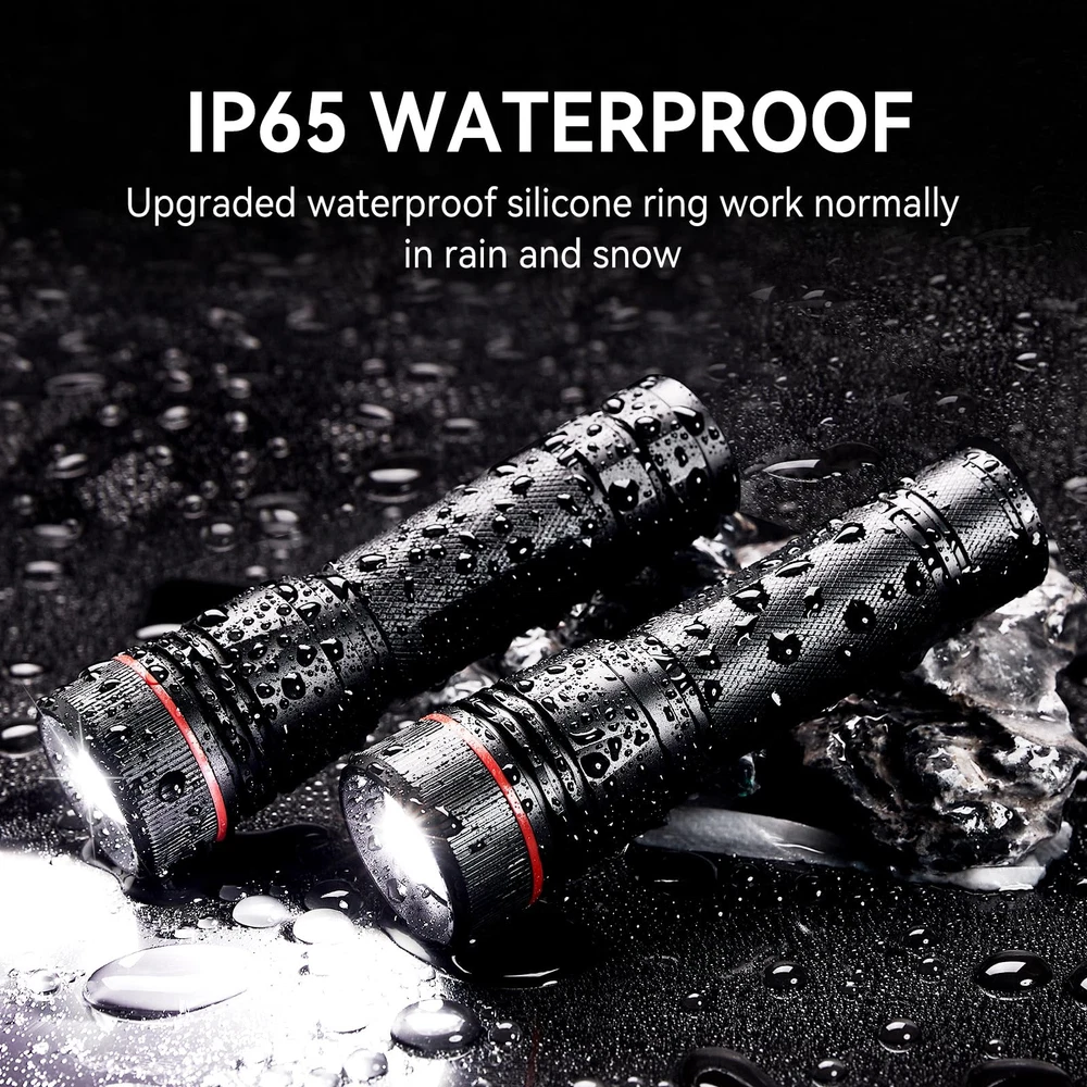 Long-Lasting Type-C Rechargeable Flashlights: With tail cap locked, you need not remove the battery ever again! Built-in high capacity rechargeable battery ensures a prolonged runtime of looping use, up to 50,000 hours, say goodbye to disposable batteries. The flashlights claim over 24 hours using on medium setting and 10 hours on high brightness. Type-C charging cable connects the rechargeable flashlights to any USB port like laptop, car charger and enjoy a quick and convenient recharge 3 Modes Tactical Flashlights High Lumens: flashlights high lumens with an upgraded LED chip, produce bright lighting, easily light up an entire room and powerful enough to reach a distance of 300 meters or more. The led flashlights offers 3 lighting choices - high, medium, strobe, specially designed for daily use or emergencies. No need to cycle through so many times to switch among modes. Easily zoom design from a wide flood to a focused, throw-style beam is also a huge plus Tactical Compact Flashlights: These small flashlights with 4.7’’ height and 106g, lightweight enough to carry comfortably and easily fit in your pocket, backpack, purse or car console compartment, ensuring convenient storage and quick access. Keep at home for emergency backup or to use outside, such as dog walking, camping, hiking, fishing, etc High-Quality Flashlights: The bright flashlights feature a reliable, water-resistant aluminum construction and an anti-slip finish. Claimed to be IP65 Waterproof, no worries about rains, snow and other extreme weather. You can count on flashlights during outages, hurricane, camping and emergencies. All in all, the flash lights are impressively sturdy with no noticeable damage or disruption to the beam even after submerged in water and dropped from a height of 10 feet Wide Applications & Decent Customer Services: These tactical flashlights high lumens are tailored for a wide variety of use cases. They can be used around the house, on the job as an everyday carry, and outdoor adventures. With their simplicity and user-friendly recharging, these flashlights will quickly become your favorite companion. 2-year no questions asked replacement service plus our 24 online reply make for your worry-free shopping