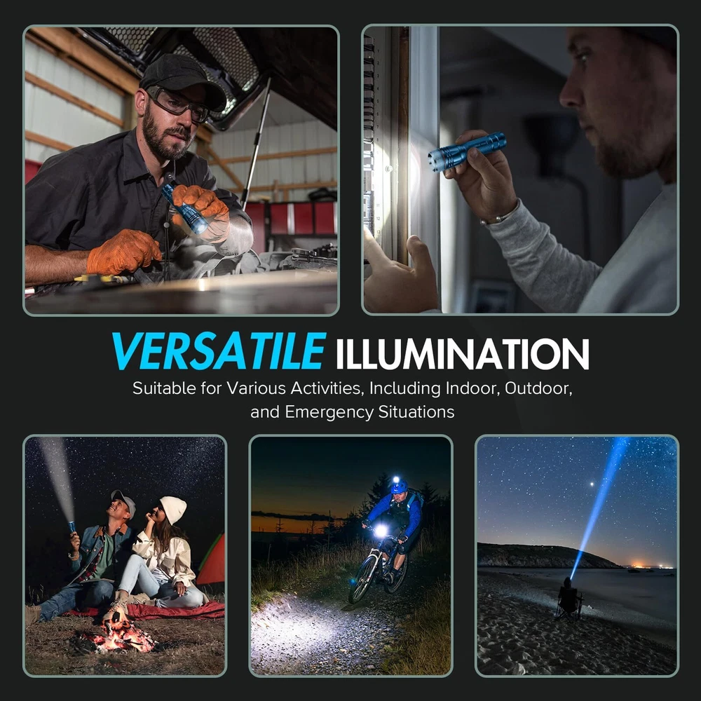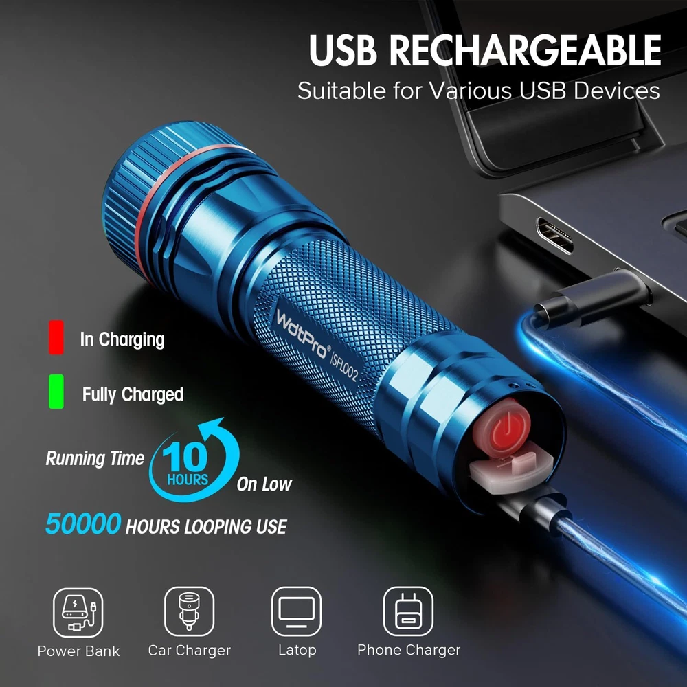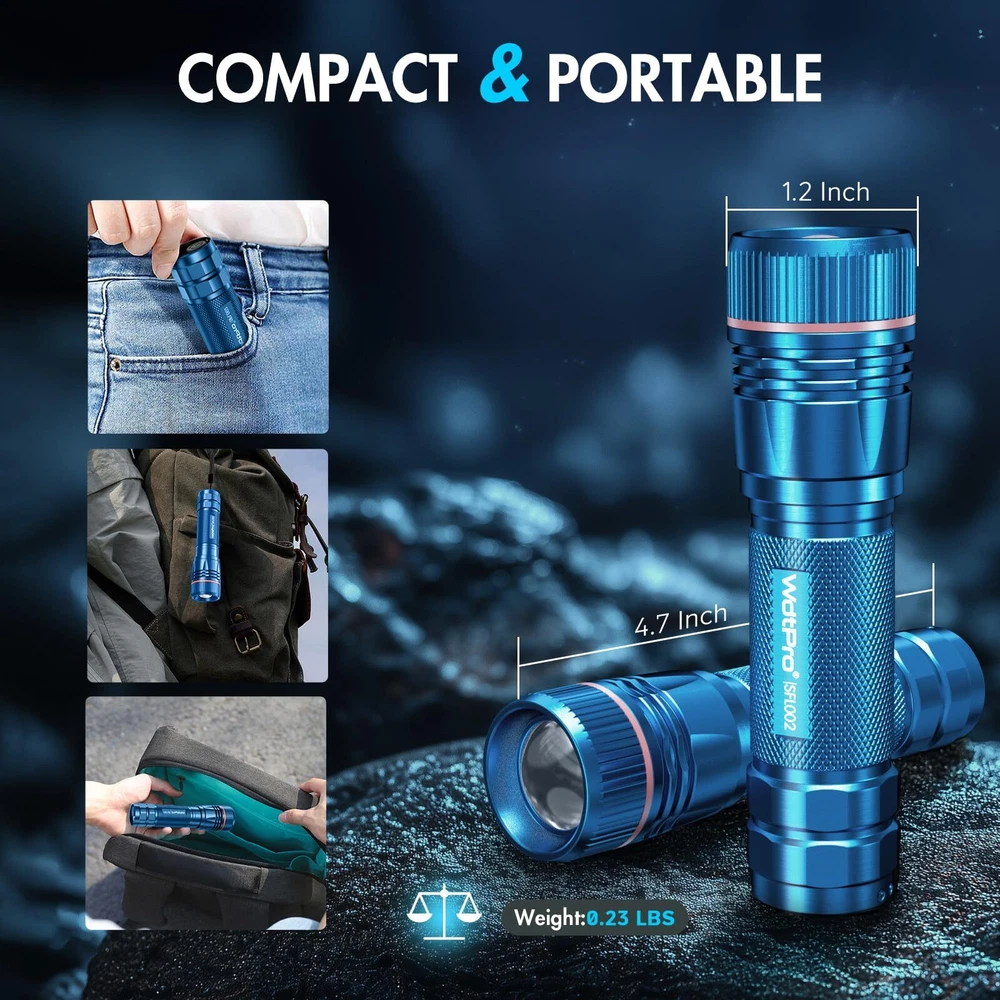 Long-Lasting Rechargeable Flashlights with Type-C Port: SFL002 flashlight eliminates the need for constant battery replacements. With a high-capacity rechargeable battery, enjoy up to 10 hours of runtime on low brightness and over 5 hours on high. Designed for durability, these flashlights for home provide a lifespan of up to 50,000 hours, ensuring extended use. The flashlight rechargeable can be charged through any USB port, including laptops or car chargers, using the included Type-C cable. Forget about disposable batteries and enjoy fast, convenient recharges. Ideal for daily use, home emergencies, and outdoor activities like camping or hiking Ultra-Bright Flashlight with 3 Lighting Modes: The flashlights high lumens with an upgraded LED chip, capable of illuminating a room or projecting light up to 360 feet away. This super bright flashlight features three lighting modes, high, medium, and strobe, designed for versatility in any situation, whether it's day-to-day tasks or emergencies. Easily switch between modes without cycling too many times, and adjust the zoom from a wide floodlight to a focused beam Compact & Portable Tactical Flashlight: Weighing only 106g and standing 4.7 inches tall, this small flashlight is designed for portability. The small flashlight fits comfortably in your pocket, bag, or glove compartment, making it easy to carry wherever you go. The compact size of our edc flashlight makes it perfect for camping, cycling, reading, fishing, hiking, or walking the dog. You can also keep flashlights for emergencies, ensuring reliable lighting is always within reach Sturdy & Waterproof Flashlight for Tough Conditions: Built with high-quality aluminum construction, the LED flashlight is both high-Quality and IP65 waterproof, ready for all weather conditions. Whether it's rain, snow, or even immersion in water, powerful flashlights continues to perform. Its sturdy build resists damage even from drops up to 10 feet, making it a reliable tool during power outages, hurricanes, or outdoor adventures Wide Application and Excellent Customer Service: With its robust features and Sturdy design, Flash light is ideal for a wide range of applications. Whether you're using it at home, during outdoor activities, or in emergency situations, these flashlights high lumens rechargeable offers reliable, long-lasting performance. Pocket flashlight compact size, bright LED light, and waterproof construction make it the perfect tool for any scenario. Enjoy peace of mind with our 2-year unconditional replacement service and 24 online support, ensuring a worry-free shopping experience