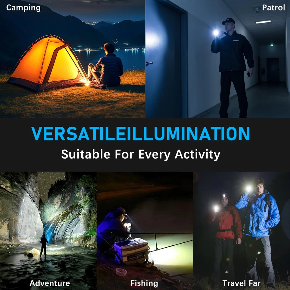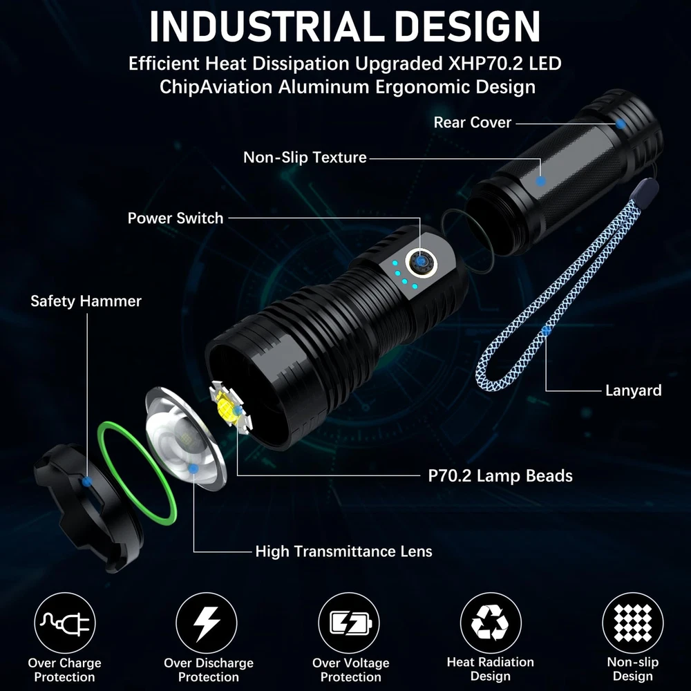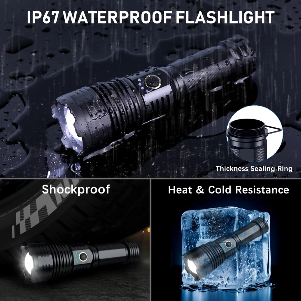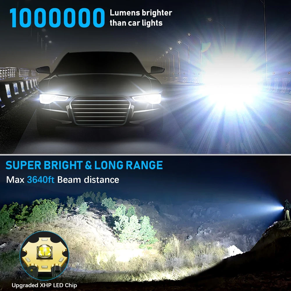 Rechargeable Flashlights 1000,000 High Lumens Flashlights High Lumens: rechargeable flashlights are equipped with a super bright P70.2 LED chip, to produce up to 1000,000 lumens brightness. With high powered flashlight, meeting your various illumination needs, lighting up to 1300ft² area or 3640ft distance, for emergencies, camping, hiking. LED Flashlight Rechargeable: Equipped with an upgraded large capacity battery, tactical flashlights high lumens can work for 18hours after fully charged. There are fast-charging USB-C port to ensure high efficiency charging for led flashlight. And four power indicators assist you to know the battery level of the rechargeable flashlight. Adjustable & 5Mode Flash Light: Super bright flashlight has adjustable focus function as floodlight for wider area when zoom in or spotlight for longer distance when zoom out by stretching the top of the tactical flashlight. Flashlights high lumens rechargeable have five lighting modes as high/medium/low/strobe/SOS for multifunctional use. DURABLE & WATERPROOF& COMPACT:The powerful flashlight is made of aluminum alloy, with the metal body, it is durable, shockproof, waterproof, can work in raining day, snow day, storm day or other bad weather. As a compact handheld size,it is easy to carry and store. it is ideal for home backup,night reading or sudden blackout.It is also perfect for hiking, camping, dark walk, emergencies or other outdoor activities Buy With Confidence: It is recommended to charge it up before using it for the first time. If you have any questions, please do not hesitate to contact us. We take care of replacing all quality related issues.