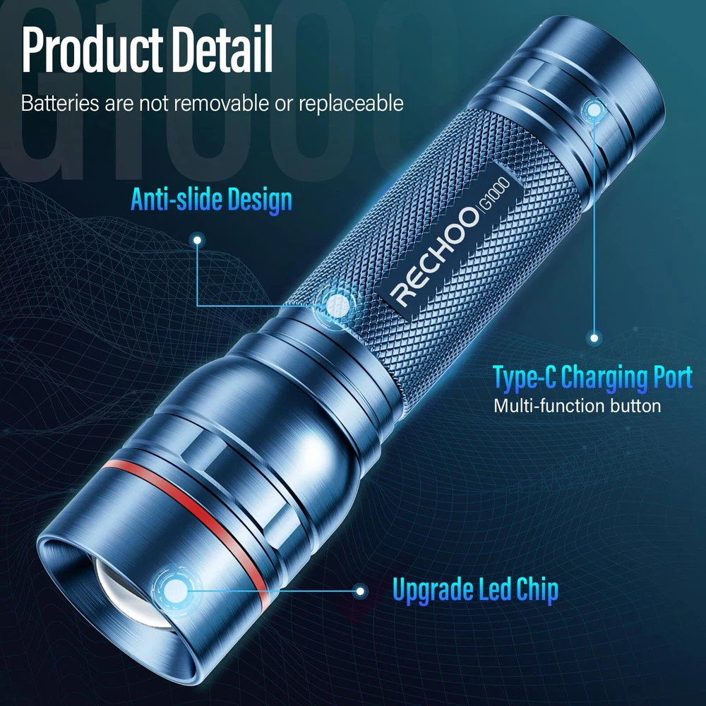 Powerful Rechargeable Flashlights: G1000 flashlights high lumens with an upgraded LED chip and tactical switch design, offer 3 lighting modes (high, medium, strobe) which are ideal for daily use or emergencies; No need to cycle through modes too many times to switch modes; The all-in-one design of the flash light also eliminates the hassle of frequent battery replacements; Plus, easily zoom from a wide to a narrow beam by pulling out the flashlight head; Illuminate anywhere with ease; Long-Lasting Type-C Rechargeable Flashlights: The built-in high-capacity rechargeable battery of the flashlight ensures a prolonged runtime; Simply use the included Type-C charging cable to connect the rechargeable flashlight to any USB power source, such as your laptop, power bank, or car charger, and enjoy a quick and convenient recharge. Say goodbye to disposable batteries; Portable Tactical Flashlight: Our small flashlight's compact design makes it easy to carry wherever you go; This flashlights high lumens rechargeable is sturdy and lightweight enough to fit in your pocket backpack or glove compartment, and you'll always have reliable lighting at your fingertips; It's the perfect edc flashlight for camping, home, hiking, emergencies, or everyday use (Size: 4.72''D* 1.25''W, Weight:0.23lb); Sturdy & Waterproof LED Flashlight: Crafted with high-quality military materials, our small flashlight is built to satisfy the needs of everyday use; IP65 waterproof technology and seal design enable this super bright flashlight to be used in all bad weather; Whether you're exploring the outdoors or handling household tasks, rest assured that our flashlights for emergencies are up to the challenge; It's your dependable source of light whenever you need it; Excellent After-Sales Service: The excellent after-sales service will be provided for all products; If you have any problems with our flashlight, please feel free to contact us; We'll reply to you within 24 hours.;