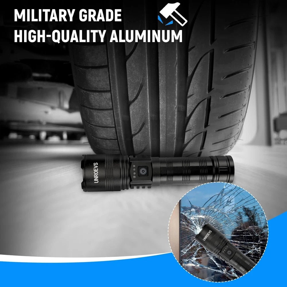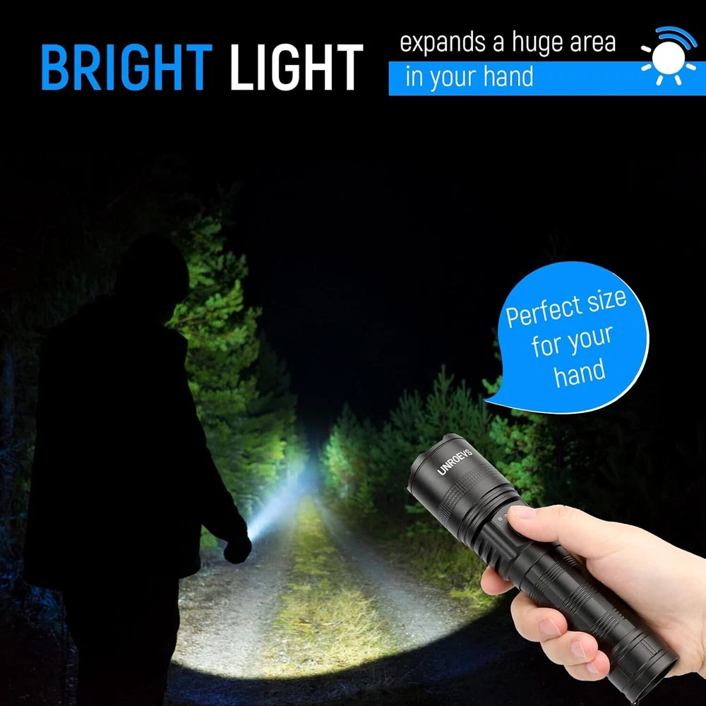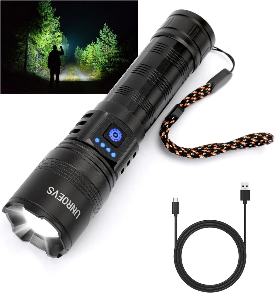 Rechargeable Flashlights High Lumens, High Power LED Flashlights with 5 Modes &Zoomable,3000lm Super Bright Multifunctional Flashlight, Handheld Flash Light for Emergencies, Camping Fashlights High Lumens: UNROEVS rechargeable flashlights are equipped with a super bright P70+ LED chip, to produce up to 3000 lumens brightness. With high powered flashlight, meeting your various illumination needs, lighting up to 1300ft² area or 1500ft distance, for emergencies, camping, hiking. Rechargeable Flashlight&Multi-Function: USB Type C port for 3 hours fast charging your LED Flashlight, and USB Output used as emergency powerbank to charge your phone , GPS, Camera , a good helper during in your camping trip or emergency use,with head cusp design, tactical flashlight can be used as safety hammer. Zoomable and 5 Modes Flash Light: This Powerful tactical flashlight has 5 different lighting modes: high-medium-Low-strobe-SOS; simply turned off the flashlight by long press the button 2S, No need to cycle through all modes, With Zoomable function, it can work as a spotlight when zoom out , and also can be used as a floodlight when zoom in,suitable for outdoor survival activity such as camping hiking travel,nigh walking or other emergency situations Waterproof,Compact and Anti-slip Durable : Flashlight rechargeable is made of aviation grade aluminum alloy and sealed design, achieving IPX6 waterproof and for all weather use and has impact resistance. Flashlight Package: Flashlights are packed with 1*led flashlight, 1*rechargeable battery, 1* type-c charging cable, 1* carrying lanyard .