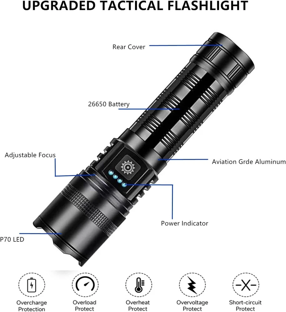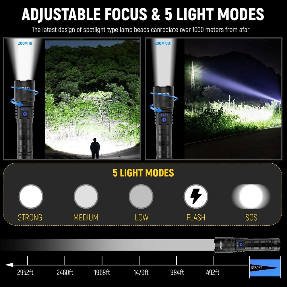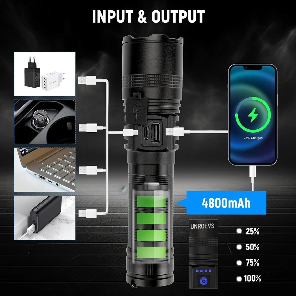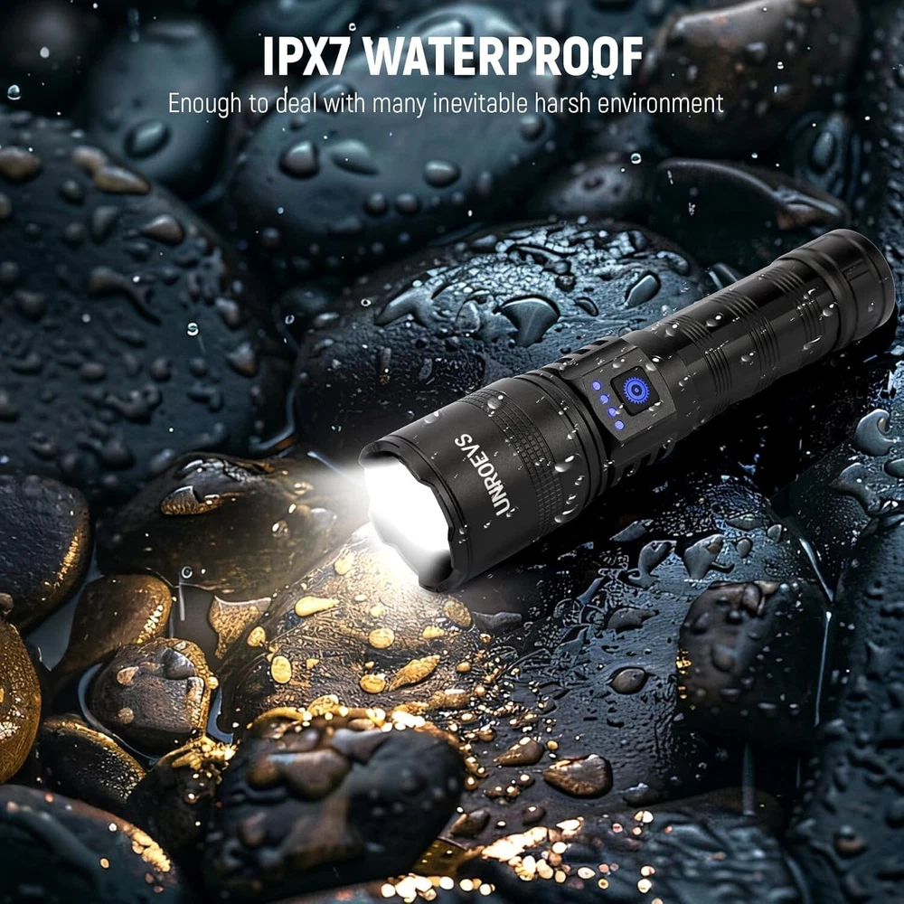 Rechargeable Flashlights High Lumens, High Power LED Flashlights with 5 Modes &Zoomable,3000lm Super Bright Multifunctional Flashlight, Handheld Flash Light for Emergencies, Camping Fashlights High Lumens: UNROEVS rechargeable flashlights are equipped with a super bright P70+ LED chip, to produce up to 3000 lumens brightness. With high powered flashlight, meeting your various illumination needs, lighting up to 1300ft² area or 1500ft distance, for emergencies, camping, hiking. Rechargeable Flashlight&Multi-Function: USB Type C port for 3 hours fast charging your LED Flashlight, and USB Output used as emergency powerbank to charge your phone , GPS, Camera , a good helper during in your camping trip or emergency use,with head cusp design, tactical flashlight can be used as safety hammer. Zoomable and 5 Modes Flash Light: This Powerful tactical flashlight has 5 different lighting modes: high-medium-Low-strobe-SOS; simply turned off the flashlight by long press the button 2S, No need to cycle through all modes, With Zoomable function, it can work as a spotlight when zoom out , and also can be used as a floodlight when zoom in,suitable for outdoor survival activity such as camping hiking travel,nigh walking or other emergency situations Waterproof,Compact and Anti-slip Durable : Flashlight rechargeable is made of aviation grade aluminum alloy and sealed design, achieving IPX6 waterproof and for all weather use and has impact resistance. Flashlight Package: Flashlights are packed with 1*led flashlight, 1*rechargeable battery, 1* type-c charging cable, 1* carrying lanyard .