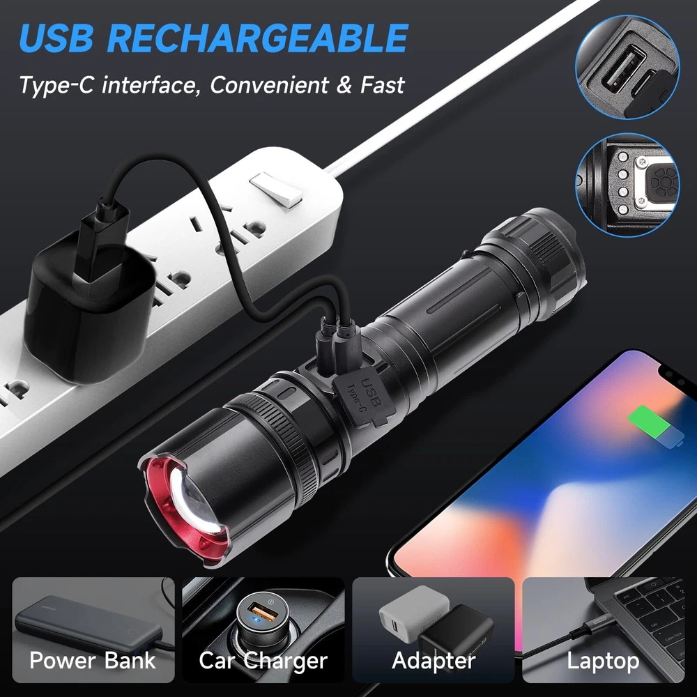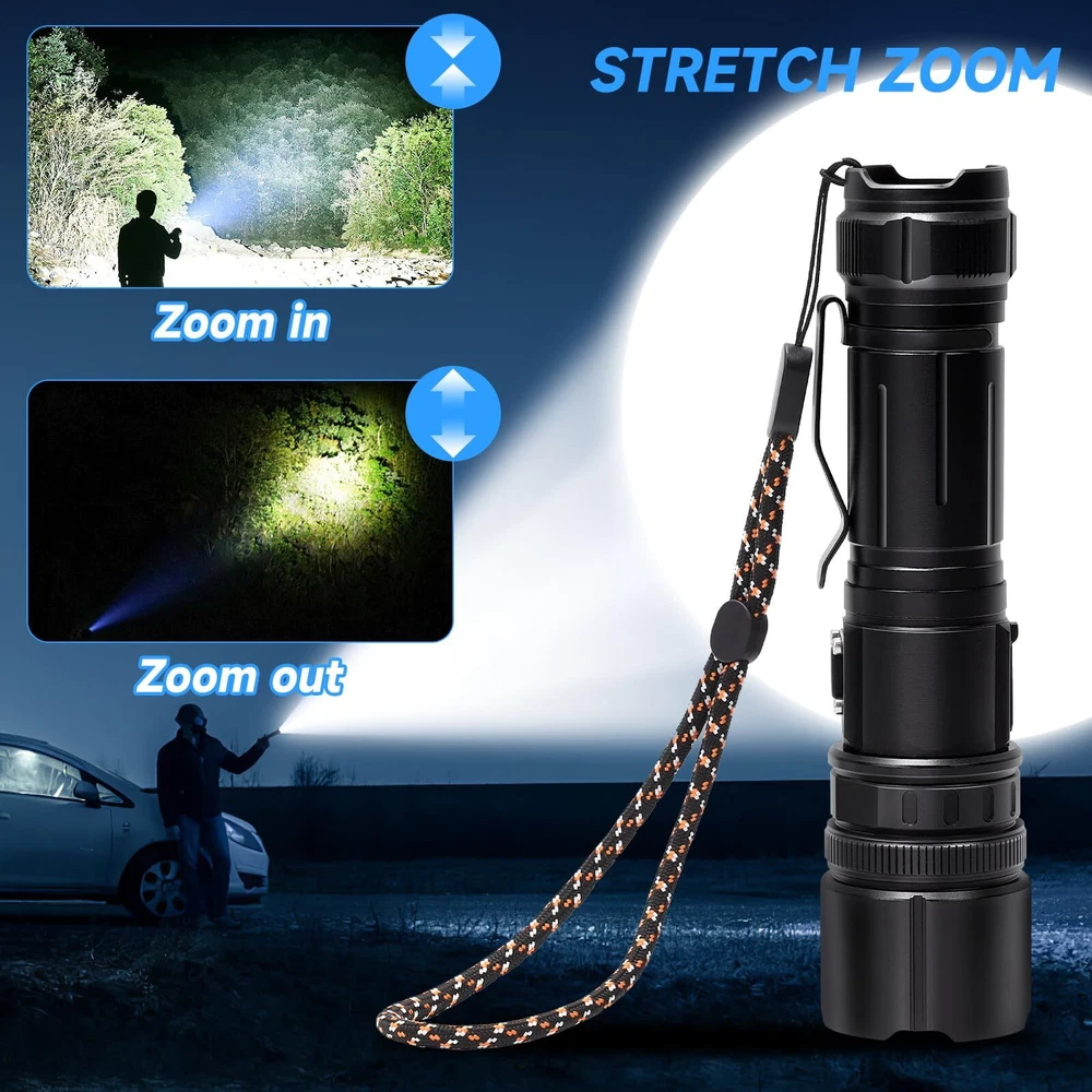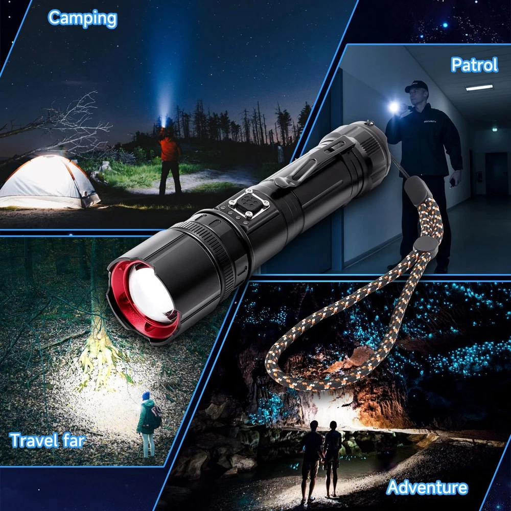【Small but Bright】 The small rechargeable flashlight features an upgraded chip to provide the brightest light. The performance is improved by 50%, and it's 5 times brighter than ordinary LED flashlight. With a lighting range of over 1680 feet, it can easily illuminate an entire mountain. At the same time, designed with a built-in clip and hand strap, our flashlight is easy to carry and attach to your backpack, belt, or pocket. It's compact in size, making it a reliable companion wherever you go. 【Powerful & Versatile】 Our tactical flashlight offers 5 different modes - High/Medium/Low/Flash/SOS allowing you to adjust the brightness and functionality according to your needs.Flashlight is designed with a zoom function. Zoom in, zoom out – it’s all under your control! The unique memory mode allows you to close it by just pressing and holding it for 2S. The next time you open it, it will still be in the previous mode, eliminating the need to cycle through it every time you close it. 【Never Worry About Running Out of Power Again!】Not only does our powerful flashlight serve as a reliable lighting tool, it also comes with a convenient remaining battery display, so you never have to worry about when it needs to be recharged. Plus, it can even double as a power bank, allowing you to charge your phone or other devices on the go. 【Durable & Waterproof】px Our waterproof flashlight features advanced sealing technology to stay waterproof so you can brave rain, storms, and any challenging weather conditions. This high powered flashlight is made from aircraft aluminum alloy and has been rigorously tested to withstand accidental drops up to 36 feet and rough handling. Ideal for outdoor running, camping, fishing, hiking and exploring. 【Exceptional Customer Service】We firmly believe in the quality of our products and offer a reliable after-sales service. If you encounter any issues or have any questions, our dedicated customer support team is here to assist you. So why settle for a regular flashlight? Choose ours, this top-of-the-line flashlight that's both compact and incredibly bright! Get your hands on it now and be prepared for whatever the darkness throws your way.