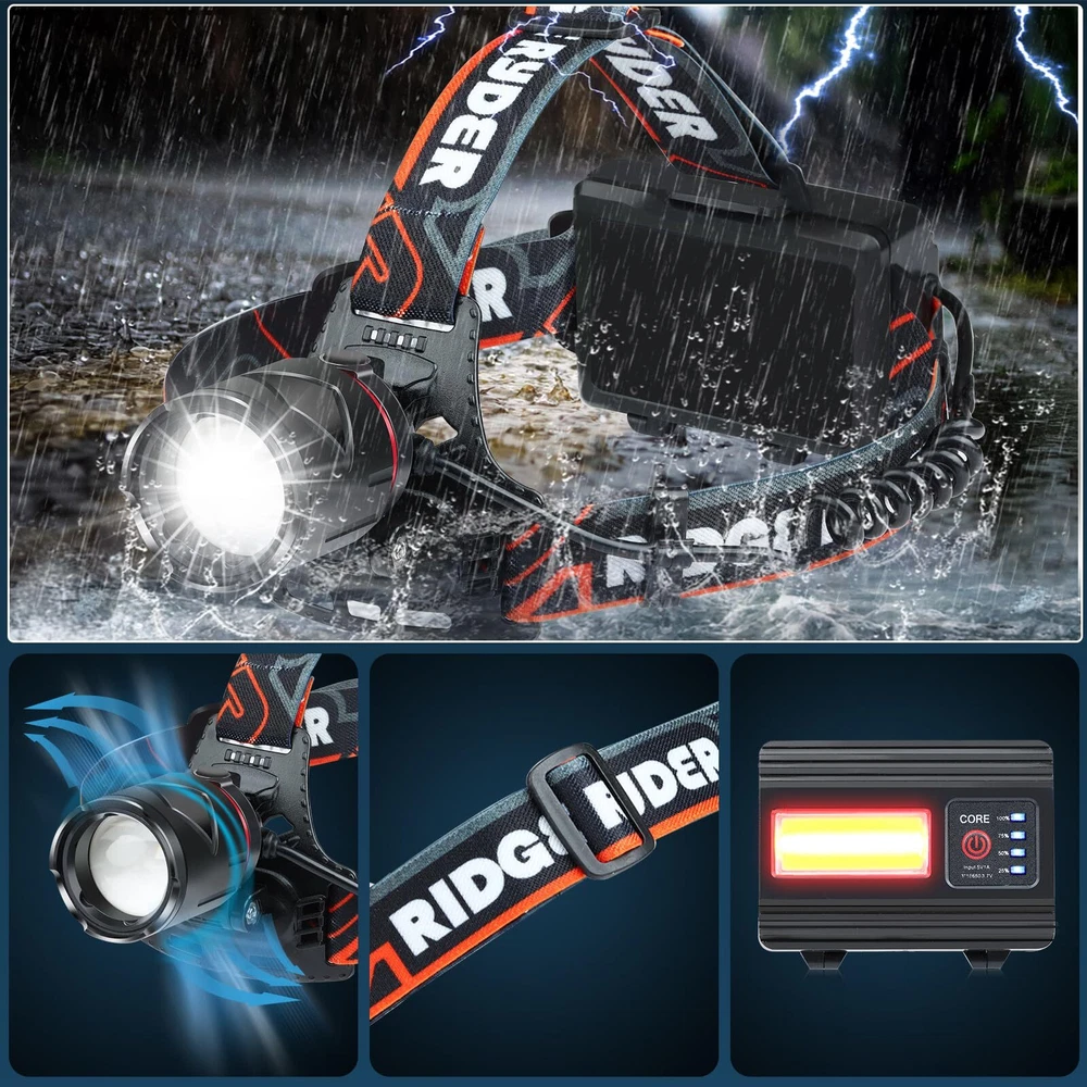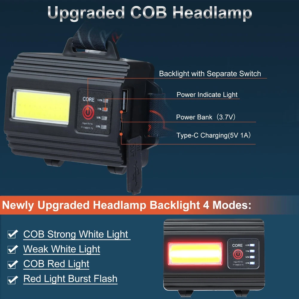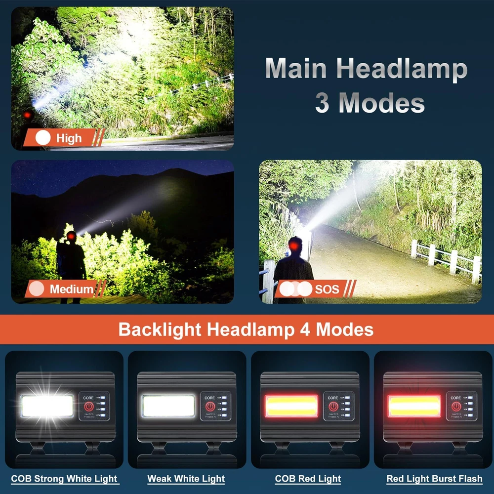 【SUPER BRIGHT HEADLIGHT】This newly upgraded headlamp adds an additional backlight design so that the main light and backlight do not turn on at the same time and can only be used by switching, with a bulb life of up to 60,000 hours, a light intensity of up to 120,000 lumens, and a range of up to 3,938 feet.Equipped with upgraded high-capacity 3* batteries, with a capacity of up to 1,500mAh per battery, which makes it able to last up to 10 hours of continuous work on high brightness, and up to more than 30 hours of continuous work on low brightness. 【UNIQUE DESIGN OF ALUMINUM HEAD MATERIAL】The headband features a cutting-edge design for the camera and uses an oversized lens for wider and brighter illumination. The letters on the headband are illuminated to emit a faint fluorescent glow in dark environments. The best feature is the zoomable headlamp, which is easy and convenient to control, making it perfect for a variety of activities at night. 【ZOOMABLE AND 3+4 LIGHT MODES】: High lumen main light has 3 lighting modes: strong light/low light/strobe, zoomable headlamp to realize free zoom illumination, rechargeable headlamp can emit a large area of floodlight or spotlight; 4 modes for the backlight: strong white light with COB, weak white light, red light with COB is always on, red light burst flash. It is safe, reliable and easy to use, the best flashlight for fishing, hiking, running, hunting and exploring. 【TYPE-C CHARGING & POWER OUTPUT】headlamp is specially designed with Type-C charging and power output design, you can use any Type-C port to charge the headlamp when you are outdoors, and you can also use the headlamp as a power source for battery life when your mobile phone runs out of battery, and they are professionally designed with circuit protection, you don't need to worry about charging safety at all. 【IP67 WATERPROOF & DURABLE】Reinforced density and width of the USB port and bulb cover allows the headlamp to withstand heavy rain and withstand harsh environments such as high temperatures or extremely cold weather, resistant to drops and pressure. And it can dissipate heat quickly, which is safer and more reliable than other Shops headlamps. 【FLOODING AND SPOTLIGHT】Flashlights headlamp with retracte and zoom function. Pull the power headlamp head to switch spotlight mode and pull back the head to switch to floodlight mode. Spotlight mode is suitable for long distance lighting, floodlight mode will more suitable for wide range lighting. 【SUPER BRIGHT HEADLAMP】Can be used with a hat or helmet, no matter how cold the weather, headband how thick the hat, can be used with the elastic band can be adjusted to strengthen, not easy to slip. 【POWER INDICATE LIGHT & SAFETY LIGHT】 Rechargeable head lamp with 5 power indicator lamps, so you can see the power at a glance, and always know how much electricity and charge you have (100%, 70%, 50%, 25%, 10% ). 【POWERFUL SERVICE TEAM】Package includes: Rechargeable LED headlamp x 1, 3*Batteries , Type-C Cable x 1. provide each customer with 24-hour professional online support, 2-year warranty and 30-day money back service. If you have any questions with our headlamps, please contact us at any time! We're always here for you!