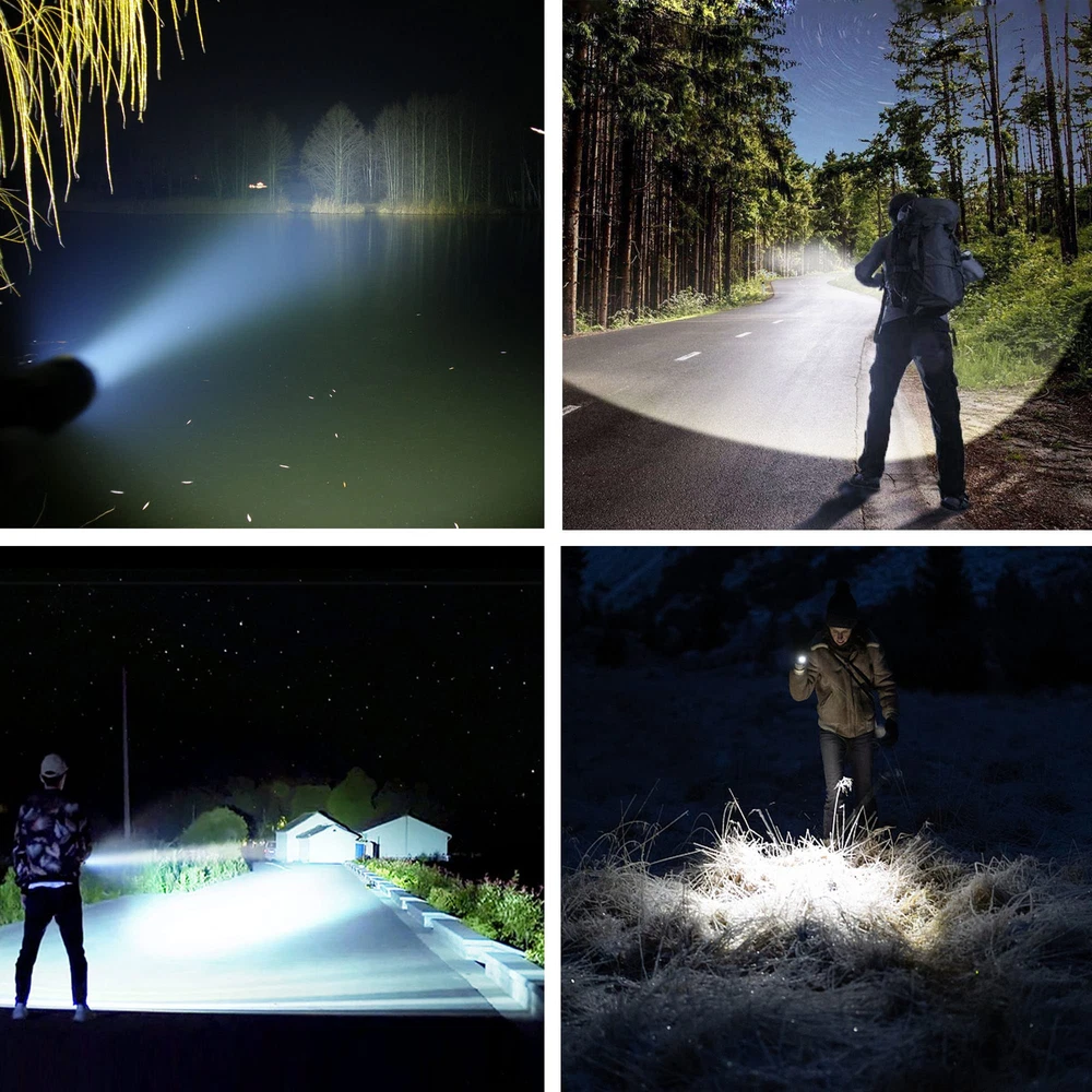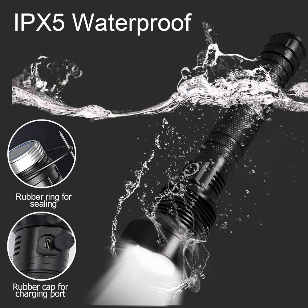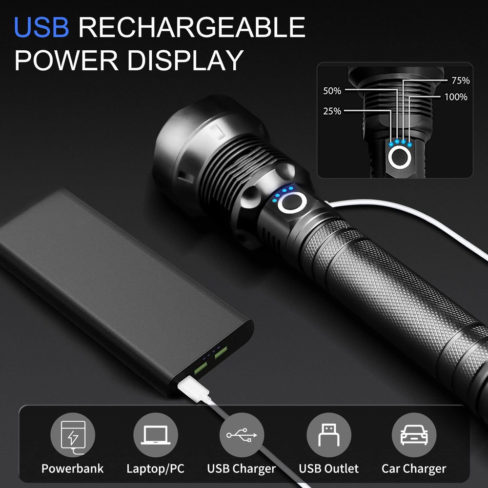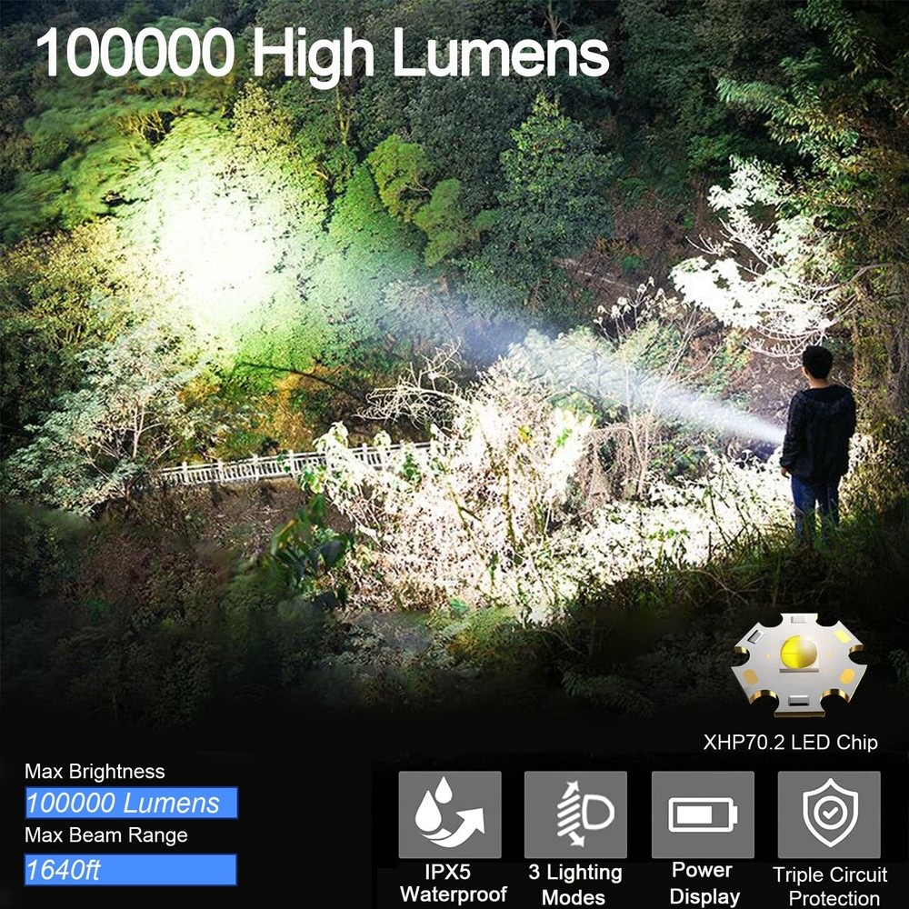 【Upgrade & Brighter】 The maximum brightness of the flashlight is up to 100000 lumens. The light source adopts the most advanced high power XHP70.2 LED chip, which is five times brighter than an ordinary flashlight. 【3 Modes & Zoomable】 Led flashlight has 3 lighting modes: High / Medium / Strobe, you can switch the spotlight and floodlight mode by retracting the lamp head. It is very suitable for daily use at home or an excellent choice as part of emergency backpack. 【Powerful & USB Rechargeable】 Easy for recharging the flashlight with any USB output interface device such as power bank, computer, car charger. In addition, flashlights have a power display function, so that you can see the power at a glance. With a powerful 10000mAh rechargeable battery, it can work for 8 hours in medium mode and 6 hours in high mode. 【Waterproof & Durable】 With IPX5 waterproof rating. Suitable for outdoor environment and bad weather conditions. The powerful flashlight is made of aluminum alloy, non-slip, wear-resistant, and is a powerful tool to protect yourself in an emergency. 【Worry Free Services】 Super bright rechargeable flashlight comes with 2 years of free replacement service and 7*24-hour customer service, If you have any questions, please feel free to contact us.