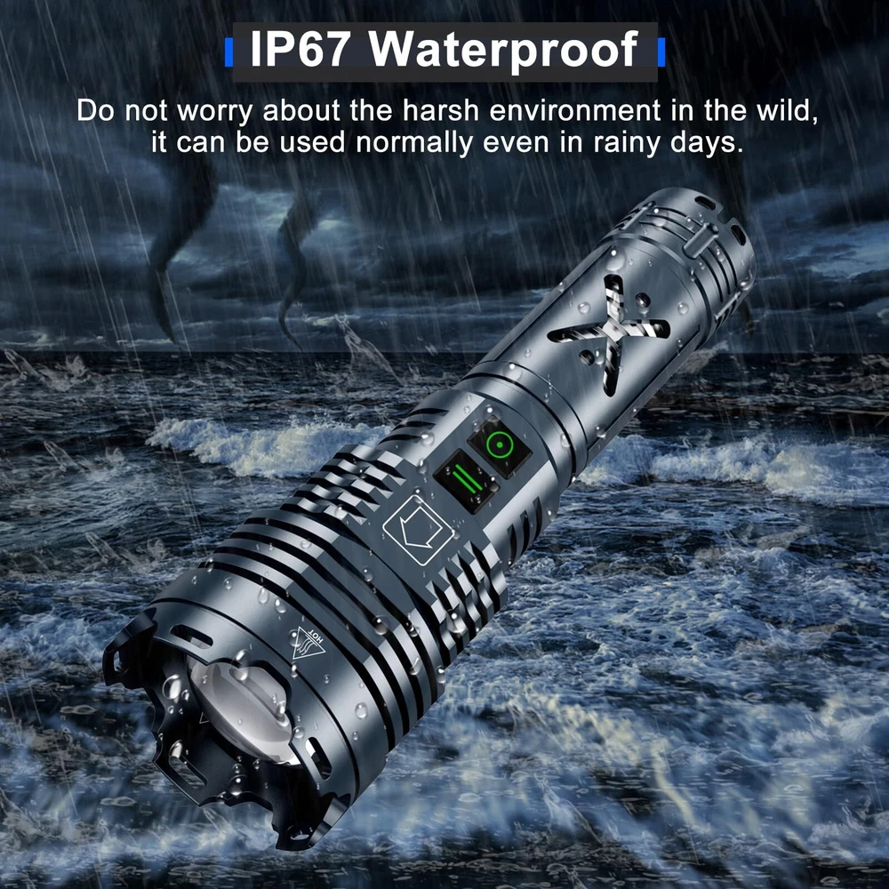 🌈【High Brightness, Long Range】The high power flashlight features the upgraded xhp160.5 chip. This rechargeable flashlight produces up to 900,000 lumens of ultra-high output and is 300% brighter than older models. It can easily illuminate a 3000 square foot room or focus on objects up to 3500 feet away. 🌈【6 Brightness Modes】high lumens flashlight boasts 6 versatile modes (Super Strong /Strong / Medium / Low / Strobe / SOS) that can be easily toggled to suit your needs. It is ideal for a wide range of activities such as camping, hiking, fishing, running, cycling, power outages, emergencies, targeted searches, and general household use. Furthermore, the individually set mode button on the powerful flashlight makes it easier to operate. 🌈【High Power Flashlight】The rechargeable flashlight features a fast charging chip that charges 50% faster than the old model and can work for approximately 8-20 hours on a single charge. It also uses a hidden positive and negative charging port, enhancing its dustproof and waterproof abilities. Moreover, the high power flashlight includes a power output function, allowing you to use it as a power bank to charge your devices via cable. 🌈【Multiple Protection, Safe and Secure】The super bright flashlight is designed with multiple circuit protection functions, including overcharge protection, overdischarge protection, overvoltage protection, and short circuit protection. These features not only make the flashlight's performance more stable, but also significantly extend the service life of the high powered flashlight. 🌈【Zoomable Adjustment】The rechargeable LED flashlight has a telescopic zoom function for switching between spotlight and floodlight modes. Zooming out the head activates the spotlight mode for long-distance observation, while zooming in switches to the floodlight mode for close-range lighting and clear visibility. Click to brighten up the night sky with this handheld flashlight.