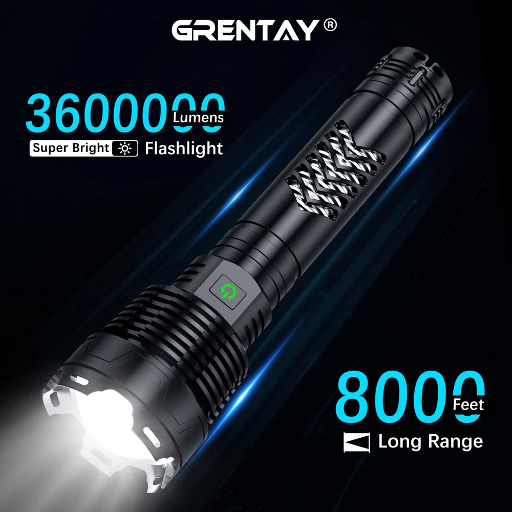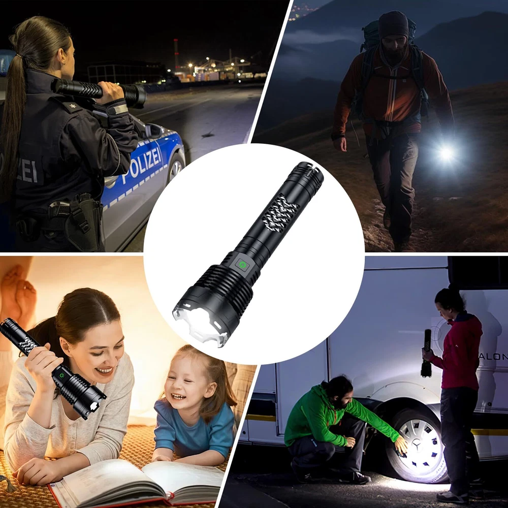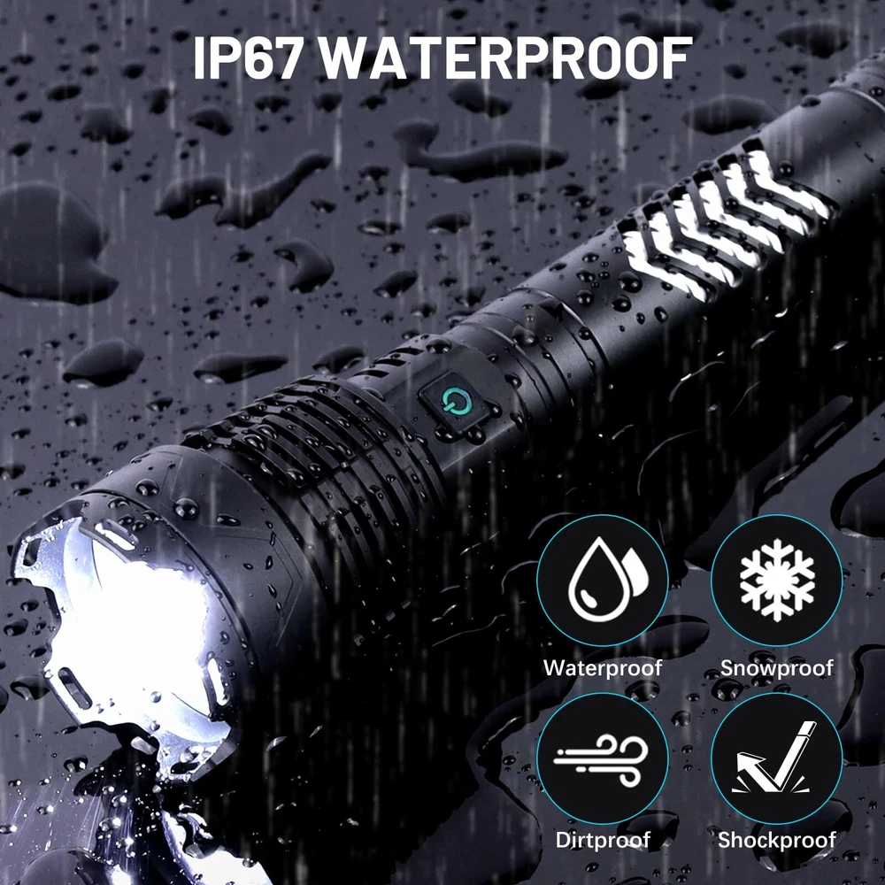 ☀️Super Bright LED Flashlight:This bright flashlight features an upgraded design with a long handle, which is longer and easier to grip than the regular model. It can output up to 3600000 lumens and has a maximum illumination distance of up to 8000 feet, making everything in front of you bright and clear, protecting you from the effects of darkness. This is a high powered flashlight suitable for hiking, night fishing and dog walking. 💡5 Modes & Zoomable:This flashlights high lumens has 5 brightness levels: high, medium, low, strobe, SOS. In any mode, long press the switch button for 3 seconds to quickly turn off without cycling through all modes. In addition, you can stretch the head of the rechargeable tactical flashlight to obtain a wide or narrow beam of light, expanding or reducing the area covered by the light to adapt to different lighting environments. 🔋Upgraded Battery: This rechargeable flashlight is equipped with an upgraded 10000mAh battery, which is brighter than other flashlights, has longer battery life and can run for over 31 hours in low mode. Try this battery powered flashlight, you will fall in love with it. 💧IP67 Waterproof & Shockproof:This powerful flashlight is made of aviation aluminum alloy and has functions such as waterproof, efficient heat dissipation and anti drop. It can be used in rainstorm, snow, hail and other severe weather conditions.The waterproof flashlight features a long handle and anti slip design, making it easy to grip and use. It is suitable for camping, emergency and hunting. 💁Excellent After-Sales Service: This powerful tactical flashlight provides 24 hours customer service. If you have any questions about our flashlights high lumens rechargeable, you can always leave us a message through Amazon, and our professional team will solve the problem for you.