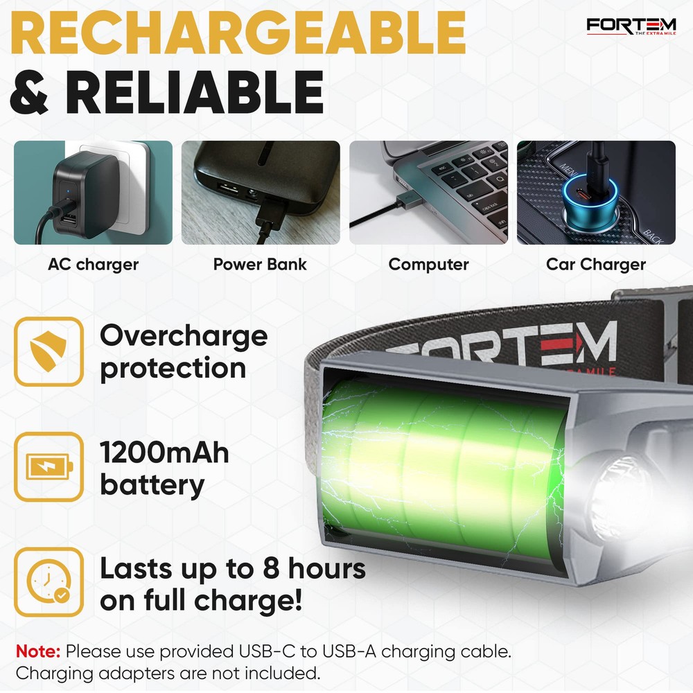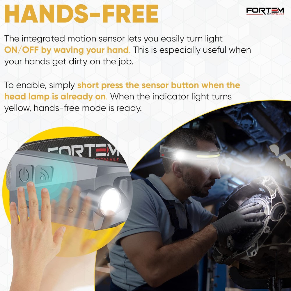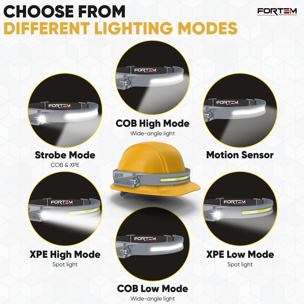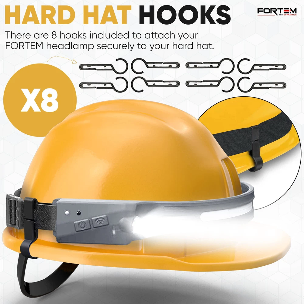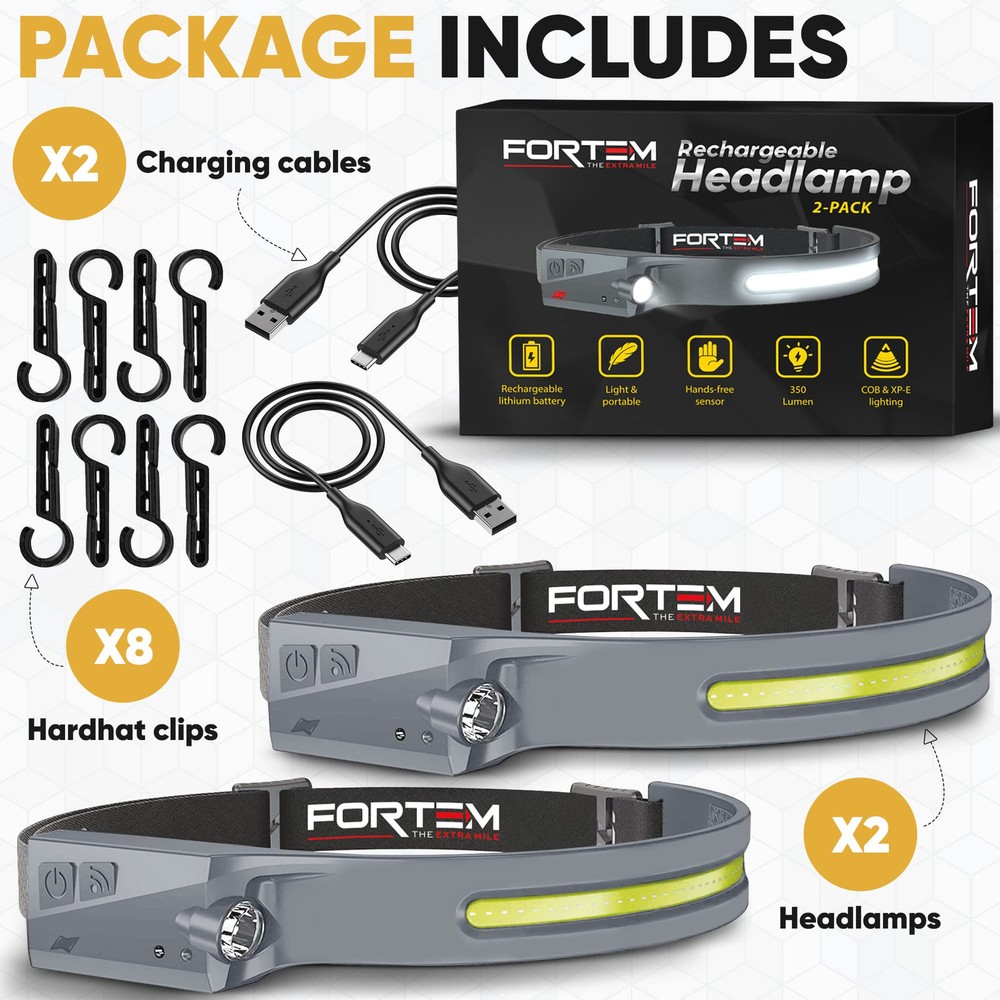 2 PACK – There are (2) LED headlamp rechargeable units included along with 2 charging cables and 8 hard hat clips. light headband is the head lamp to wear or take with you to work every day. VERSATILE HEADLIGHT FLASHLIGHT - rechargeable headlamp features a 230-degree COB LED & spotlight XPE light, offering SIX different light modes for various activities. Works as a camping headlamp, outdoor hiking headlamp, hunting headlamp, hardhat headlamp, running headlamp, fishing and more. HANDS-FREE DESIGN - The battery powered head lamp frees your hands to work on tasks, making it an ideal headlight for both outdoor adventurers and hands-on jobs. Head lights for forehead help illuminate exactly what you’re looking at. The Hands-free mode allows you to turn this bright headlamp on and off by simply waving your hand near the sensor. RECHARGEABLE BATTERY: This LED headlamp for head provides even more convenience with a rechargeable battery, that eliminates the need to replace batteries. High lumen headlamp flashlight contains a 1200mAh battery allowing your head torch to last up to 8 hours depending on light mode used. Easily recharge within 2 hours with USB-A to USB C cable. SUPER BRIGHT HEADLAMP: Headlamps for adults rechargeable ensures optimal visibility in the darkest environments. The COB mode’s high power 350 Lumen brightness and 230-degree range are unmatched.