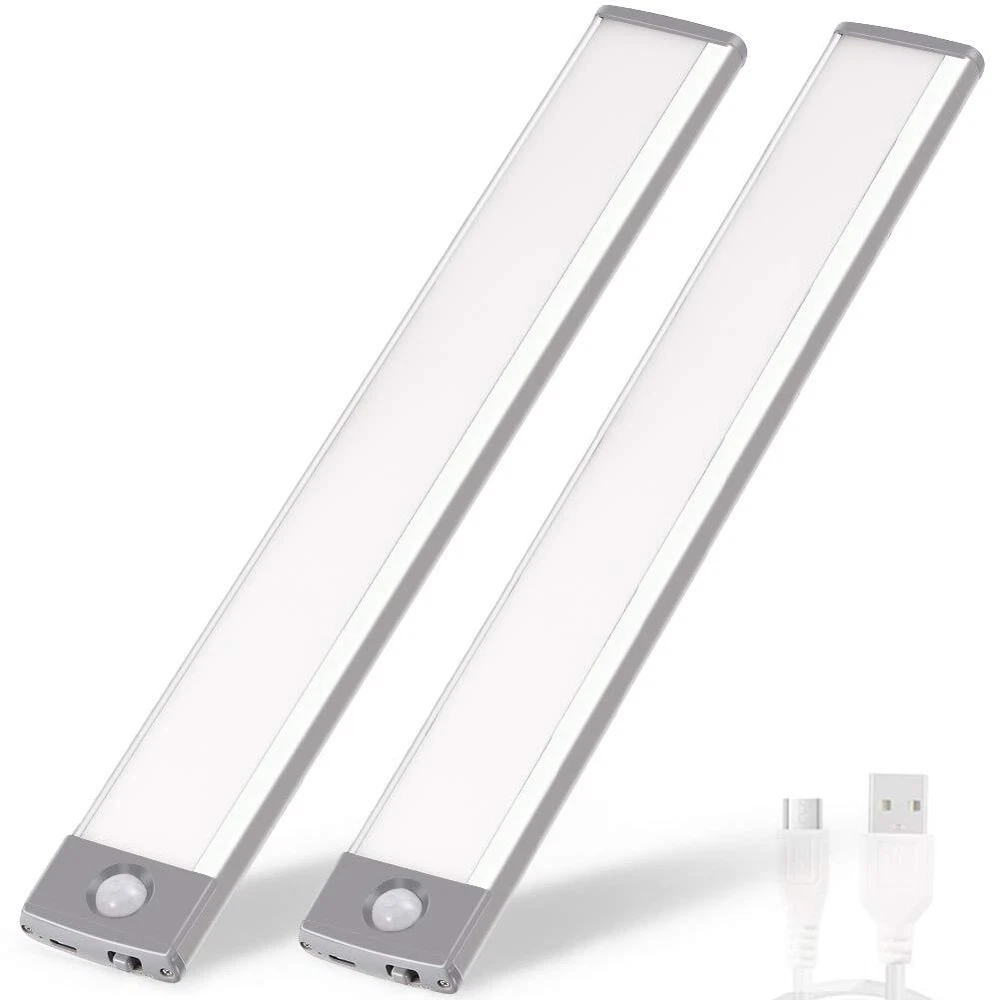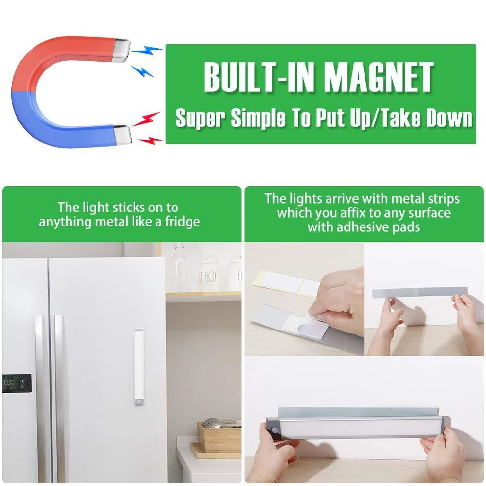 Super Bright & Eye-Protection: The cabinet lights have 54 LED beads, upto 350 lumens, light guide panel transmits light sideways for glare-free illumination, Shines a flicker-free light that brightens your space without harming your eyes. Easily Installs Anywhere : This motion sensor led lights they are a breeze to install as there is a magnet built right in to let you stick the bulbs on iron material the lights, if it's gonna go on something like wood or something like aluminum then you could use this included plate and they have some strong magnets on there to allow you to hold that in place. USB Rechargeable: The built-in 2500mAh battery is easy to recharge. a USB cable is included Rechargeable and movable. No need to run wires, no need to buy batteries. Recharge with a standard USB (micro B) cable and charger, same as many phones use. 3 Settings On/Off/Motion: These stick-on closet lights have a 3 mode switch which is On-Off-G to set it always ON, Off or Motion Sensor mode. under G mode and dark environment, these under cabinet lights will automatically senses human motion within 10ft/120°range and shuts off automatically after 20 seconds of no movement. Therefore, you can used these closet lights as a normal night light for closet/cabinet/drawer or motion sensor light. Widely Use: This cabinet light is very suitable for laundry room, bedrooms, baby rooms, a drawer, garage or shed closets, cabinet, attics, etc, any other dark place.