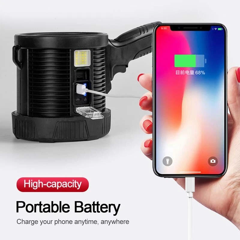 About this item: 1、1000,000 Lumen High Brightness Spotlight - Super bright 1000,000 lumen spotlight flashlight with built-in high brightness LED chip, 10 times brighter than other spotlights, bright and steady light. The strong light sweep is about two soccer fields long and has a range of up to 3,600 feet. Our rechargeable spotlight is perfect for outdoor hunting, hiking, fishing and night work. 2、2 CHARGING MODES - High lumen spotlight with built-in 9600 mAh high capacity ΒATERY, guaranteed to charge over 10,000 times.USB CHARGING TIME: 4-6 hrs. Solar charging time: 10-20 hours. It can also be used as a mobile power to charge your cell phone, very convenient.3 blue indicator lights show the remaining power (25%, 50%, 75%, 100%) . This solar spotlight is a great companion when you are out and about! 3、MAIN LIGHT 3 MODES - The main light of the outdoor spotlight has 3 modes: Front Light (High-Medium-Strobe). Penetrates deep darkness, fog and water. Up to 20 hours of run time. Upgraded LED spotlight emits bright, even lumens of white light that is less visually fatiguing and ideal for close up lighting indoors or in work areas. Side Light 2 Modes - Versatile spotlight with 2 modes of side light: Side Light (High-Low). Up to 30 hours run time. Upgraded handheld soft curved handle for comfort and durability. Bi-directional push-button design is easy to use and makes it an ideal gift for family, friends and the holidays. 4、4 COLOR FILTERS & ADJUSTABLE SHOULDER STRAP - In addition to the standard white light, the main light of the handheld spotlight is equipped with 3 colors of interchangeable lenses (Red-Blue-Yellow) to project different colors to meet the needs of different lighting environments. The included shoulder strap makes it easy to carry the spotlight, freeing up your hands during boating, camping and car maintenance. 5、100% SATISFACTION GUARANTEED - The IPX6 waterproof spotlight flashlight brings great convenience for your outdoor travel, allowing you to work in hot, rainy and snowy weather. It is made of sturdy aluminum alloy and ABS material to protect your searchlight from scratches. We promise to serve every customer seriously. Product Description 1000,000 Lumen Brightest Spotlight Flashlight - Turn Night into Day! WHY CHOOSE OUR RECHARGEABLE FLASHLIGHT? 1. BRIGHTEST SPOTLIGHT - Our rechargeable spotlight uses an upgraded P90 led chip, with higher output lumens, up to 1000,000 lumens. Easily illuminate an entire room or focus on objects within 3600 feet. Long runtime make it a quality lighting tool. 2. BRIGHT 5 MODES - Multifunctional spotlight with 5 modes: (1)Main Light(High - Medium-Strobe) . (2)Side Light(High - Medium) . Can penetrate deep darkness, fog and water. 3. 30H LONG RUNTIME - Our powerful spotlight has a capacity of 9600 mAh ΒATTERY, can provide up to 30 hours or more for outdoor lighting activities. 4. FAST CHARGING & POWER BANK - Our flashlight USB fast charging on 4 hours, Suitable for wall chargers and USB charging ports. It can also be used as a power bank to charge your mobile phone. 5. POWER DISPLAY : Our power display allows you to know the remaining power and when it needs to be charged more accurately, which is very convenient. 6. IPX6 WATERPROOF - The waterproof grade of the our flashlight is IPX6, No problem on rainy days! Great for outdoor camping, hiking, night running, dog walking, boating, fishing, climbing, hunting, including home emergencies, garages, power outages, car repairs. Perfect for treating yourself or giving as a gift. Spotlight Flashlight with 5 Light Modes for Your Choice Main Light 3 Modes - Outdoor Spotlight with Main Light 3 Modes: Front Light (High-Medium-Strobe). Run time up to 20 hours. Can penetrate deep darkness, dense fog and water. Side Light 2 Modes - Handheld Spotlight with Dual Side Lights 2 Modes: Side Light (High-Medium). Run time up to 30 hours. Red & blue strobe light for warning and help call. White/Red/Blue/Yellow - Replaceable Lenses : Powerful LED spotlight with 4 color lenses, with high-medium-flash mode. You can cycle through different lighting modes by installing lenses of different colors to meet your lighting needs. Outdoor Spotlight - Supports USB+ Solar Charging. It Can be Charged with Sunlight! A high-conversion solar panel is installed on the back of the searchlight body. The searchlight can be charged by placing it under the sun during the day. Charging is quick and convenient. Solar charging time: 10-20 hours. It is very suitable for outdoor camping, hiking, mountain climbing, and dog walking. It solves the problem of difficulty in charging outdoors and gives you a full sense of security when outdoors! Our Rechargeable Spotlight with USB Input Port & Output Port Fast Charging in 4 Hours: This flashlight can be charged either with a wall charger at home or outdoors with a USB car charger/mobile power supply. As a Power Bank: The spotlight can also be used as a mobile power source to charge your cell phone or laptop in an emergency. Power Display: Rechargeable spotlight with 4 power indicators for more accurate indication of remaining power (25%, 50%, 75%, 100%). Built-in 9600mAh Large-capacity ΒATTERY : The spotlight flashlight is equipped with a 9600mAh large-capacity ΒATTERY, which can provide up to 20 hours of working time in the main light medium brightness mode and up to 30 hours of working time in the bright light mode. Side light medium mode to keep the light bright. Multi-functional Spotlight, Light up Your Life Work IPX6 Waterproof: The LED spotlight adopts IPX6 waterproof design and can withstand harsh environments such as heavy rain, extreme cold, and high temperature. Powerful Spotlights: Sturdy aluminum alloy + ABS design, with extremely high drop-proof performance, very suitable for home or outdoor use. Adjustable Shoulder Strap: Convenient to use and carry. A must-have for the outdoors! Led Spotlight With 4 Color Lenses to Meet The Lighting Needs of Different Scenes Materia