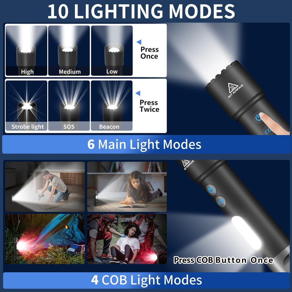【Super Bright & Portable】Our small powerful flashlight is made of high-strength aluminum alloy with super bright LED chip, which can easily illuminate the darkness.Portable hook design, can be put in handbag, backpack or pocket, it is a must-have outdoor camping flashlight. 【10 Modes & Zoomable】Click the button: High-Medium-Low-Mode. Double-click the button to enter: Strobe-SOS-Beacon Mode. Click the COB button: White Light (High / Low)-Red Light-Red Light Flashing. Gently stretch the head of the powerful flashlight switch to narrow beam mode. By adjusting the focus, you are free to choose spotlight or floodlight for longer distance or larger area lighting. 【4 Color Lampshades】The handheld flashlight comes with a 4-color soft light shade, the white shade can be used as a camping light, and the red, blue and green colored lenses can meet your needs in different environments. 【Rechargeable & Power Display】Rechargeable flashlight with built-in 3000mAh rechargeable battery that lasts for 4-20 hours. LED high lumen flashlights with fast charging Type-C port, fully charged in just 3 hours. When the battery is low, the indicator light on the switch will turn red, please charge it in time. 【Waterproof & Lightweight】Built-in high-strength sealing rubber, the outdoor flashlight reaches IP65 waterproof, the tactical flashlight can be used in heavy rain, snow and other harsh weather conditions.The flashlight is small in size and lightweight, so you can carry it around with you, put it in your pocket or backpack, and quickly pick it up when you need it. 【Perfect Gift & Quality Service】Our super bright flash lights are the ideal gift for family or friends. If you encounter any issues with the flashlight not charging or experience other quality-related problems during use, please contact our customer service support team immediately and provide unconditional returns and exchanges.