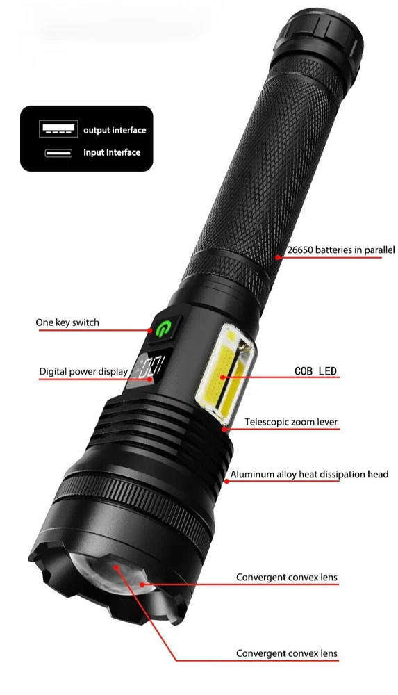 Telescopic Zoom USB Rechargeable Tactical Flashlight, 1000+ Lumens, IP65, LED Alright, folks—if you're still fumbling around in the dark with those dollar-store flashlights, it's time to step into the big leagues with the Aeternam FL124 Tactical Flashlight . This bad boy isn’t just bright; it’s so blindingly powerful it might double as a signal to low-flying aircraft. Here’s what you’re working with: Battery Type: 26650 x 2 (parallel connection)—translation: it’s got stamina. Rechargeable USB Power: No more hunting for AA batteries in the junk drawer. Material: Aluminum alloy—because plastic is for toys. IP65 Rating: Dust? Rain? Bring it on. This thing laughs in the face of "weather." Lumens: Over 1000 of 'em. Enough light to find your keys—or a lost dog—in the dead of night. Zoomable Lens: Spot that raccoon in the tree or light up your whole backyard. You choose. Adjustable Brightness: Go from “subtle glow” to “blazing spotlight” in seconds. Run Time: Over 12 hours on a charge. That’s half a day of tactical awesomeness. Lifespan: 4,000 hours. That's a lot of camping trips or power outages. Weight: Lightweight at just 0.79 lbs—perfect for when you’re on the move. With a 6000K Daylight Alert beam , this flashlight doesn’t just light up the room; it makes the sun jealous. Plus, it’s backed by a 1-year warranty , because even the toughest tools deserve a safety net. Stop settling for flashlights that might as well be tea candles. Whether you’re camping, prepping for emergencies, or just want to look cool in the driveway, the Aeternam FL124 has you covered. Remember, stay sharp, stay ready, shoot straight!