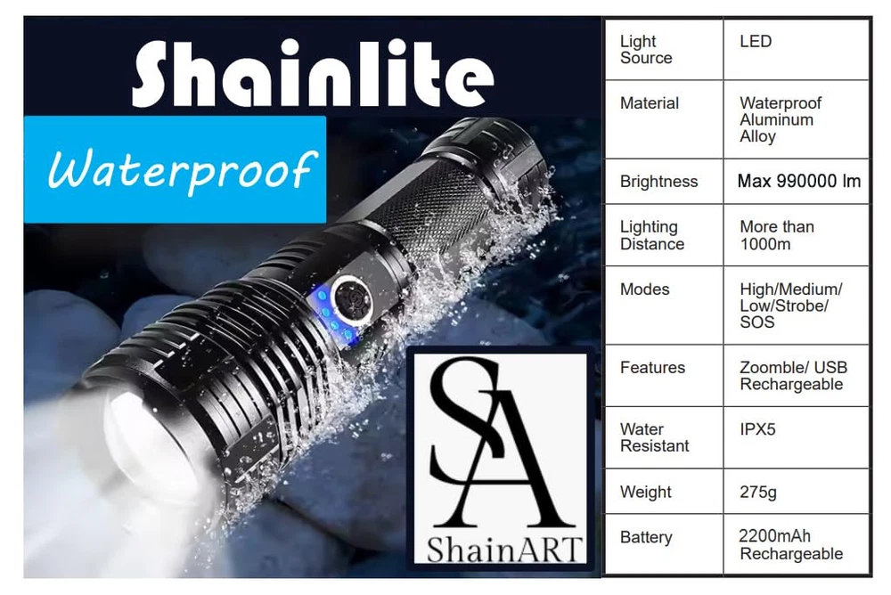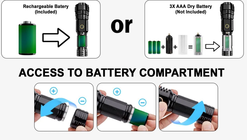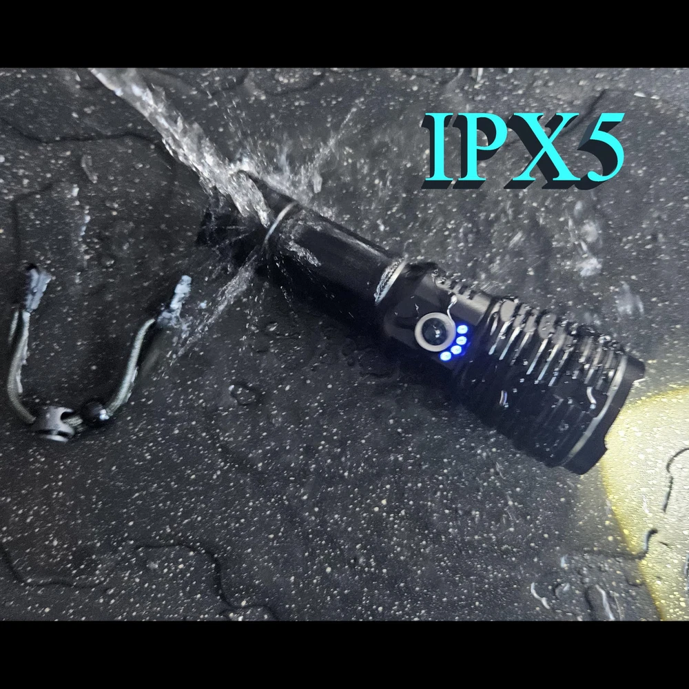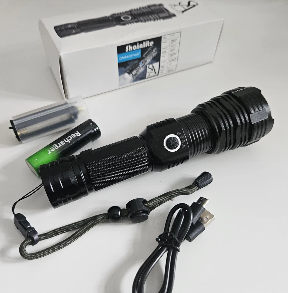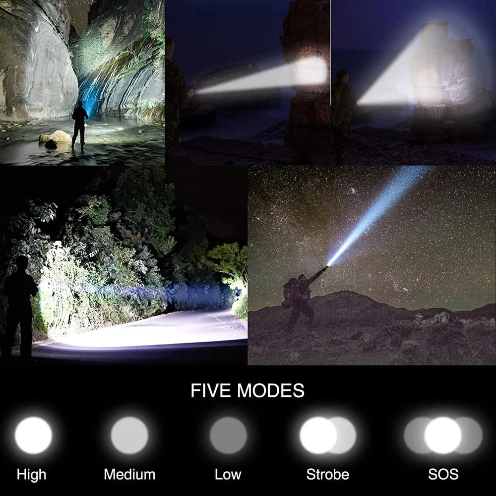 Powerful Illumination: Boasting an impressive real and tested upto 990000 lumens, this tactical flashlight delivers an exceptionally bright beam for optimal visibility. Multi-Mode Operation: With 5 adjustable modes, you can customize the light output to suit your needs, from a focused spotlight to a wide floodlight. Rechargeable Convenience: This flashlight features a rechargeable battery, eliminating the need for frequent battery replacements. with rechareable battery included in the item package. Durable and Waterproof: Constructed with high-quality materials, this flashlight is waterproof and built to withstand harsh conditions. Versatile Applications: Ideal for emergencies, camping, hiking, and various outdoor activities, this handheld flashlight ensures reliable illumination when you need it most. USB/USB-C cable for charging the flashlight to charge the rechareable battery and AAA Battery holder to use AAA battery if needed.