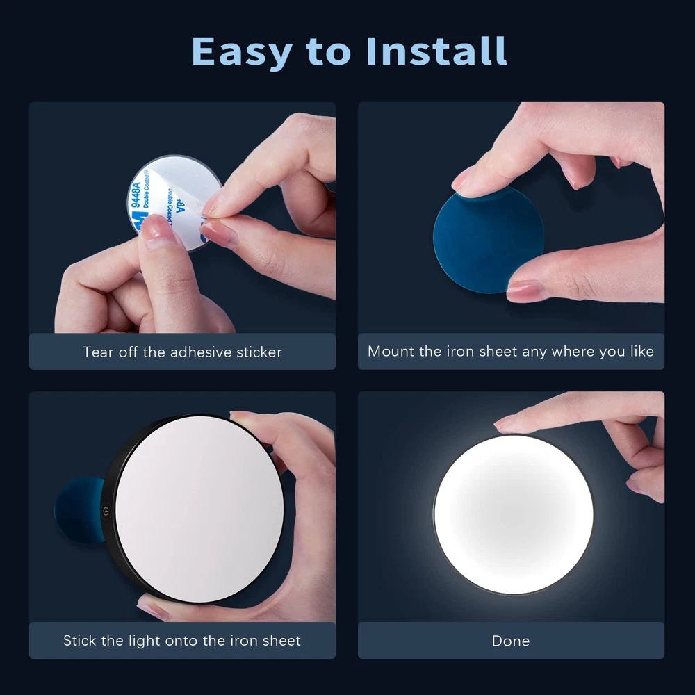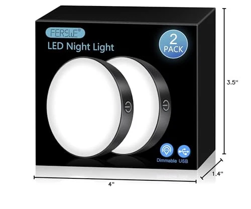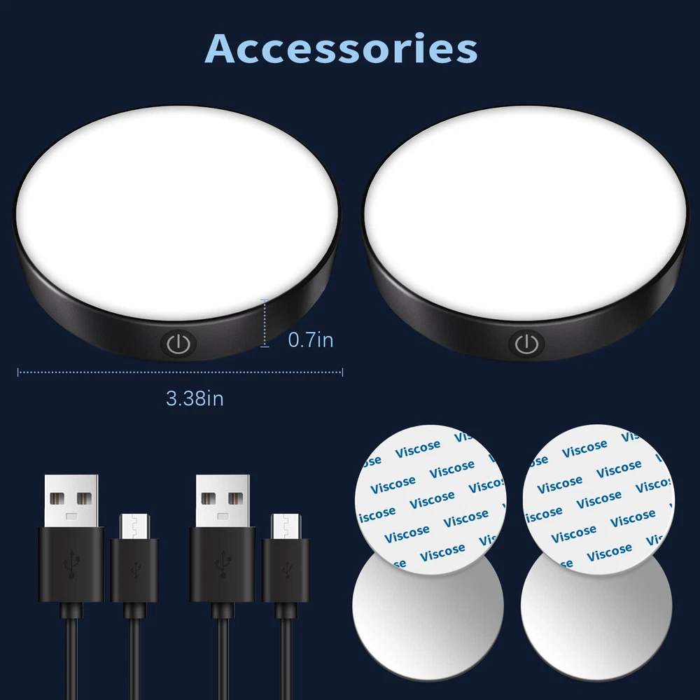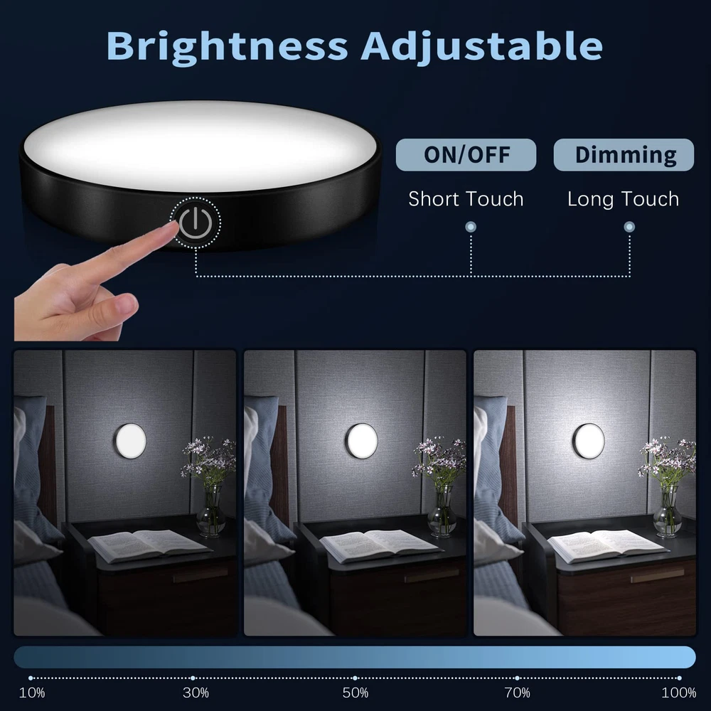 [Dimmable & Brightness Memory] - sensitive button to control, long touch to adjust brightness, short touch to turn on/off. The touch light can remember the last brightness level you set, so you don't have to reset it every time. [USB Rechargeable & Energy Saving] - The rechargeable tap light use USB charging and built-in 1000mAh large battery. The stick on lights can last a maximum of 120 hours in the darkest mode and 6 hours in the brightest mode when fully charged. [Comfortable Eye Care Lighting] - The led night light uses a milky cover, it emits a comfortable warm white light that protects your eyes and makes you relax. [Easy to Install & Portable]- The closet light built-in magnet on the back, you can stick on any metal surface directly.And you can use the upgrade adhesive tape to stick on any non-metal surface. The size of the stick on light is only 18*dia86mm, you could easily stick on the bedroom, bathroom, kitchen, hallway and closet. [Free ] - We offer 24-hour service, just us if you have any problem. Note-Please charge the LED night light before first use.