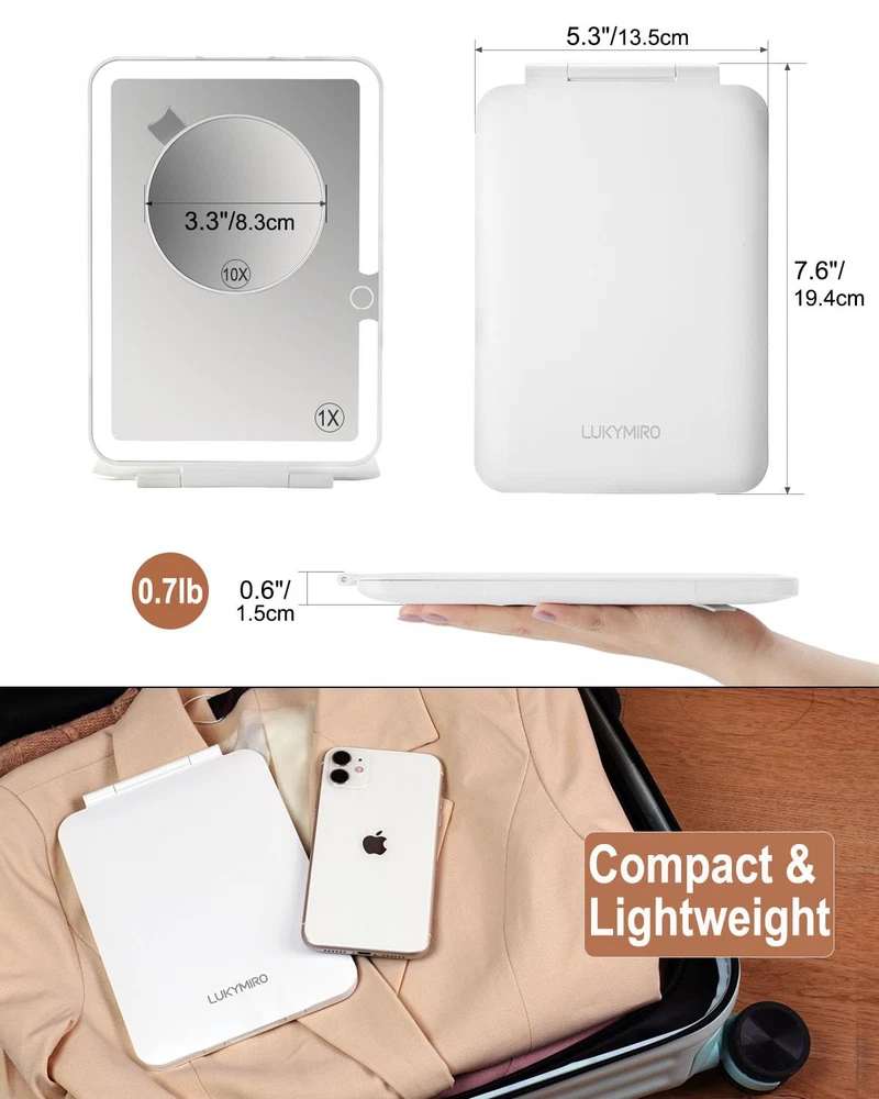 A 3-inch 10X Magnifying Mirror for Close-up: This lighted mirror is a regular mirror, coming with a 10x magnifying mini round mirror that clicks magnetically to the center, helping you with close-up tasks like tweezing eyebrows or applying liquid eyeliner or mascara coat. However, the round 10X zoom mirror blocks a big portion of the lighted mirror, so using it separately instead of always tacking it onto the glass is highly recommended. It can be hidden on the mirror back while not used. Super Bright Desk Mirror: Even illumination with 70 LEDs, the lighted vanity mirror softly illuminates every part of your face equally. With 3 color lights to pick from, a warm white light is best for applying makeup for a night out; a bright daylight setting for makeup for outdoor activities; and a cool light for a day spent in an office or classroom. This lighted beauty mirror will allow you to toggle between light temperatures to suit a variety of looks and situations. Book-Size Mirror Perfect Lightweight Travel Lighted Mirror: The mirror itself is only 0.7 pounds, 5.3 inches by 7.6 inches in width and height, and less than an inch thick, making it easy to packed in a bag or store in a luggage. Sufficient for makeup application and touch-ups for commute and 2-3 day business trip. The lighted makeup mirror is bright enough for daily use on vanity while it only takes up a small space. Rechargeable Lighted Compact Mirror: The mini LED mirror is rechargeable with 1000 mAh battery, you can use it cordlessly. If you need something for on-the-go use, this lighted travel mirror is highly recommended. You don't have to struggle with lighting but honestly it did help makeup application much more then a hotel mirror. USB-C cable is included, charger is not. The lid of the lighted makeup mirror works as a stand while used as a light-up tabletop mirror, and doesn't wobble when placed on a flat surface. You can use it as a compact travel makeup mirror with lights as well.