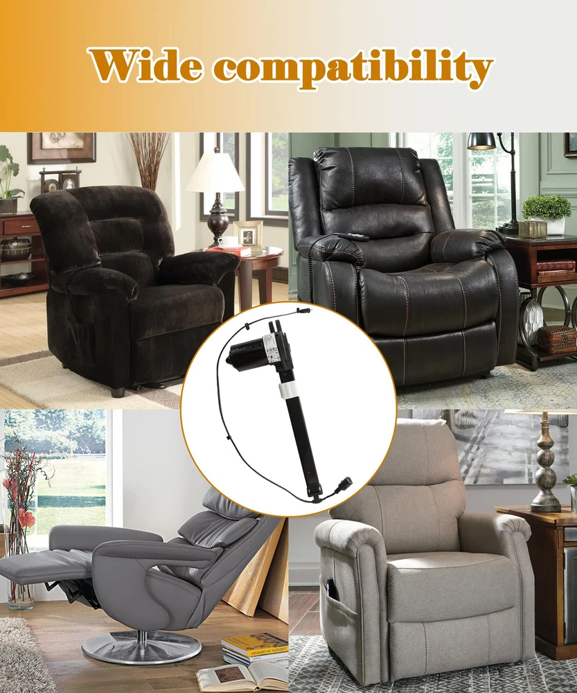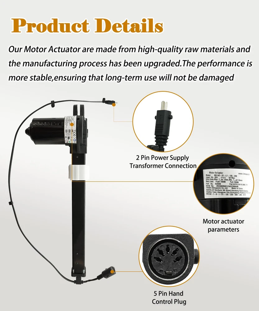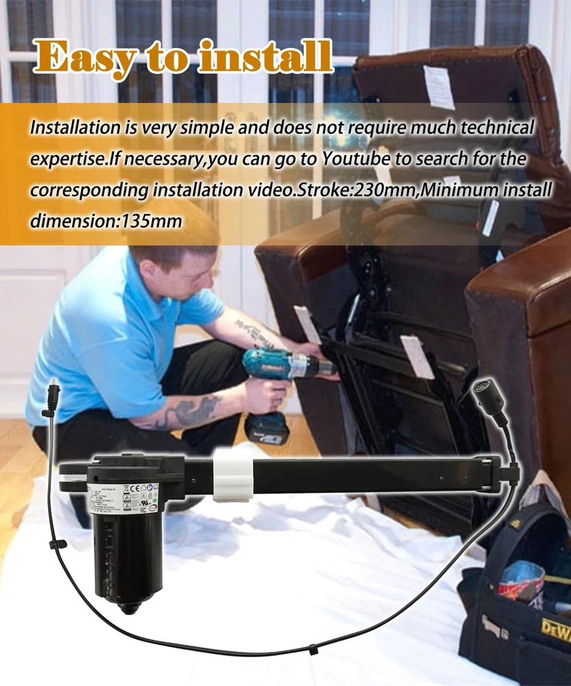Package Contents:You will get 1*Power Recliner Lift Chairs Motor Actuator Replacement,Model MD142-31-L1-135-230,Part Number 452599,made by Limoss.2 Pin Power Supply Transformer Connection,5 Pin Hand Control Plug Connection Compatibility:This Motor Actuator is compatible with electric sofa massage chair etc,replaces Limoss Motor Model MD142-31-L1-135-230.Please confirm your motor label before placing an order,if the parameters are different or the model is different,it cannot be replaced Excellent quality:Our Motor Actuator are made from high-quality raw materials and the manufacturing process has been upgraded.The performance is more stable,ensuring that long-term use will not be damaged Easy to install:Installation is very simple and does not require much technical expertise.If necessary,you can go to Youtube to search for the corresponding installation video.Stroke:230mm,Minimum install dimension:135mm Quality Service:1 year manufacturer's warranty and 30-Day No Hassle Money Back,If you have any question please feel free to contact us.provides you with the most satisfactory service